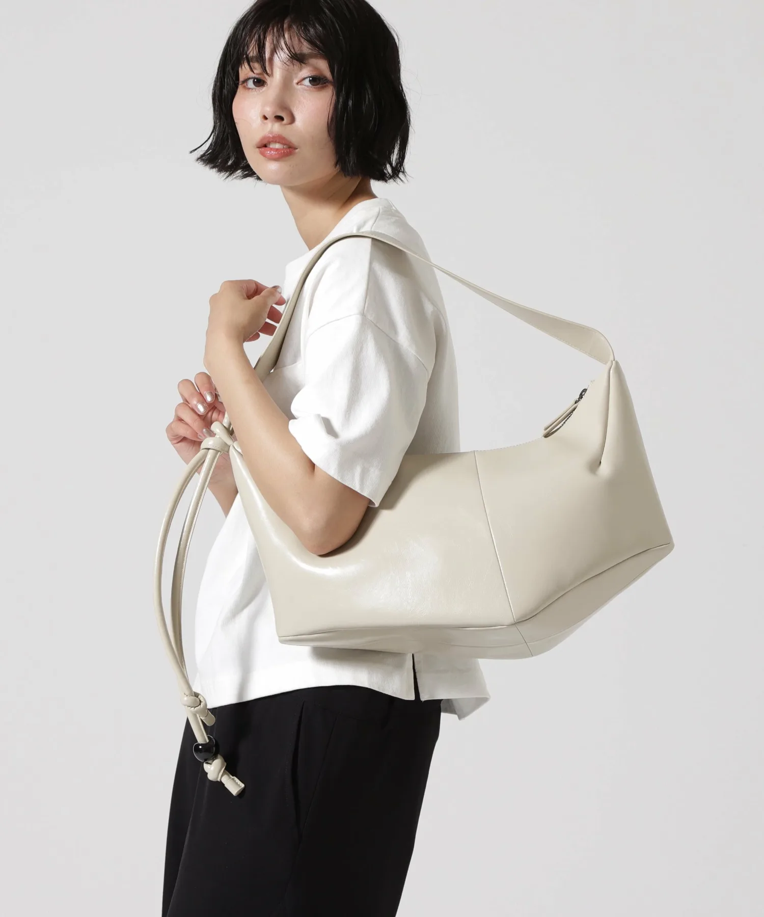 Естественно складывающаяся сумка через плечо с привлекательной, несимметричной формой.