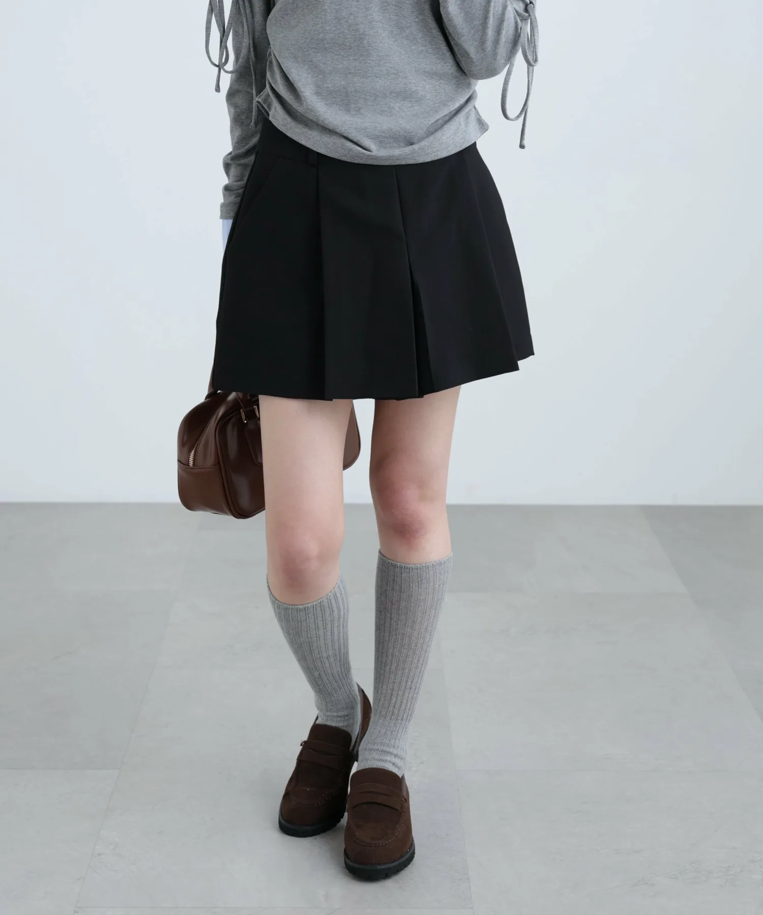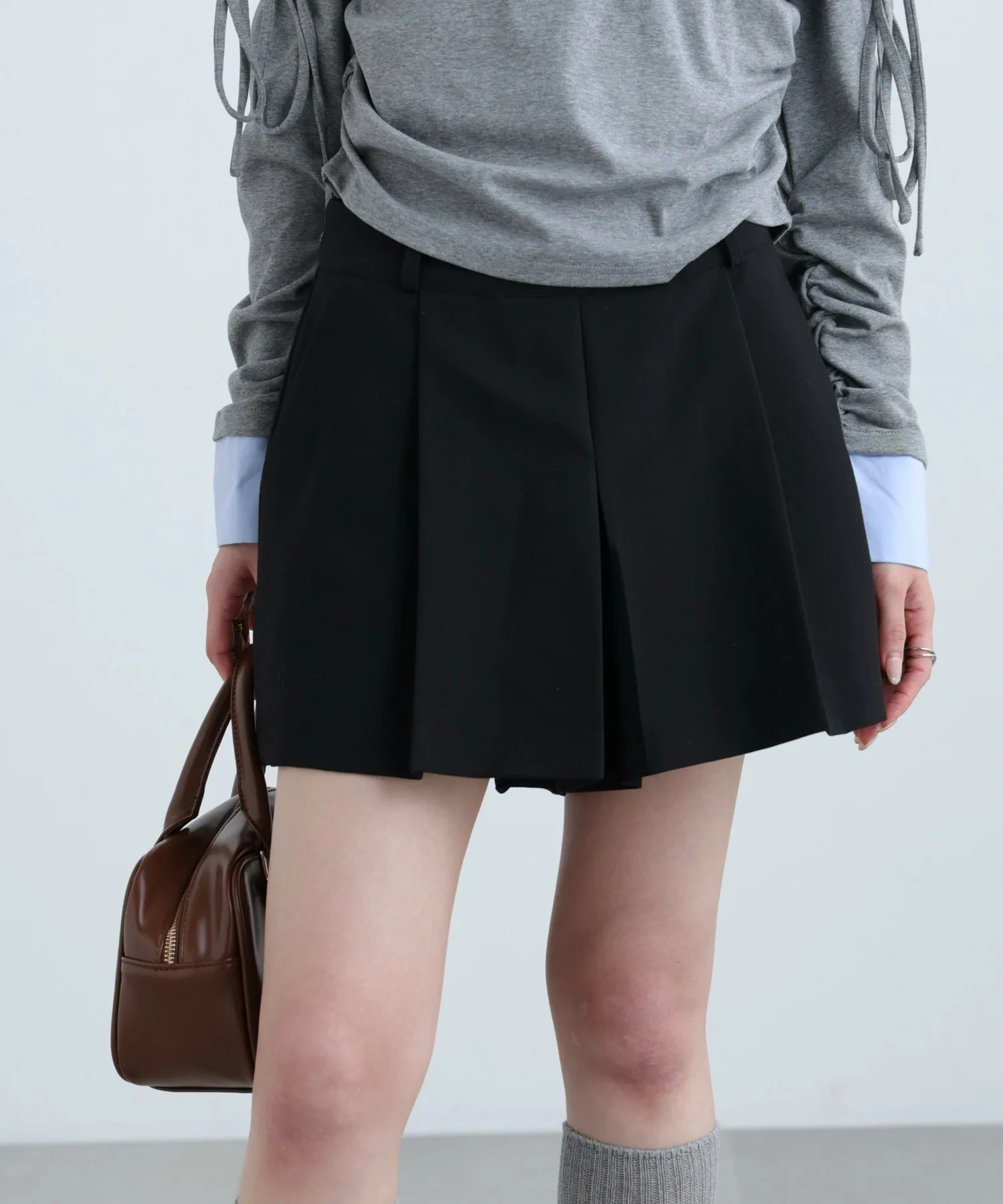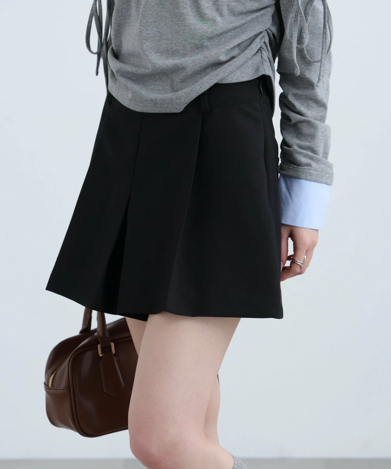 Шорты из ткани средней плотности с двойным перекрещивающимся плетением, создающие впечатление юбки. Глубокие, большие складки спереди придают им вид юбки, а сзади – аккуратный, короткий крой. Простой дизайн без украшений позволяет легко сочетать их с широким спектром вещей. Несмотря на то, что длина немного короче, штанины обеспечивают комфорт при ношении. Также можно носить как нижний слой под мини-платье или тунику.