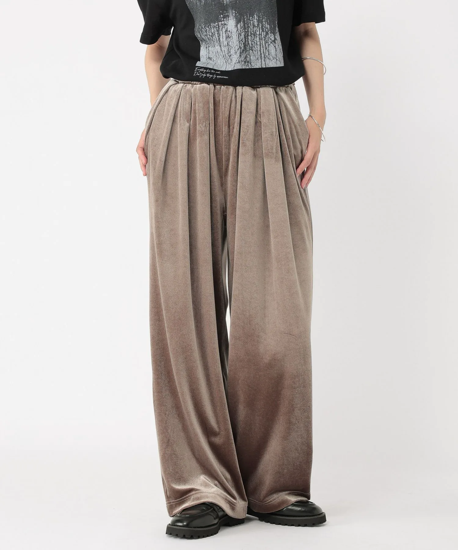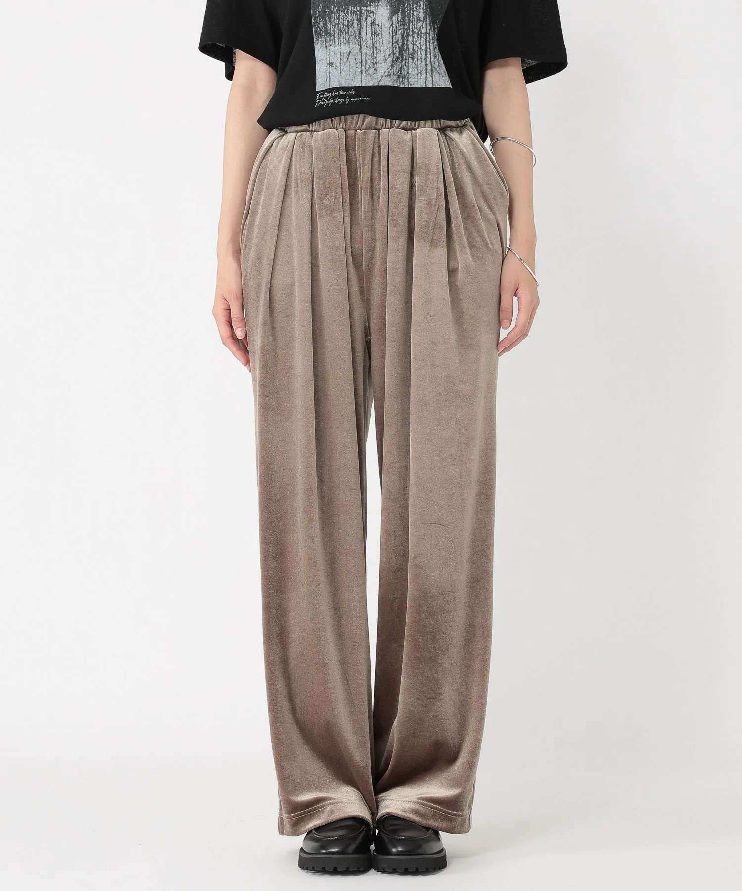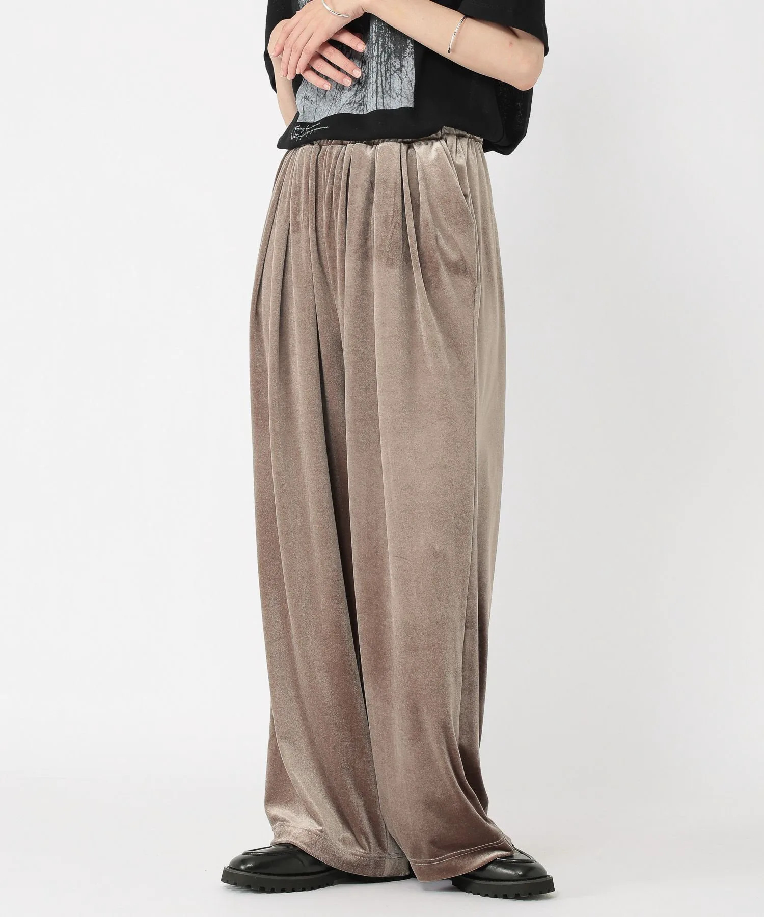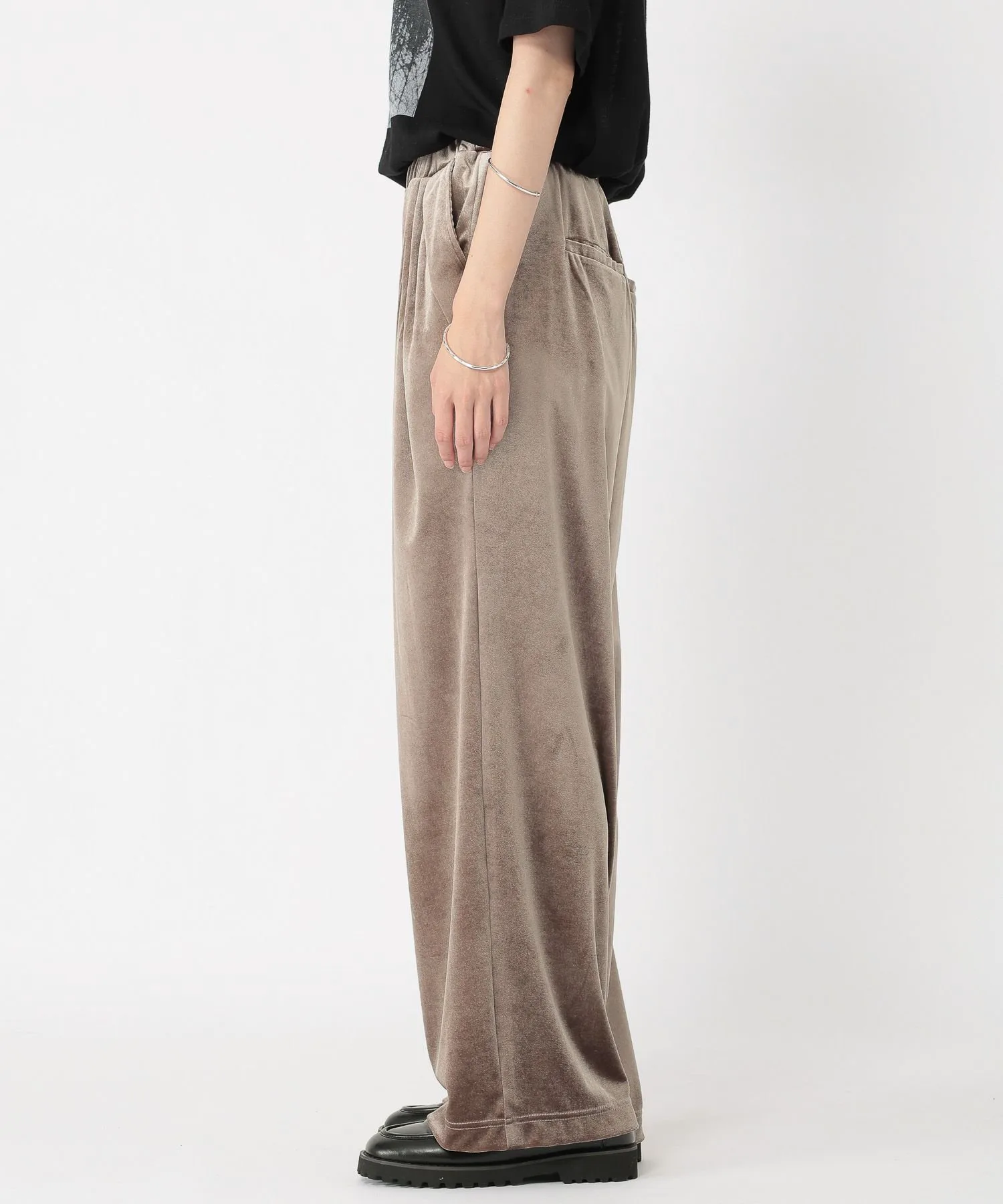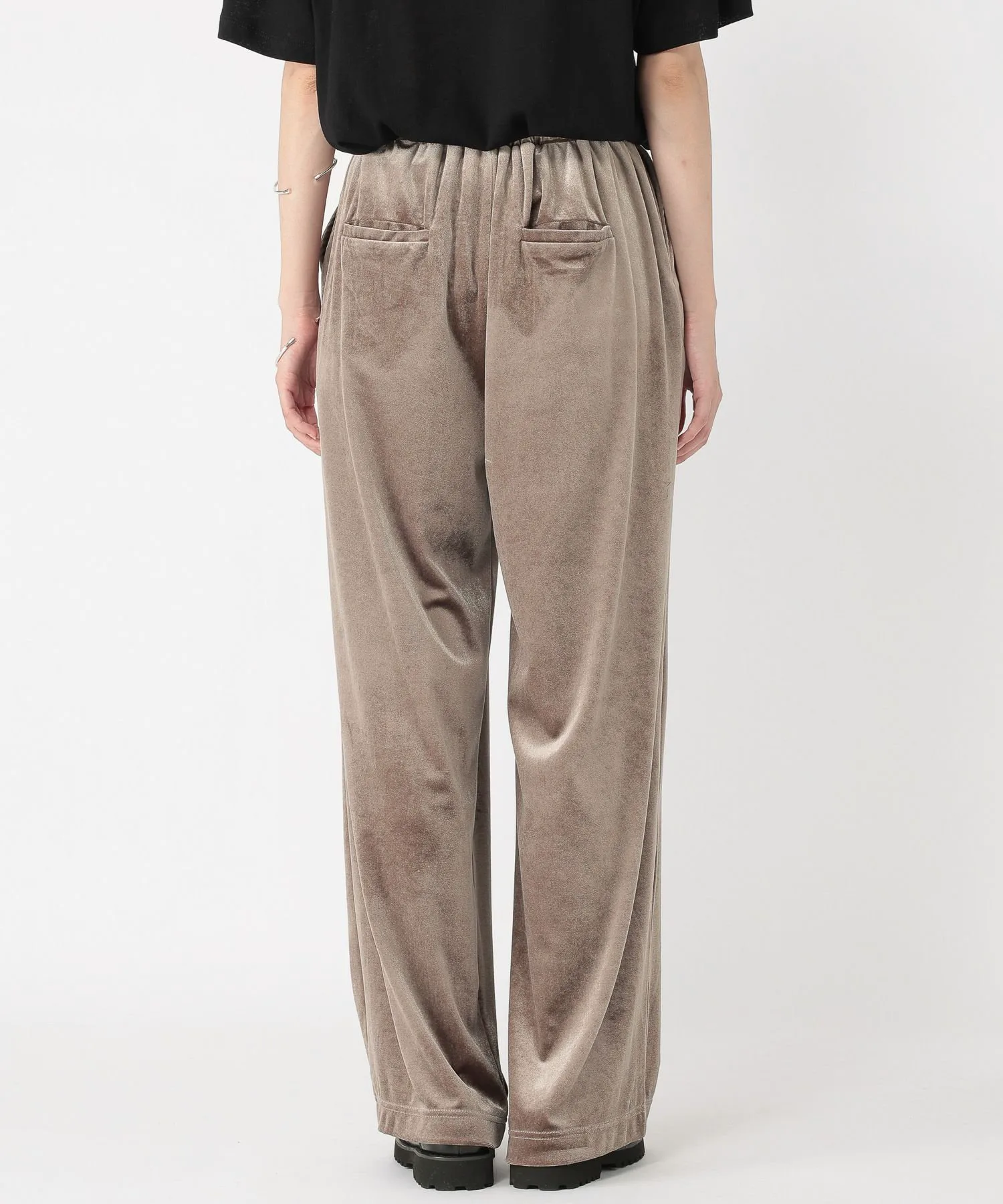 Эти велюровые брюки имеют блеск и драпировку, которые подчеркивают сезонное настроение.