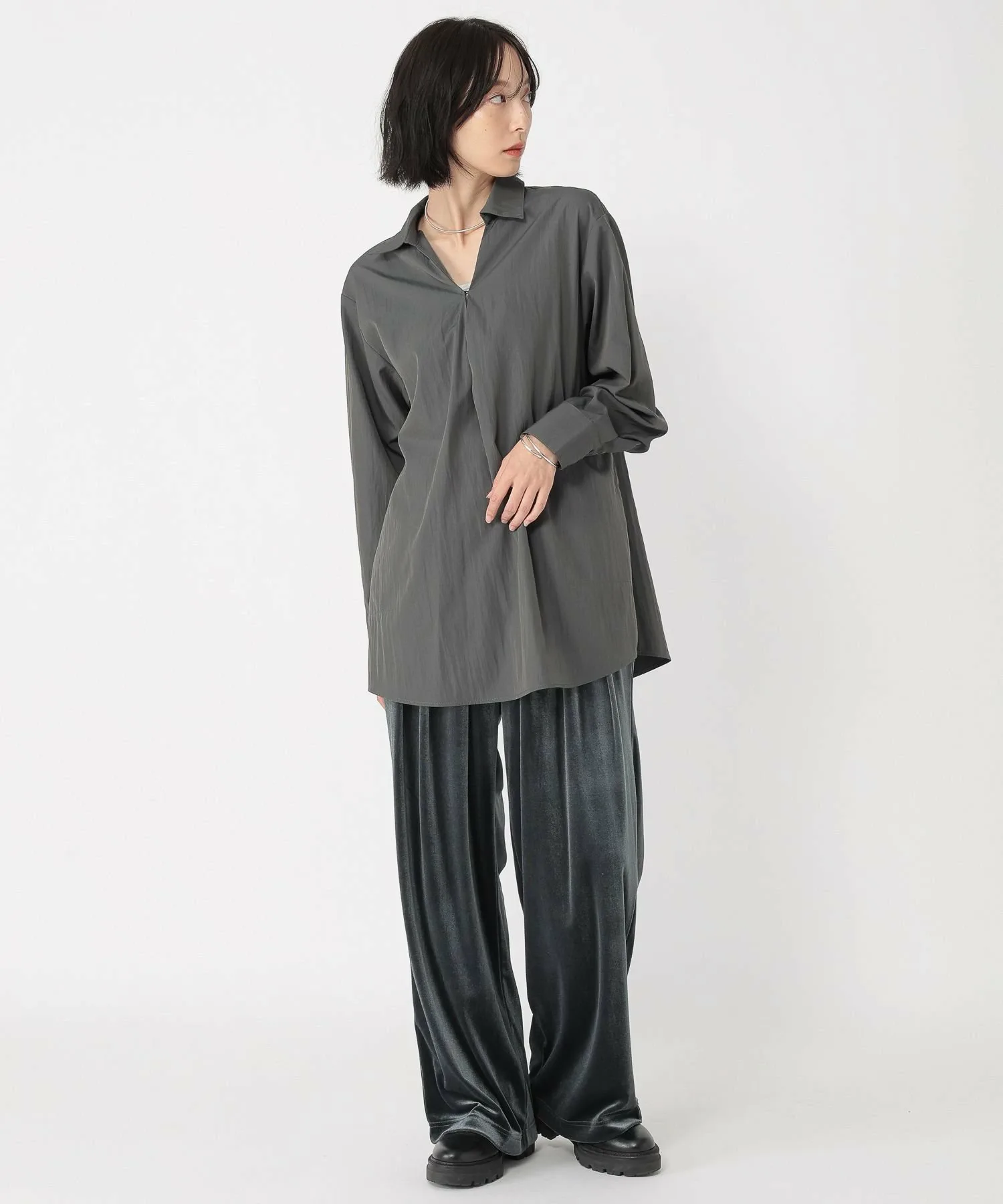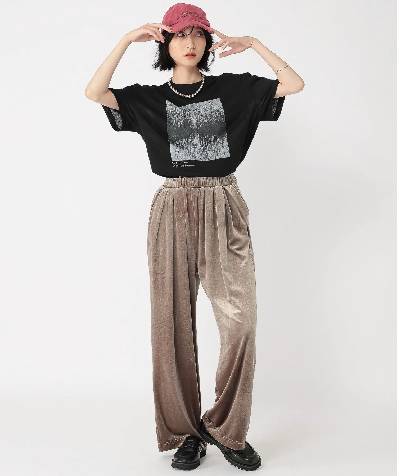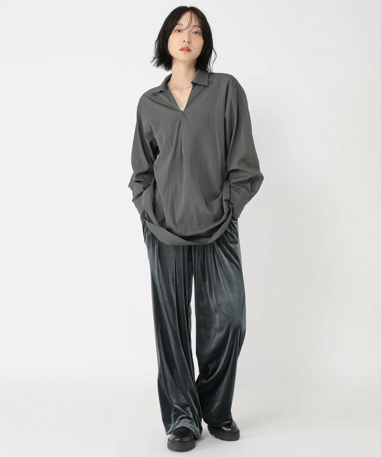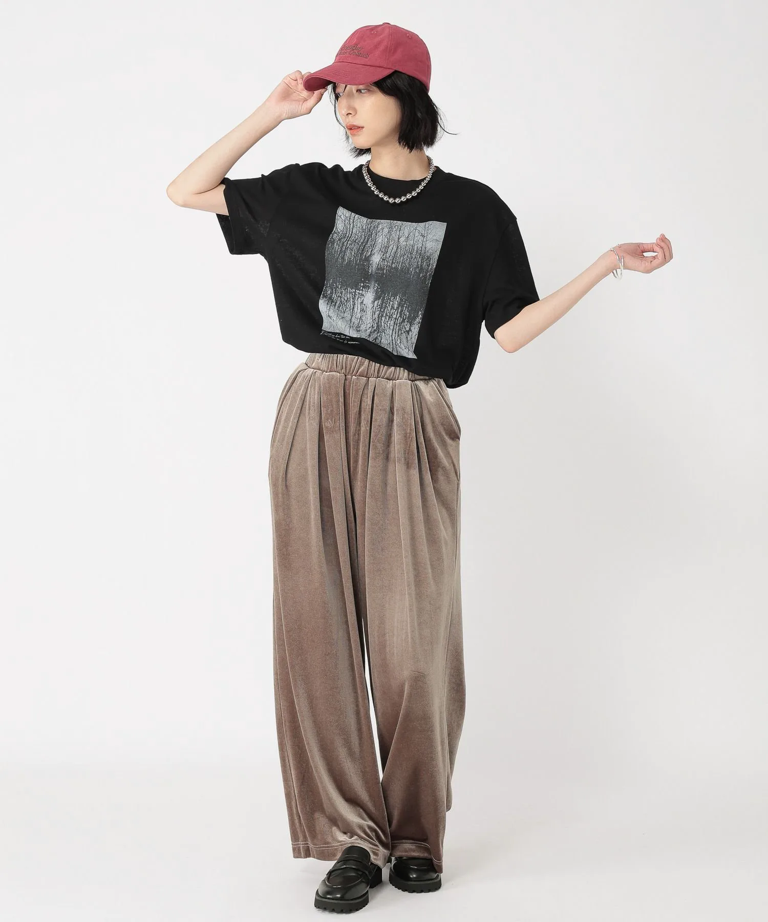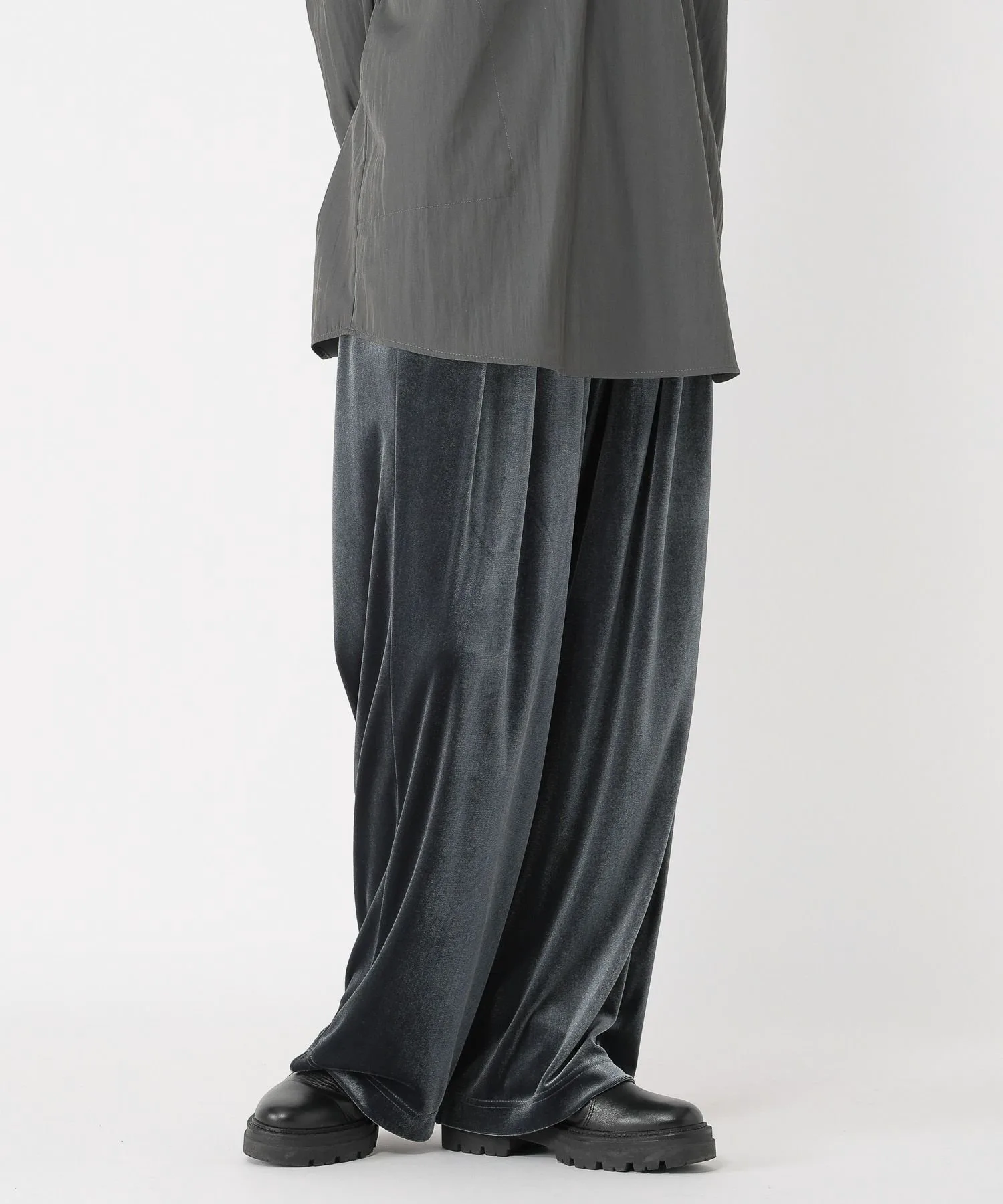 Эти велюровые брюки имеют блеск и драпировку, которые подчеркивают сезонное настроение.