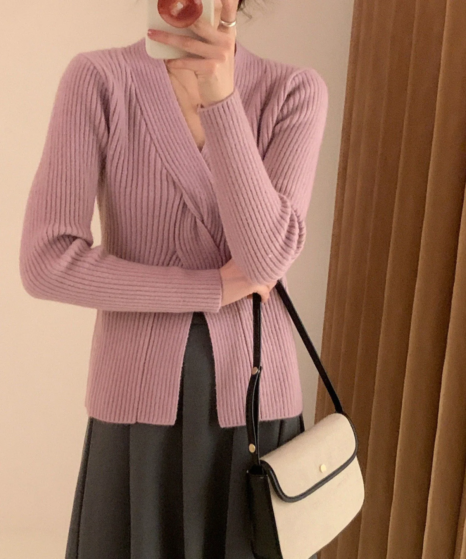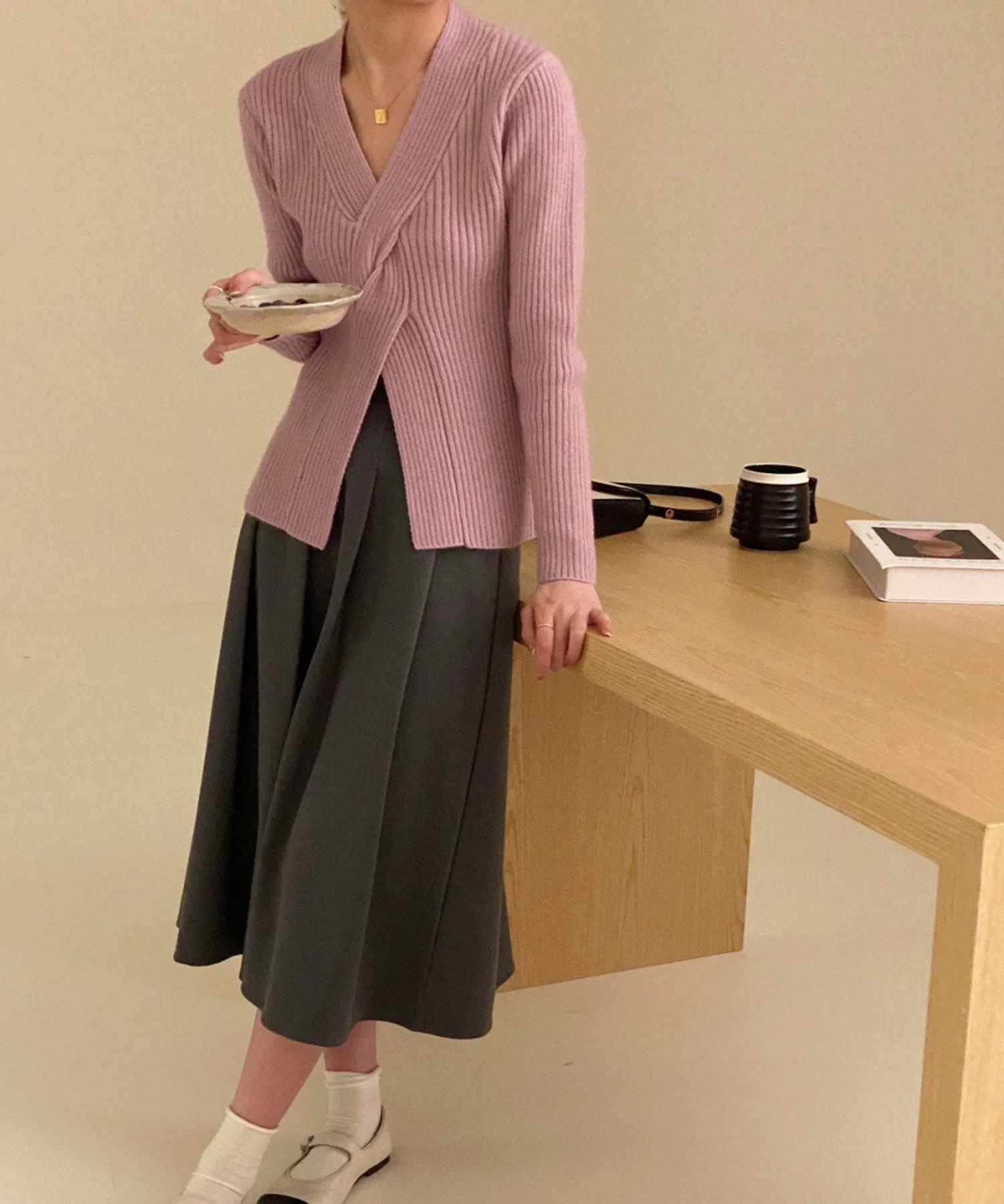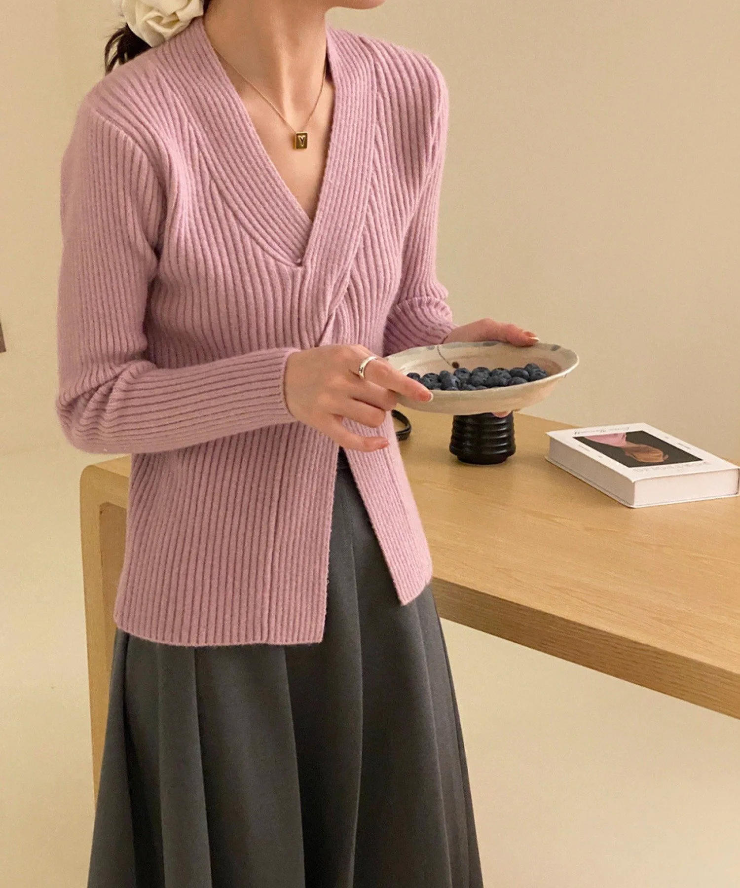 V-образный вырез подчеркивает линию декольте, а аксессуары, такие как ожерелья, смотрятся великолепно.