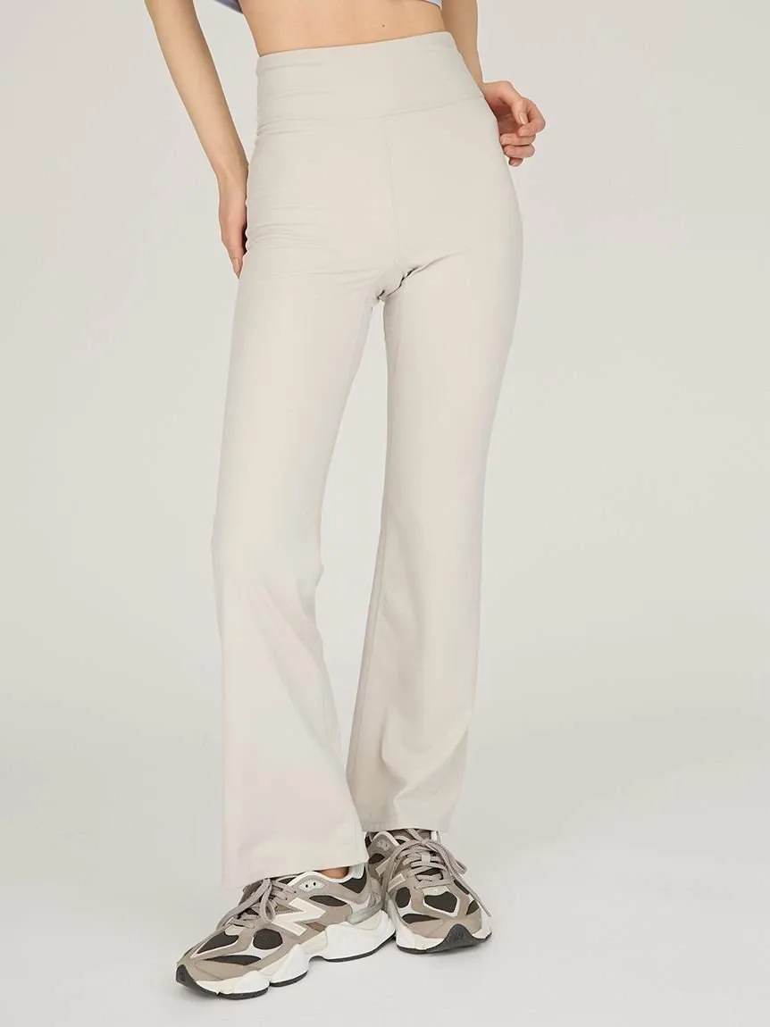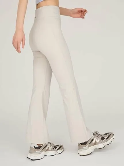 Высокая талия обеспечивает надежную фиксацию, визуально удлиняя ноги. Удобная посадка от бедер до колен, расклешенный силуэт внизу подчеркивает женственность.