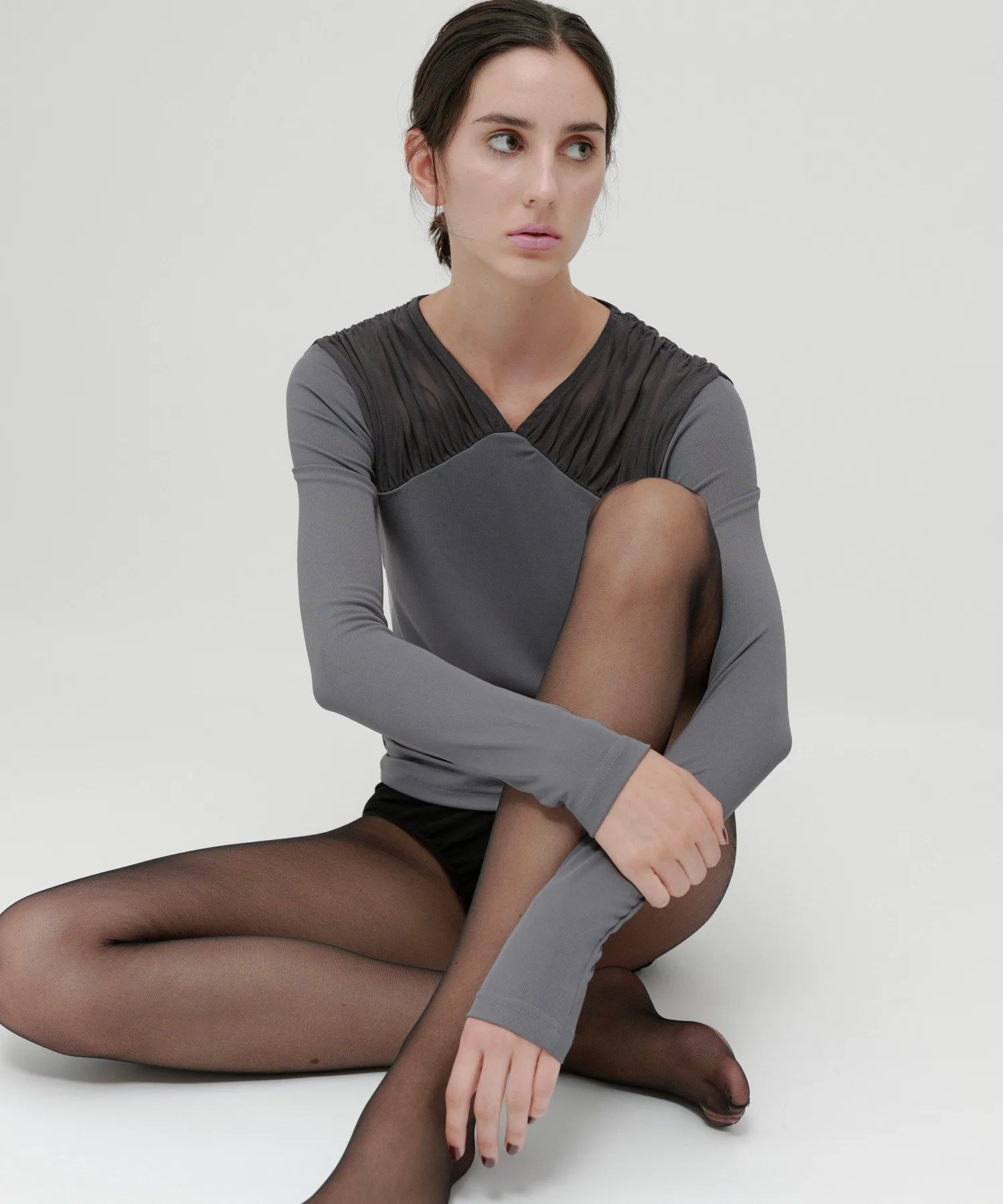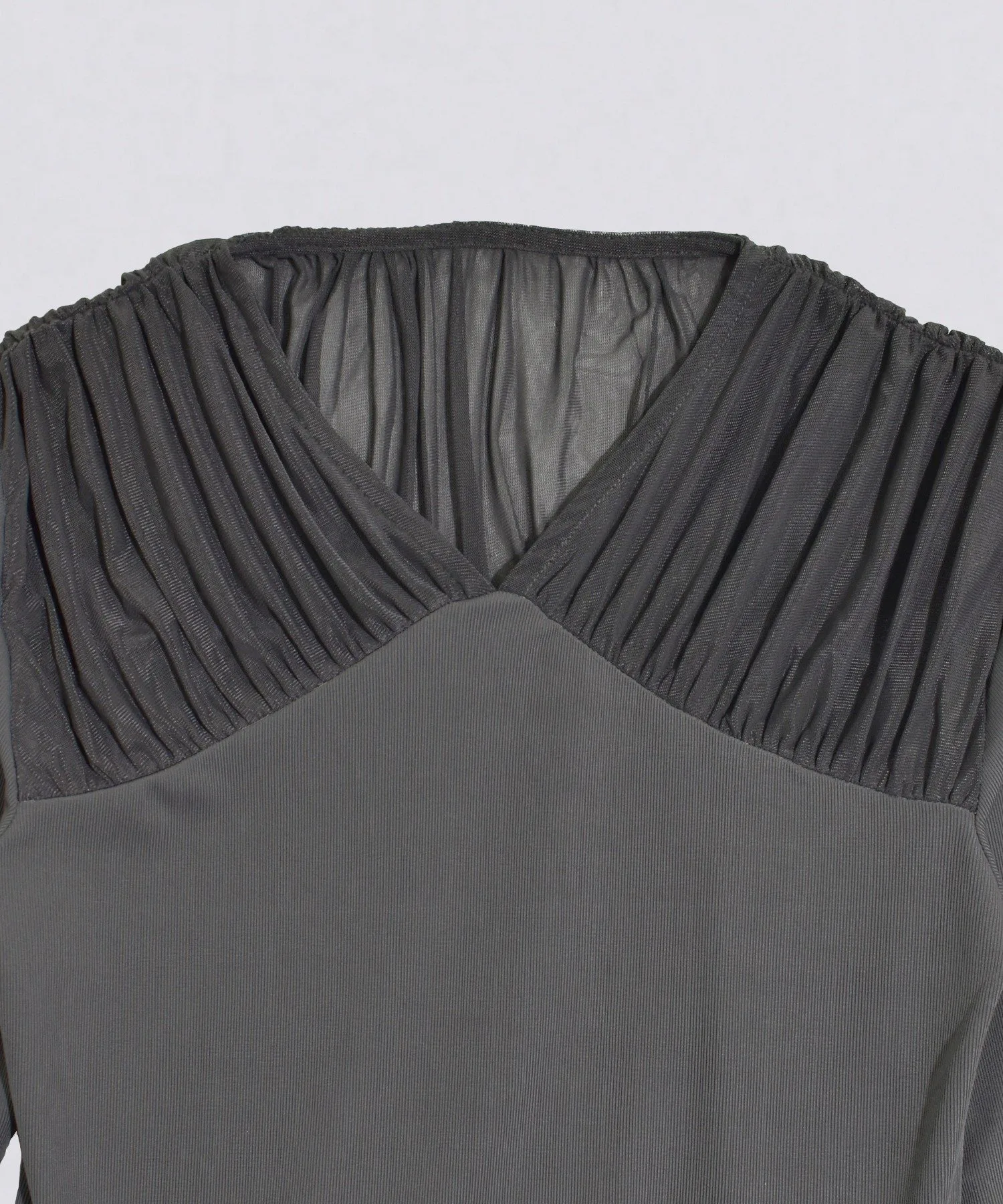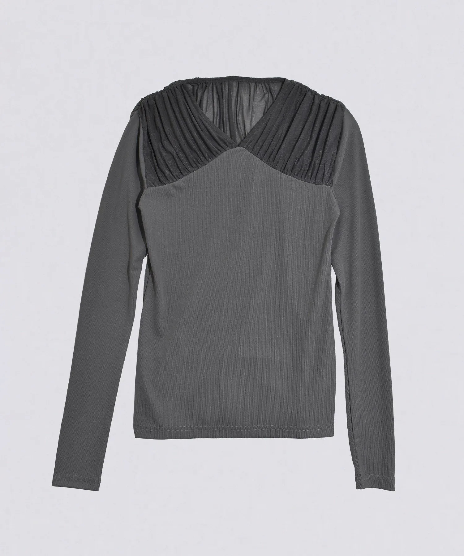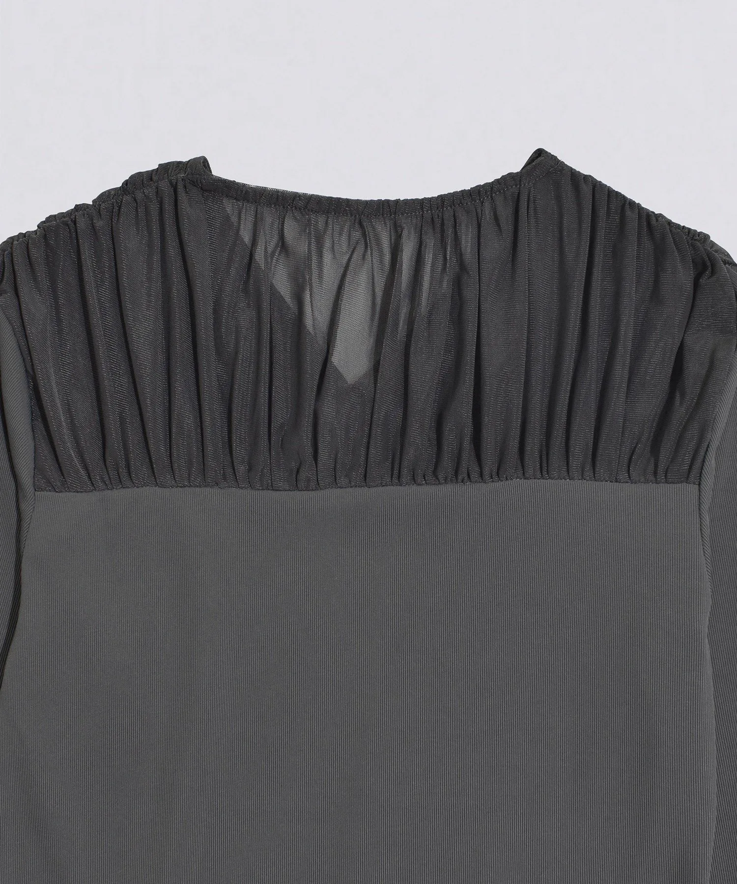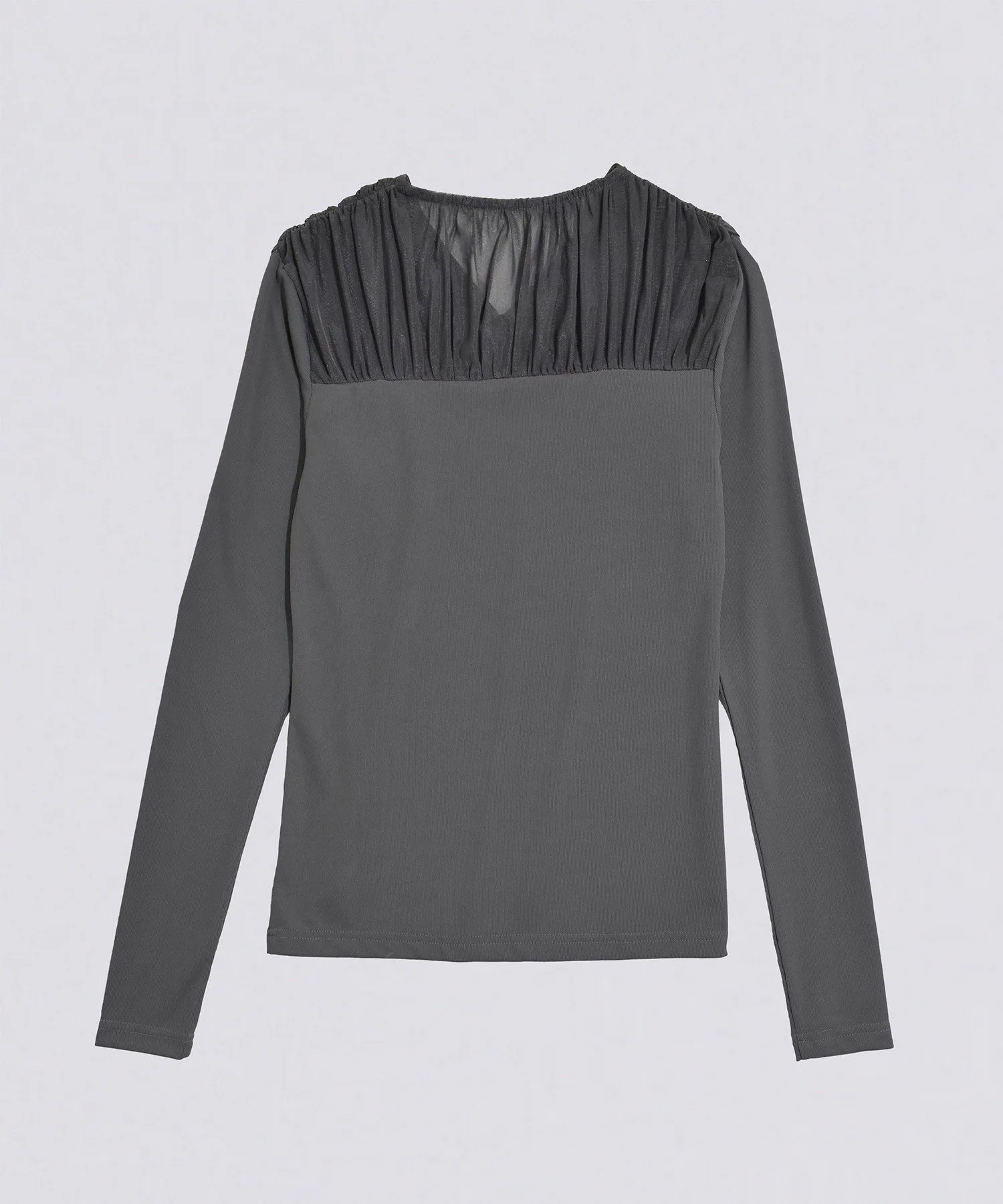 Этот сшитый вручную топ отличается эффектной присборенной кокеткой из тюля.Прозрачность кокетки и мягкое движение тюля добавляют нюансов лицу и выгодно подчеркивают декольте.Силуэт, который плотно облегает фигуру, не слишком прижимаясь к ней.Топ сшитый вручную из гладкого ребристого материала, приятного на ощупь.Тонкая резинка уменьшает ощущение небрежности и добавляет элегантности.Несмотря на простой и однотонный цвет, этот дизайн подчеркнет любой наряд, даже в сочетании с минималистичной юбкой или брюками.Доступен в трех цветах: универсальный черный, женственный цвет слоновой кости и серый, сочетающий в себе нежность и элегантность.