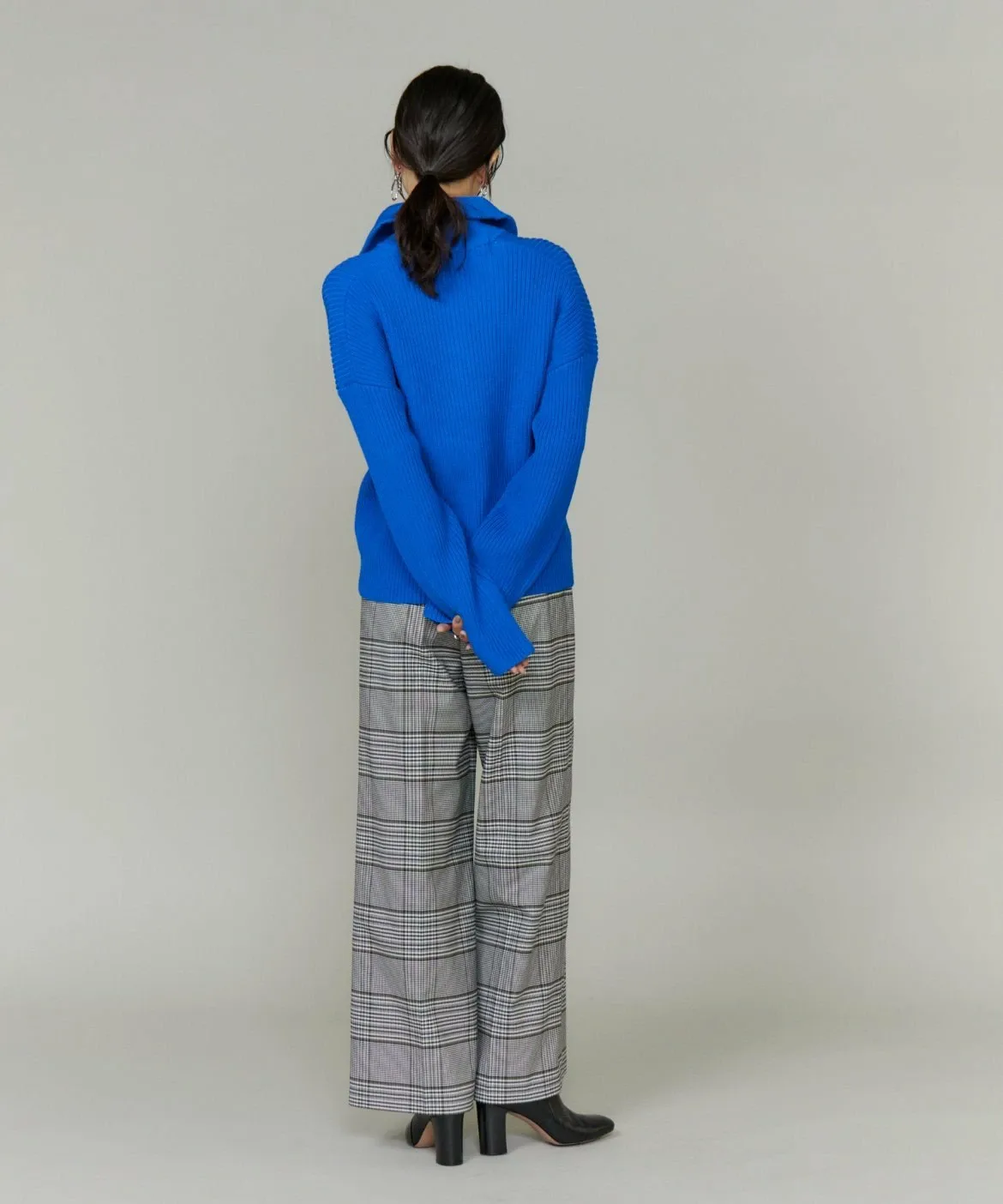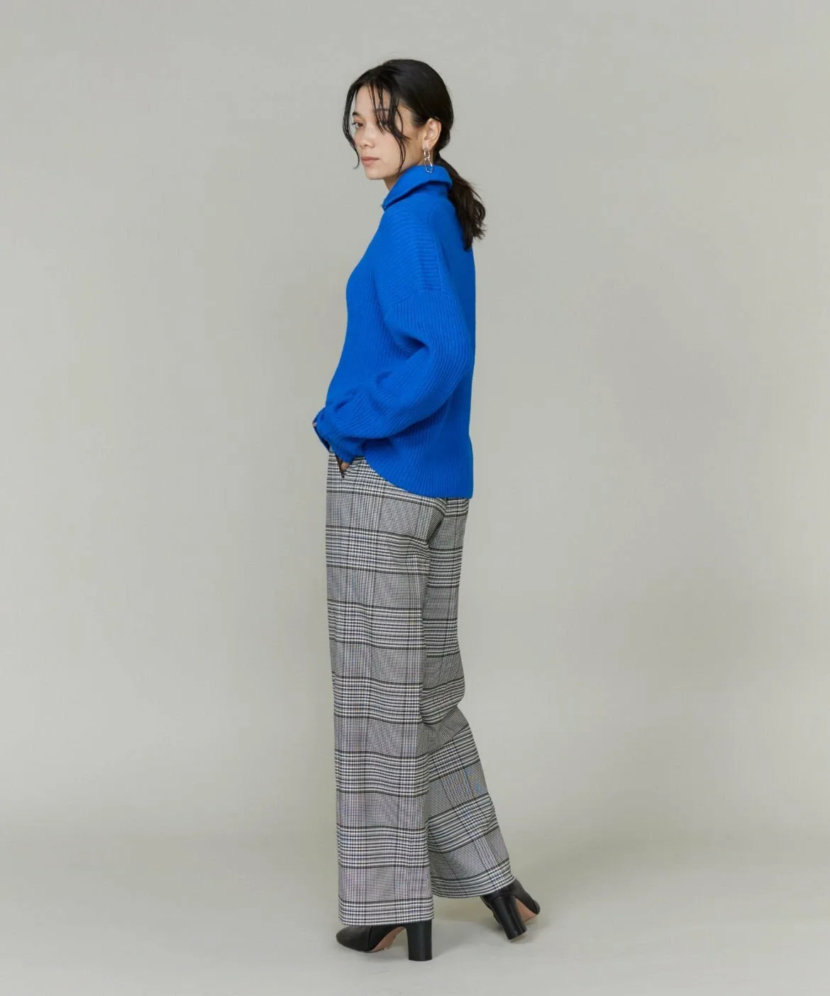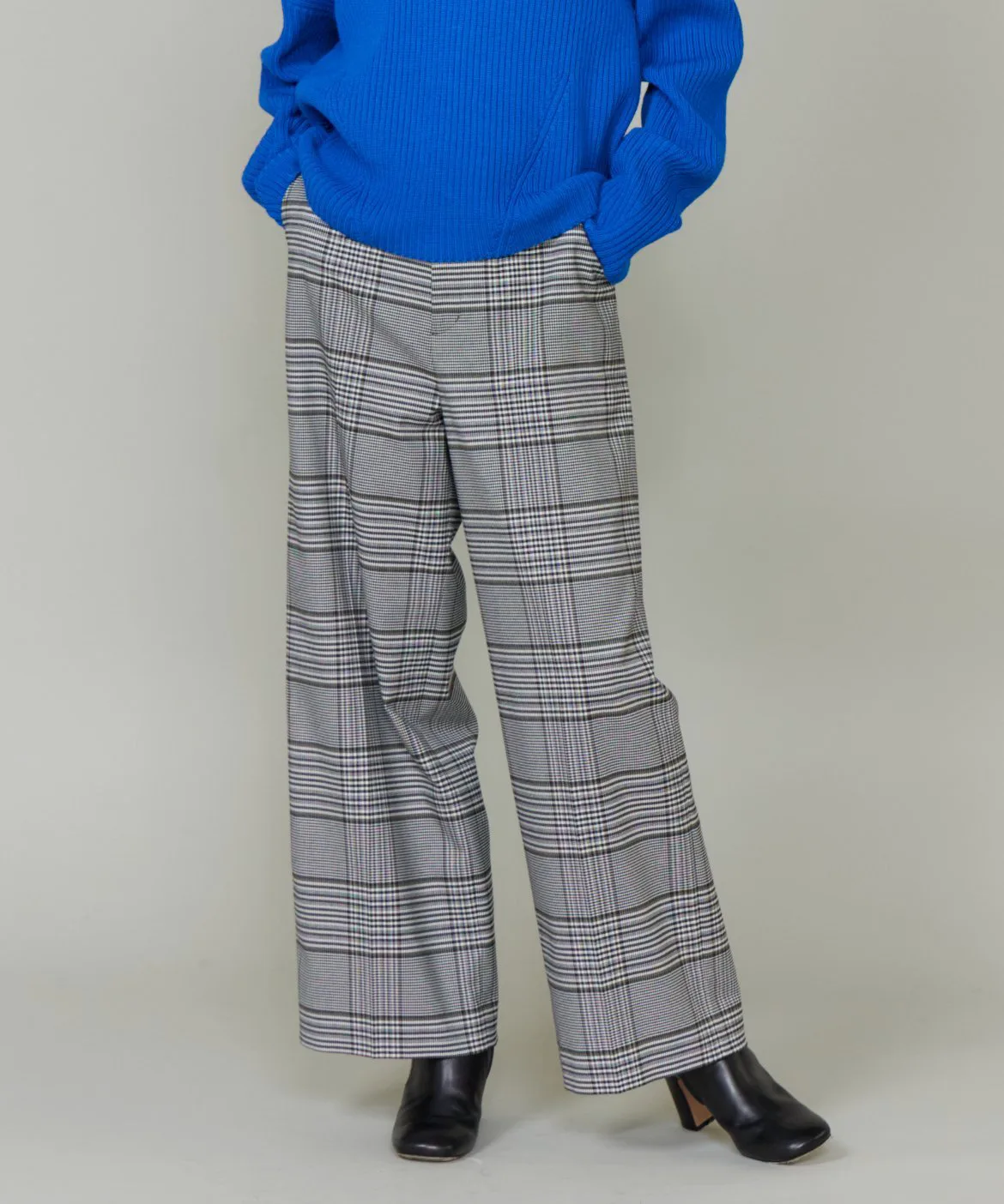 Основа выполнена из камвольной пряжи, смеси полиэстера и шерсти Toray Lumilet. Уток представляет собой смесь полиэстера и вискозы с добавлением эластичных волокон для комфортной посадки. Клетчатый узор — оригинальный дизайн.