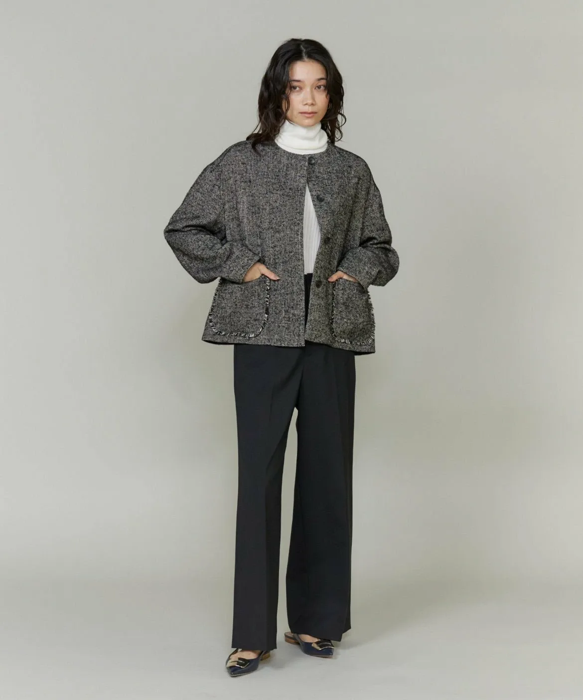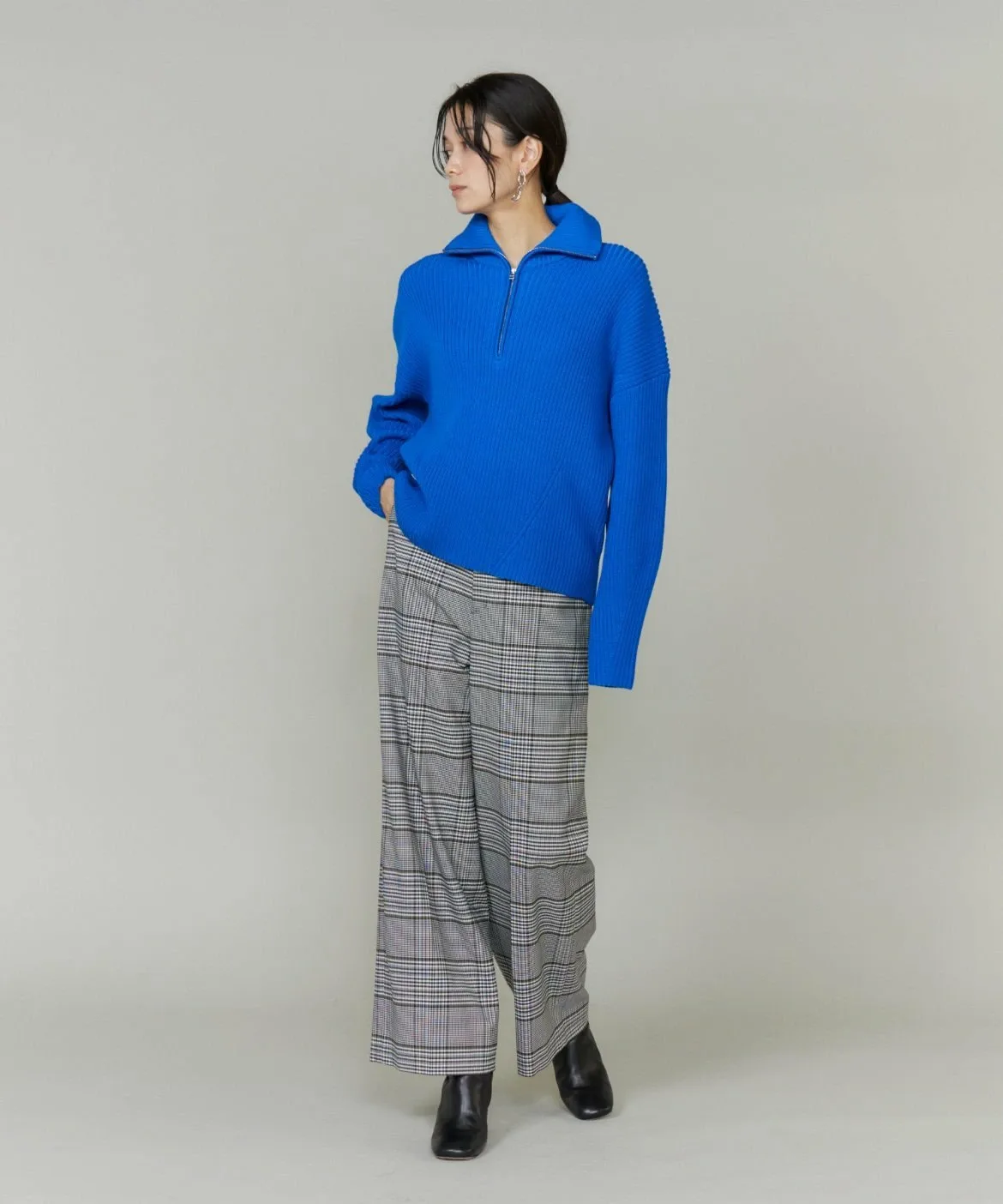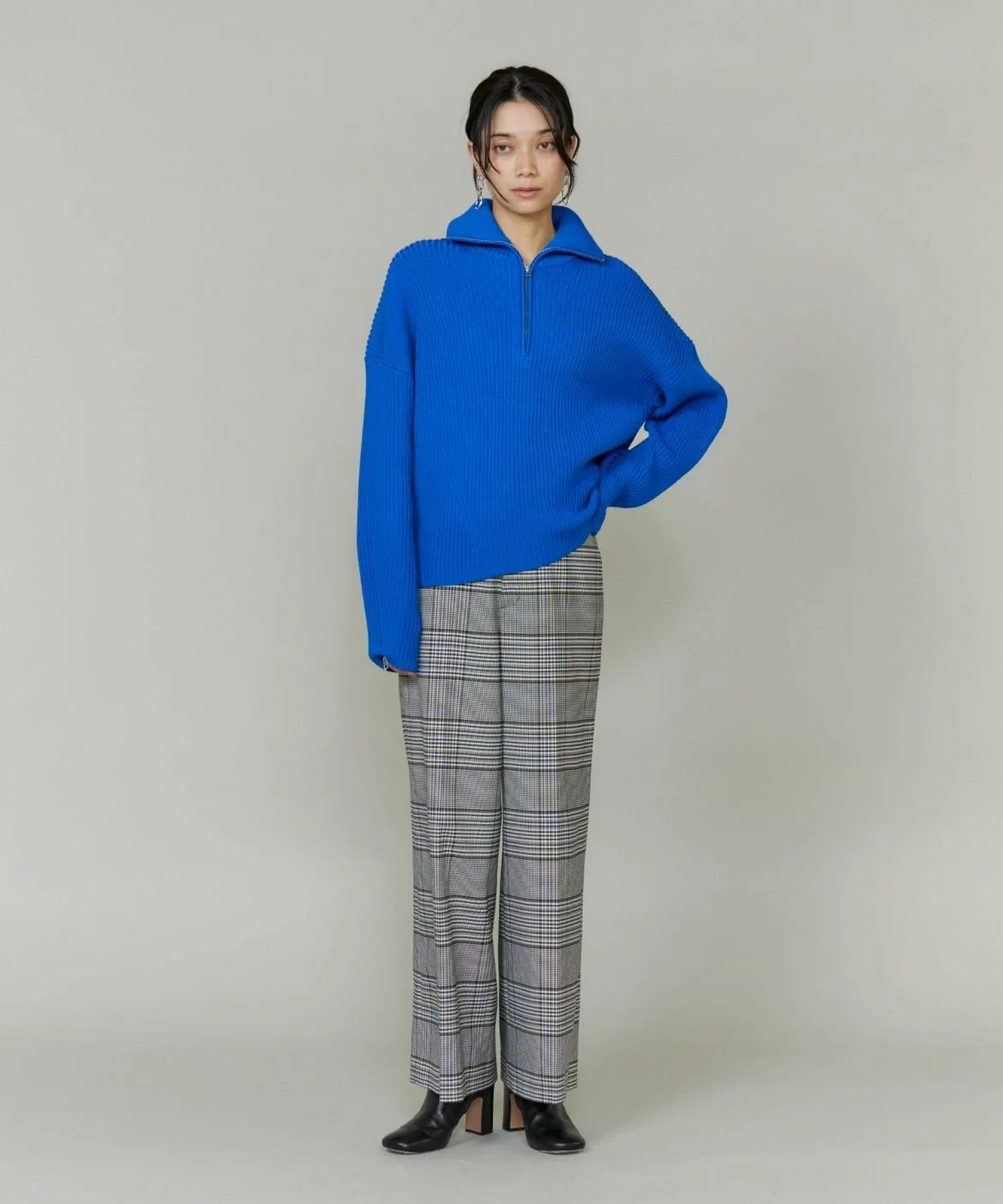 Основа выполнена из камвольной пряжи, смеси полиэстера и шерсти Toray Lumilet. Уток представляет собой смесь полиэстера и вискозы с добавлением эластичных волокон для комфортной посадки. Клетчатый узор — оригинальный дизайн.