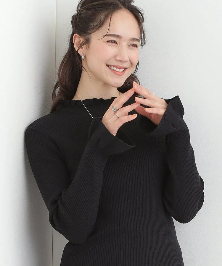 Эта трикотажная вещь в рубчик украшена оборками на воротнике и рукавах, что придает ей изысканный и утонченный вид.