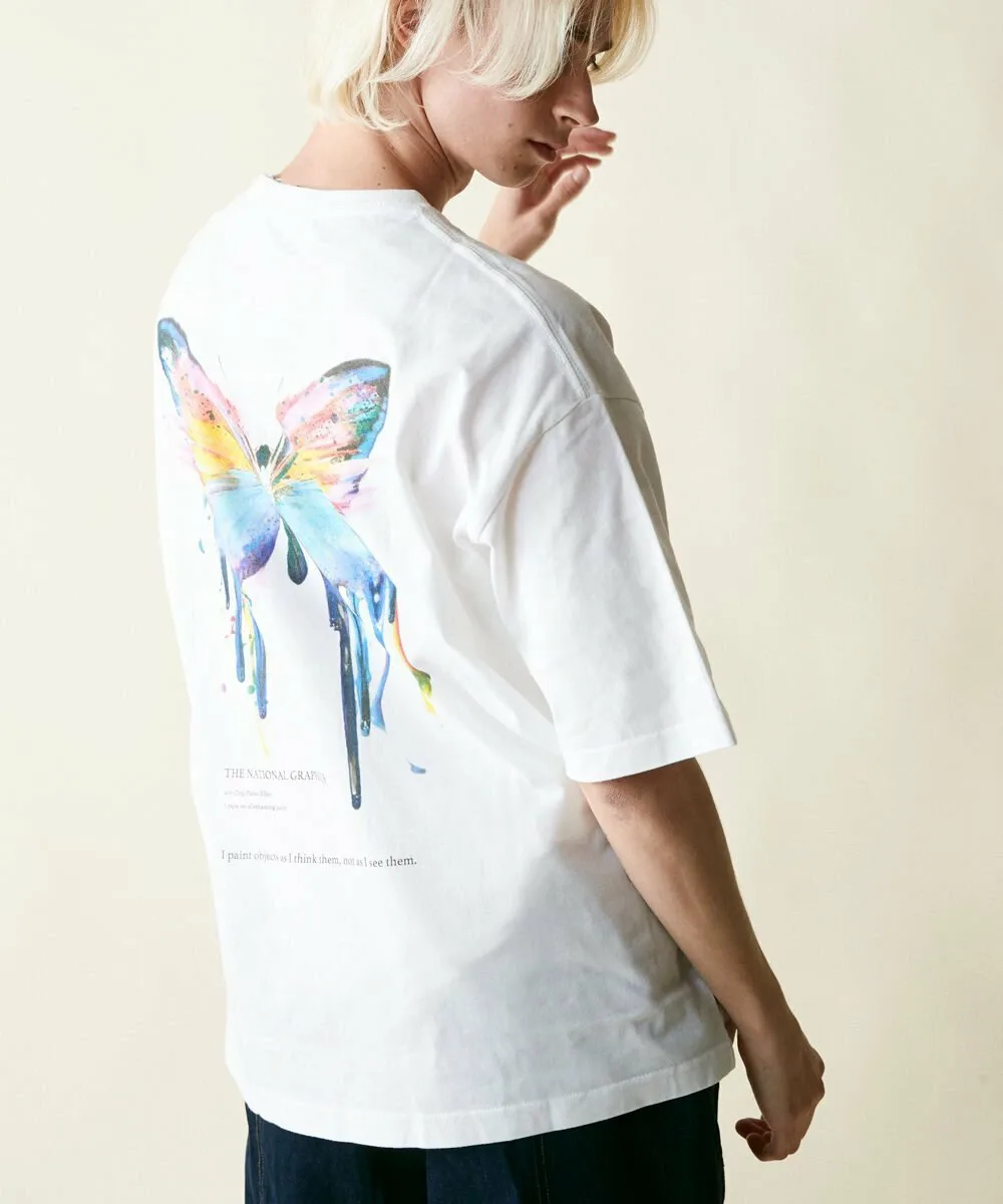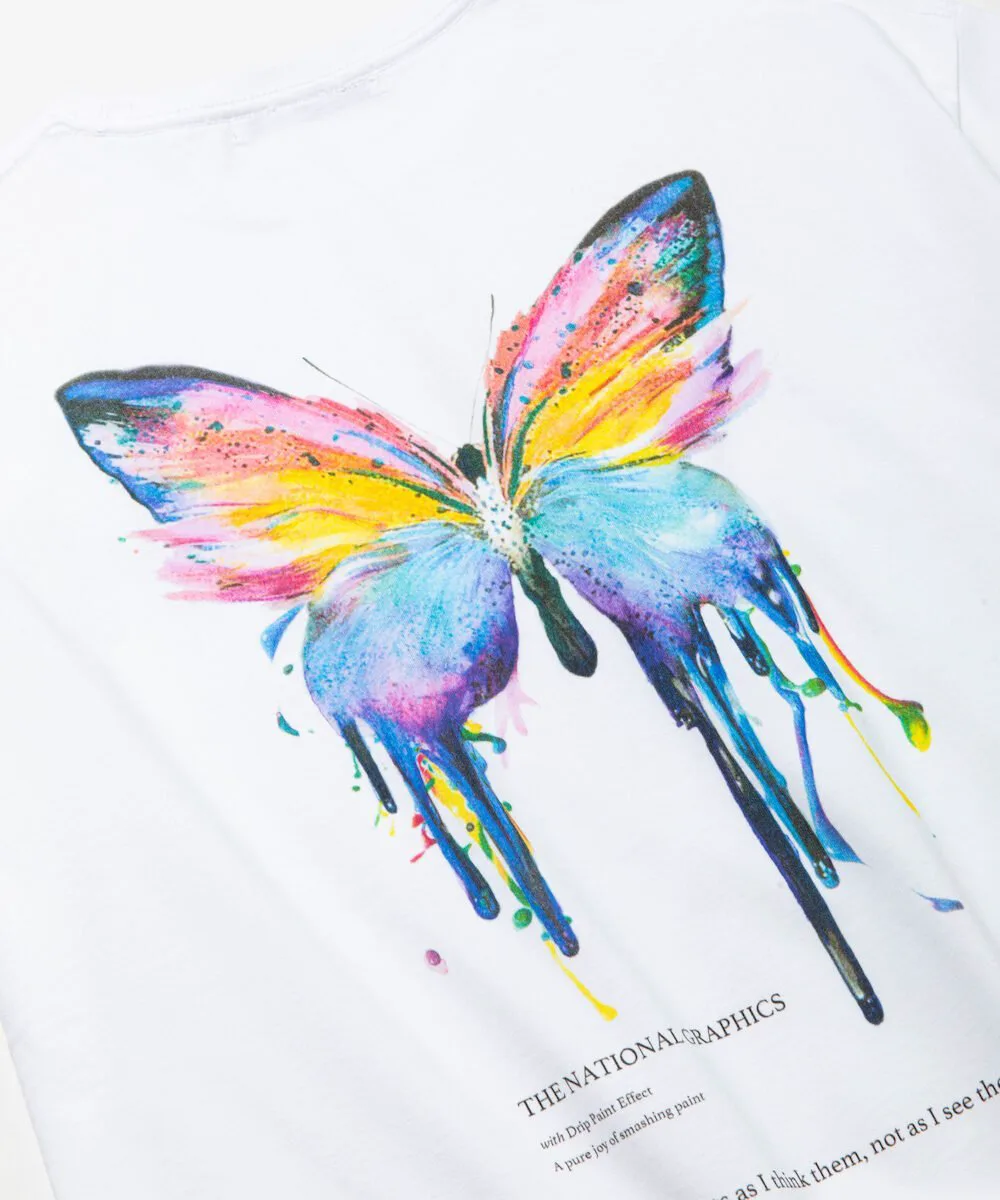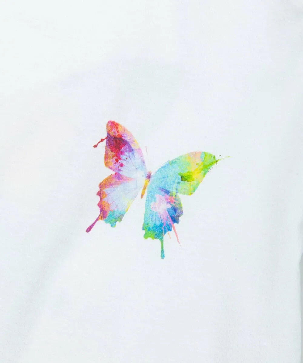 Этот крой и силуэт украшен смелым графическим принтом, нарисованным от руки, на передней части и мотивом бабочки на спине.