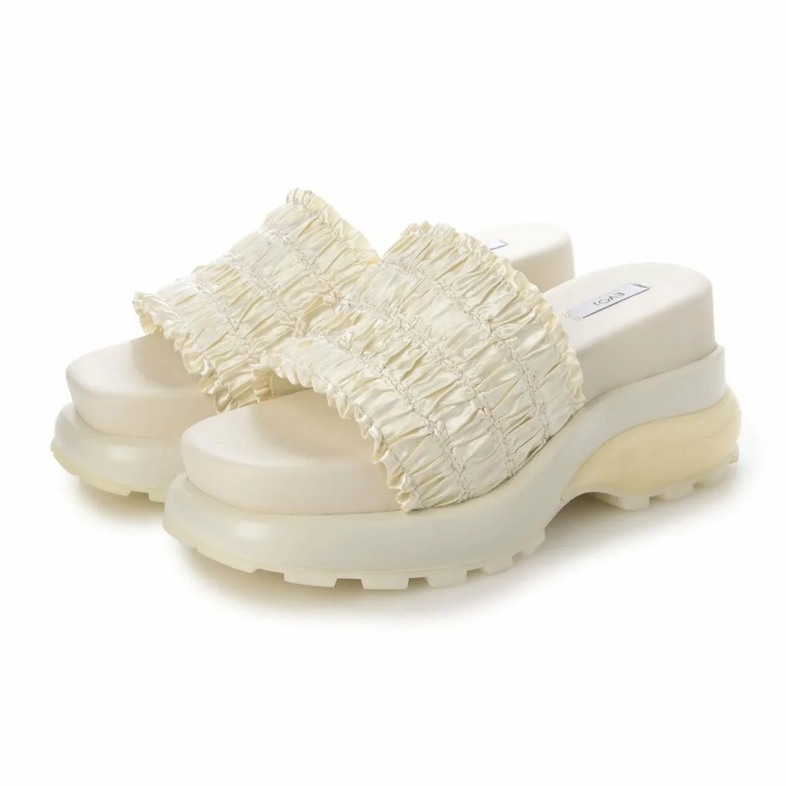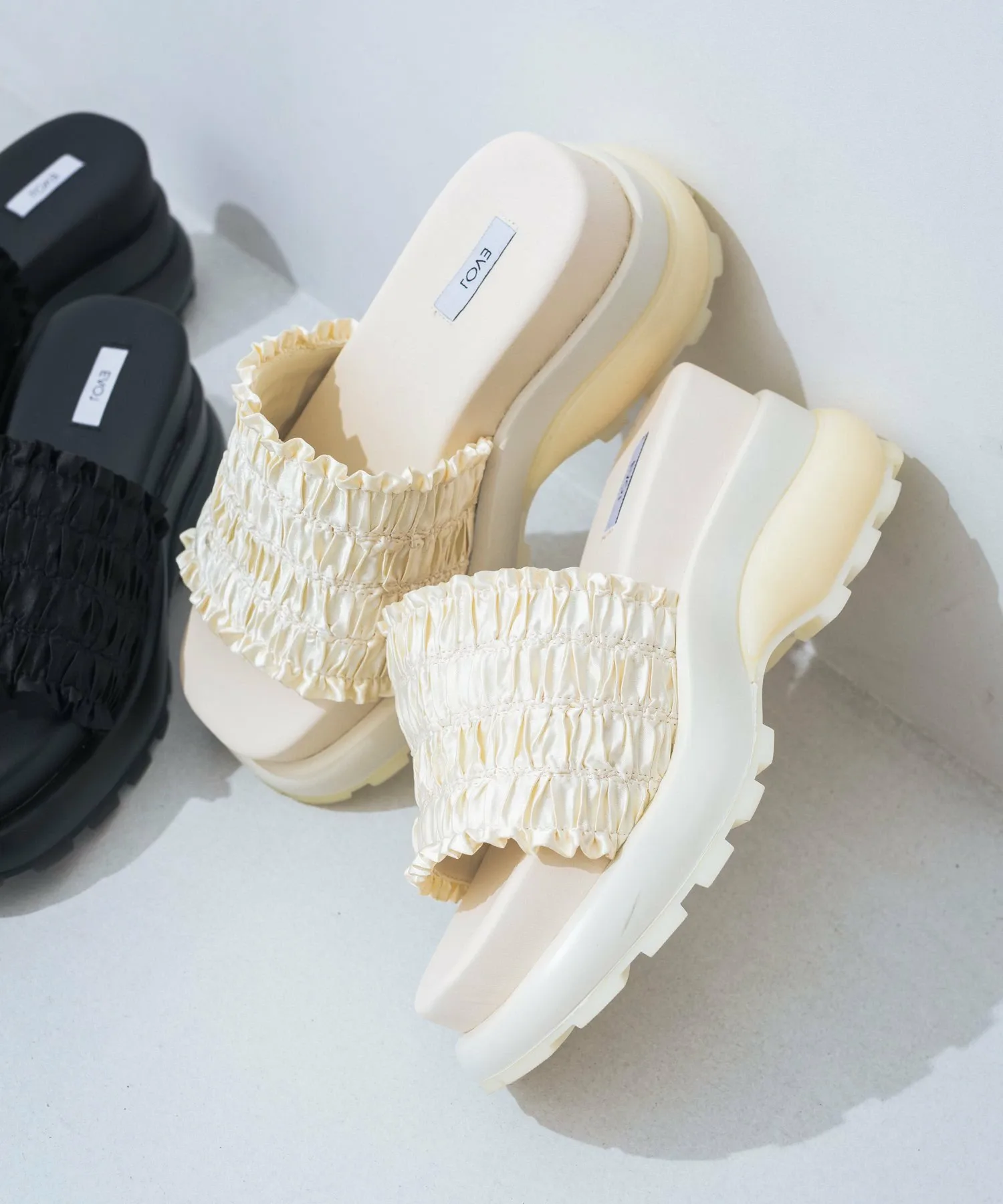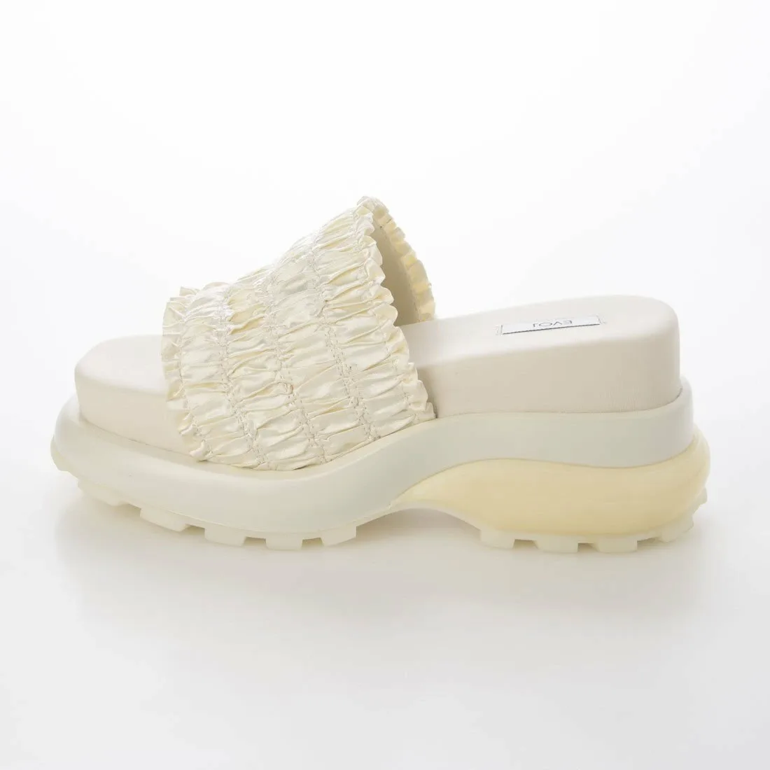 Классические летние сандалии-мюли. Нежные оборки и сборки создают женственный дизайн, а массивная подошва — сбалансированный повседневный образ. Эти сандалии сочетают в себе спортивный и одновременно женственный стиль. Мягкая стелька делает их удобными в ношении.