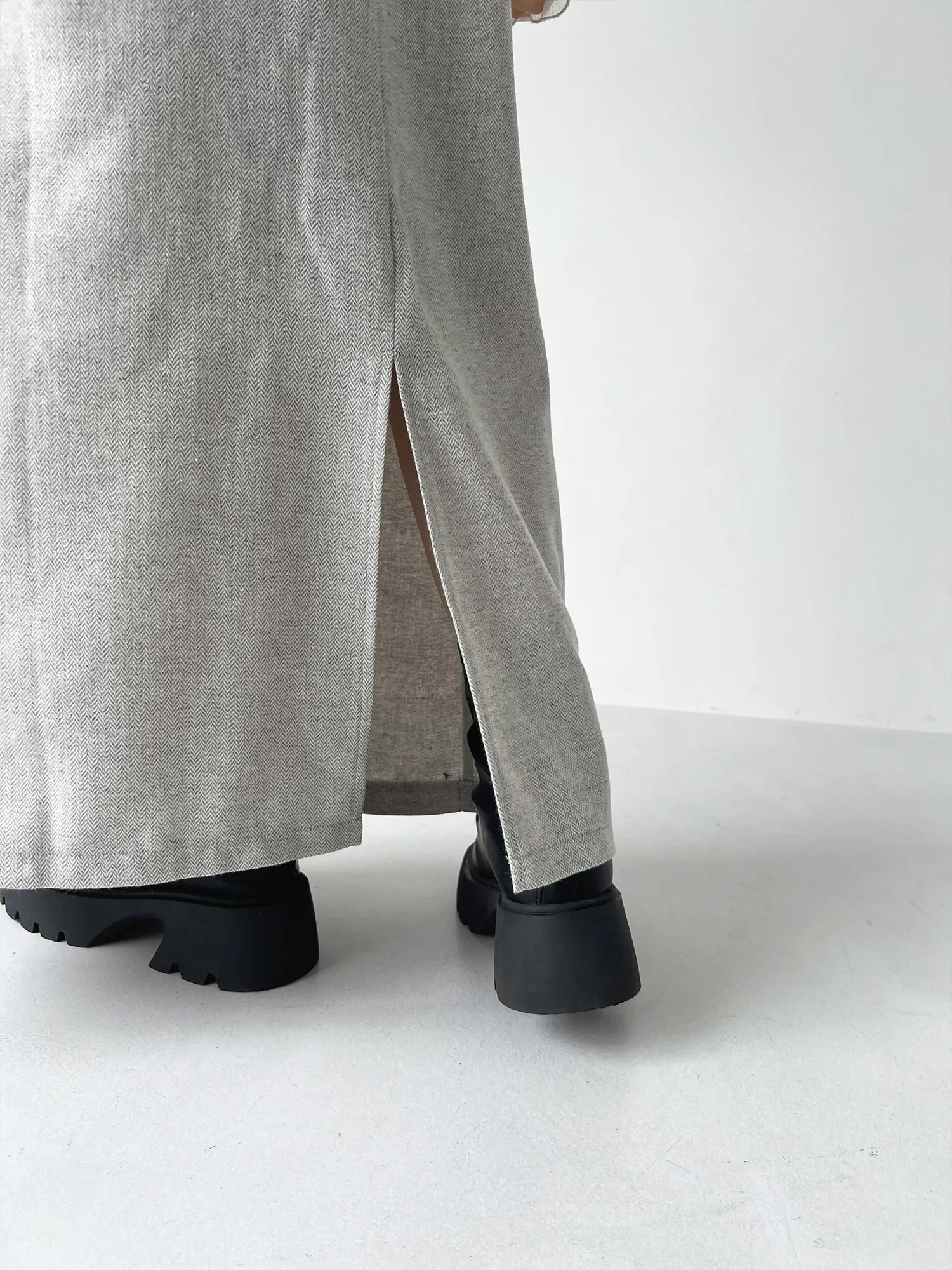 Оно достаточно длинное, но имеет разрез сзади для свободы движений.