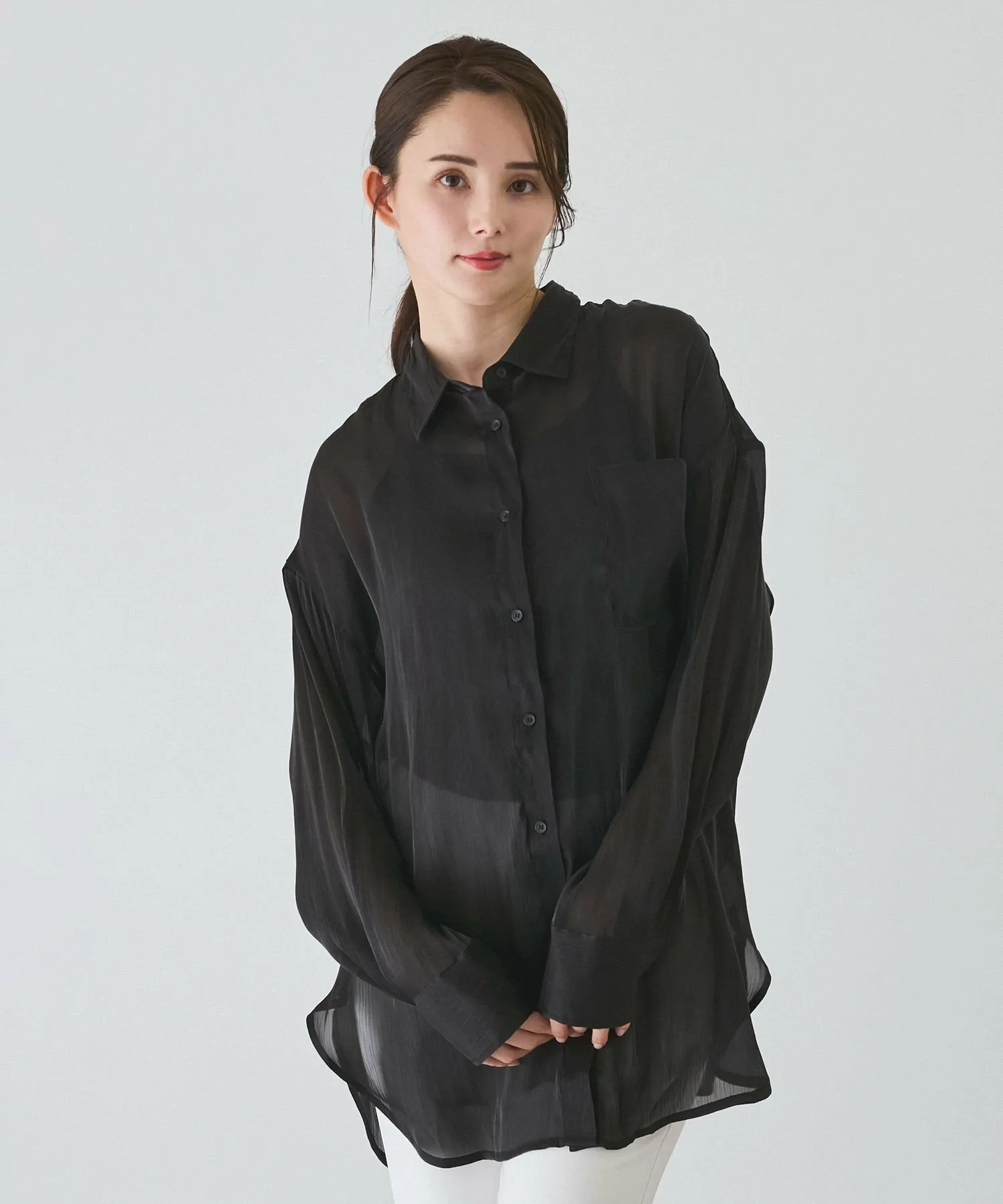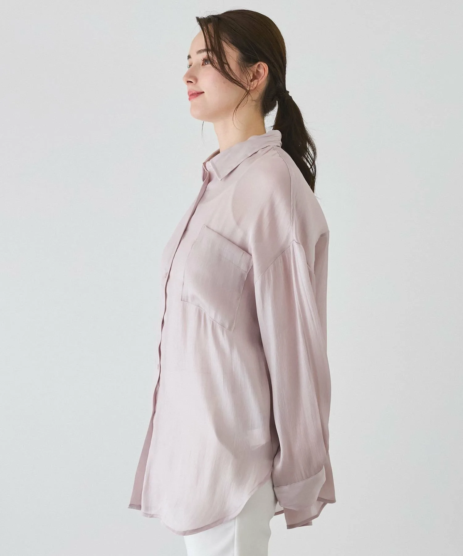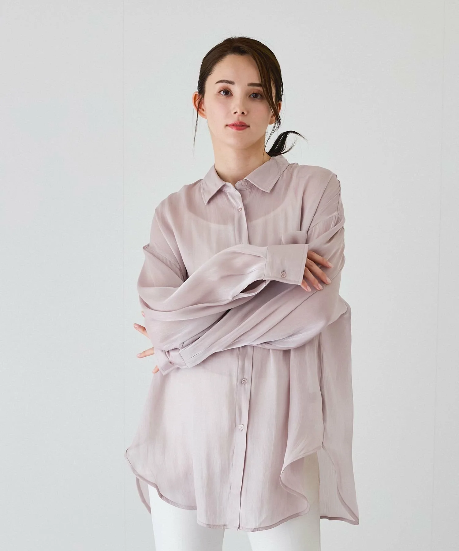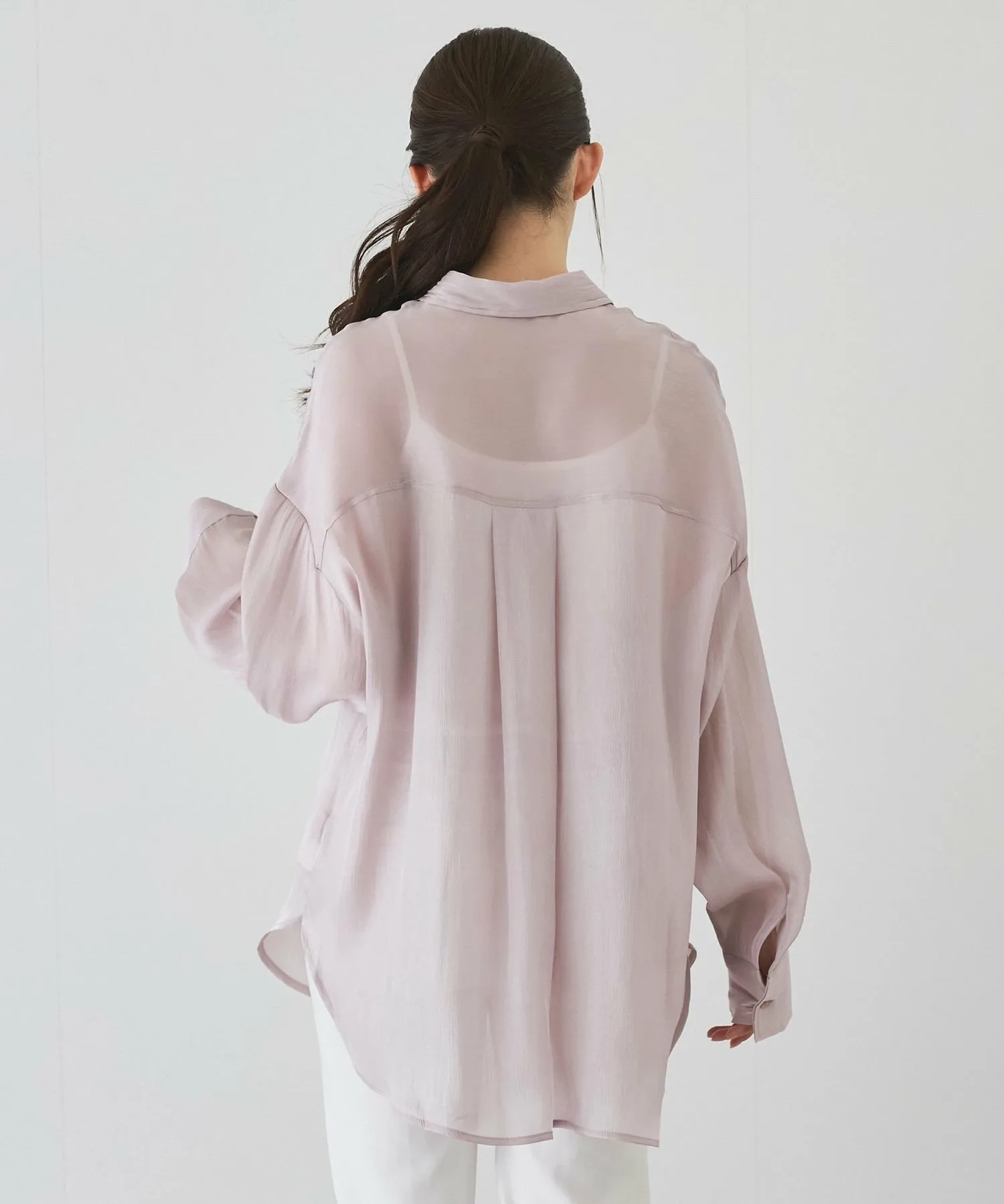 Рубашка из полупрозрачного материала с большим блеском и драпировкой, создающая женственный образ.