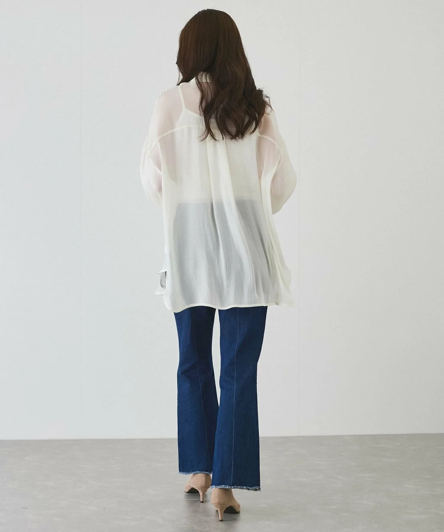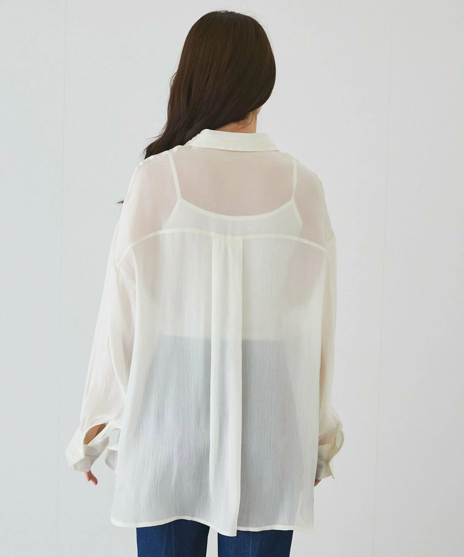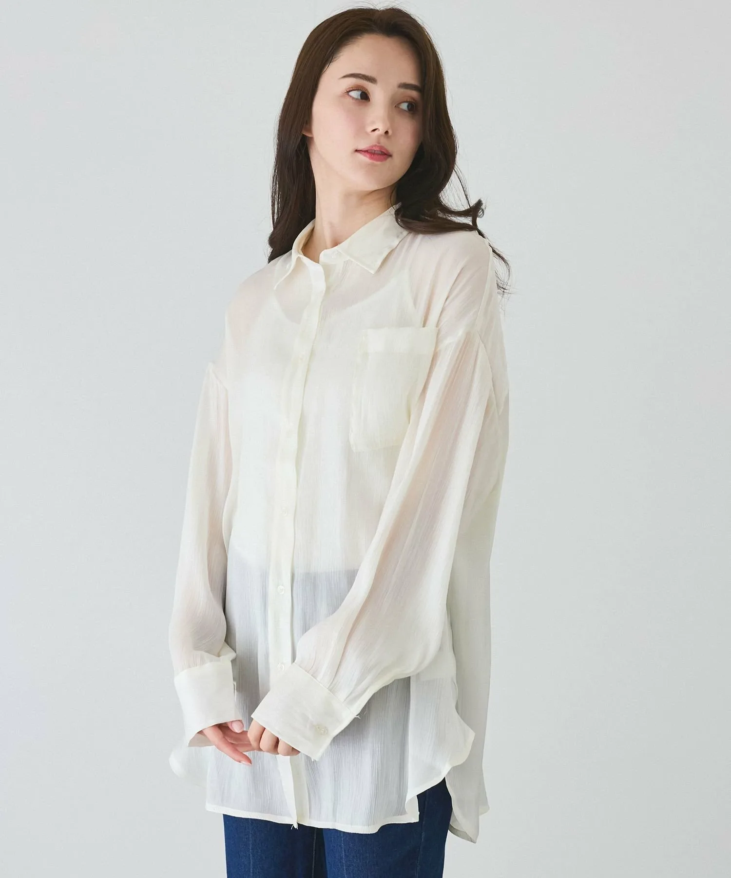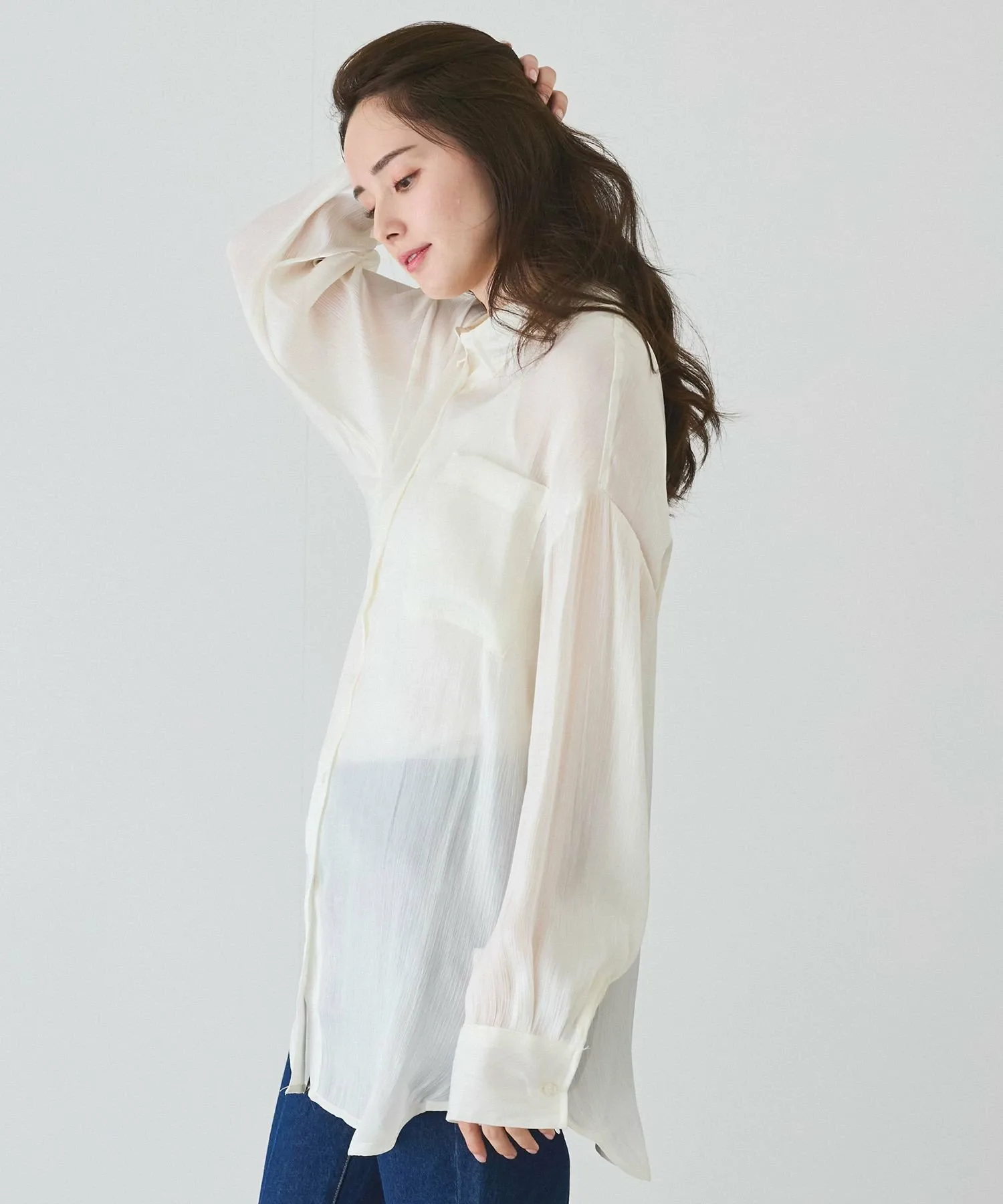 Рубашка из полупрозрачного материала с большим блеском и драпировкой, создающая женственный образ.
