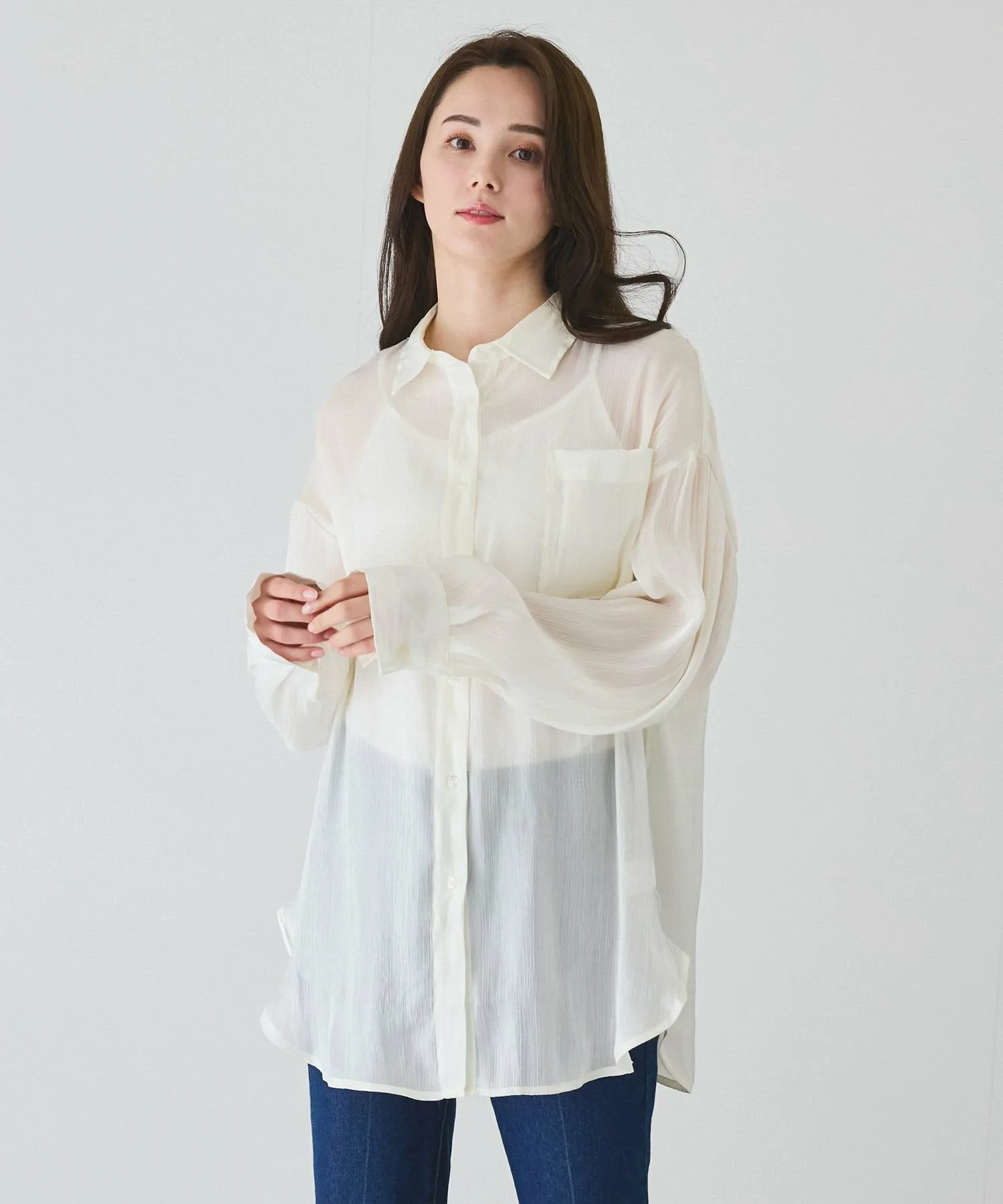 Рубашка из полупрозрачного материала с большим блеском и драпировкой, создающая женственный образ.