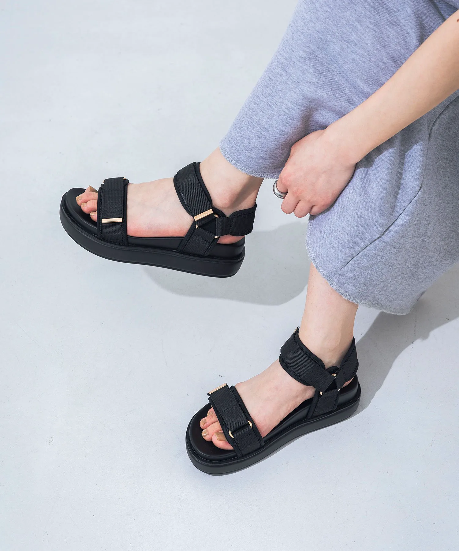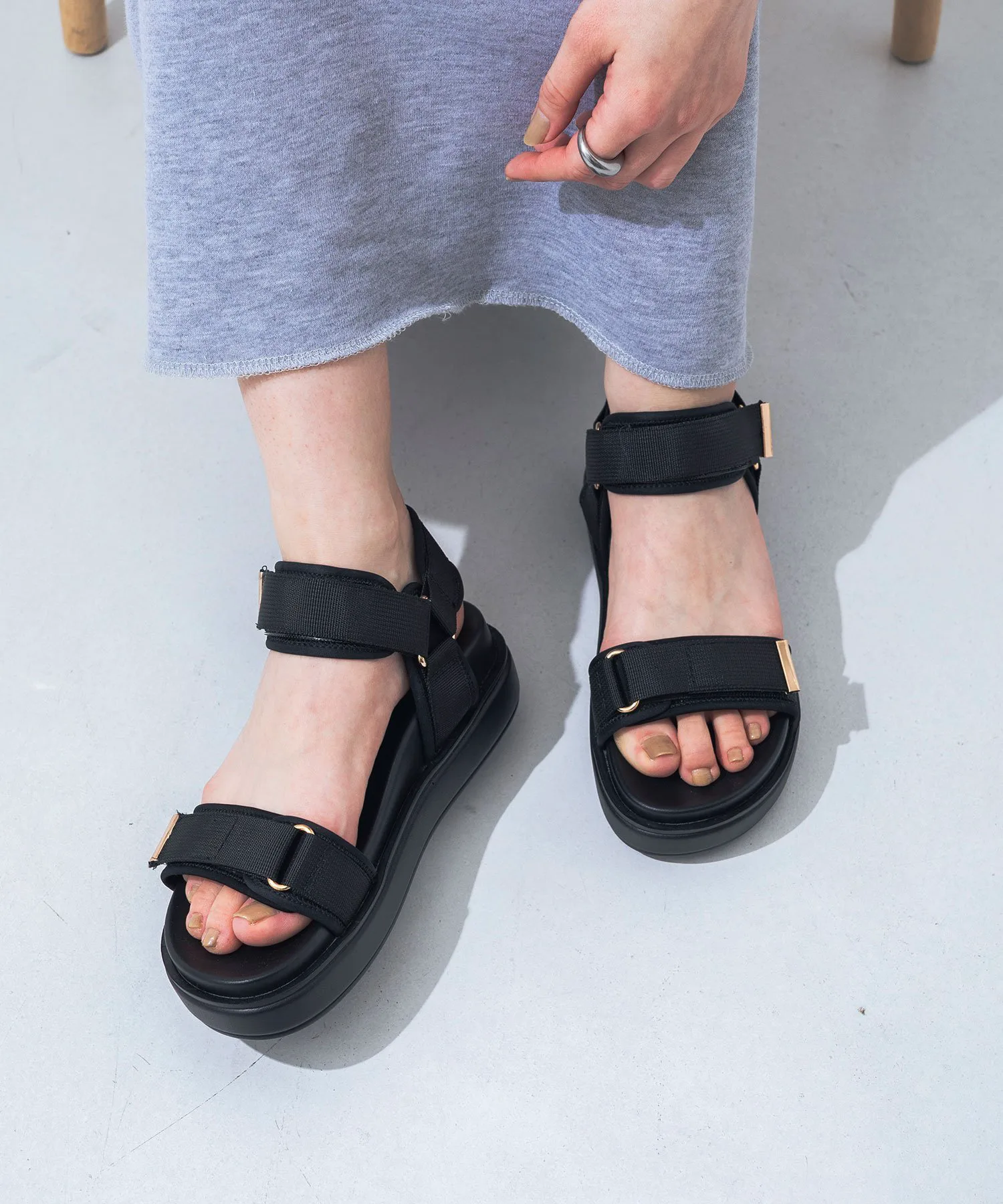 Пышная, модная платформа сочетается с ремешком, украшенным золотой фурнитурой. Хотя этот дизайн обычно спортивный, золотая фурнитура придает ему женственный и мягкий вид. Платформа практически не имеет заметной разницы в высоте, что позволяет легко подчеркнуть ваш стиль. Рекомендуется для путешествий, где вы будете много ходить!