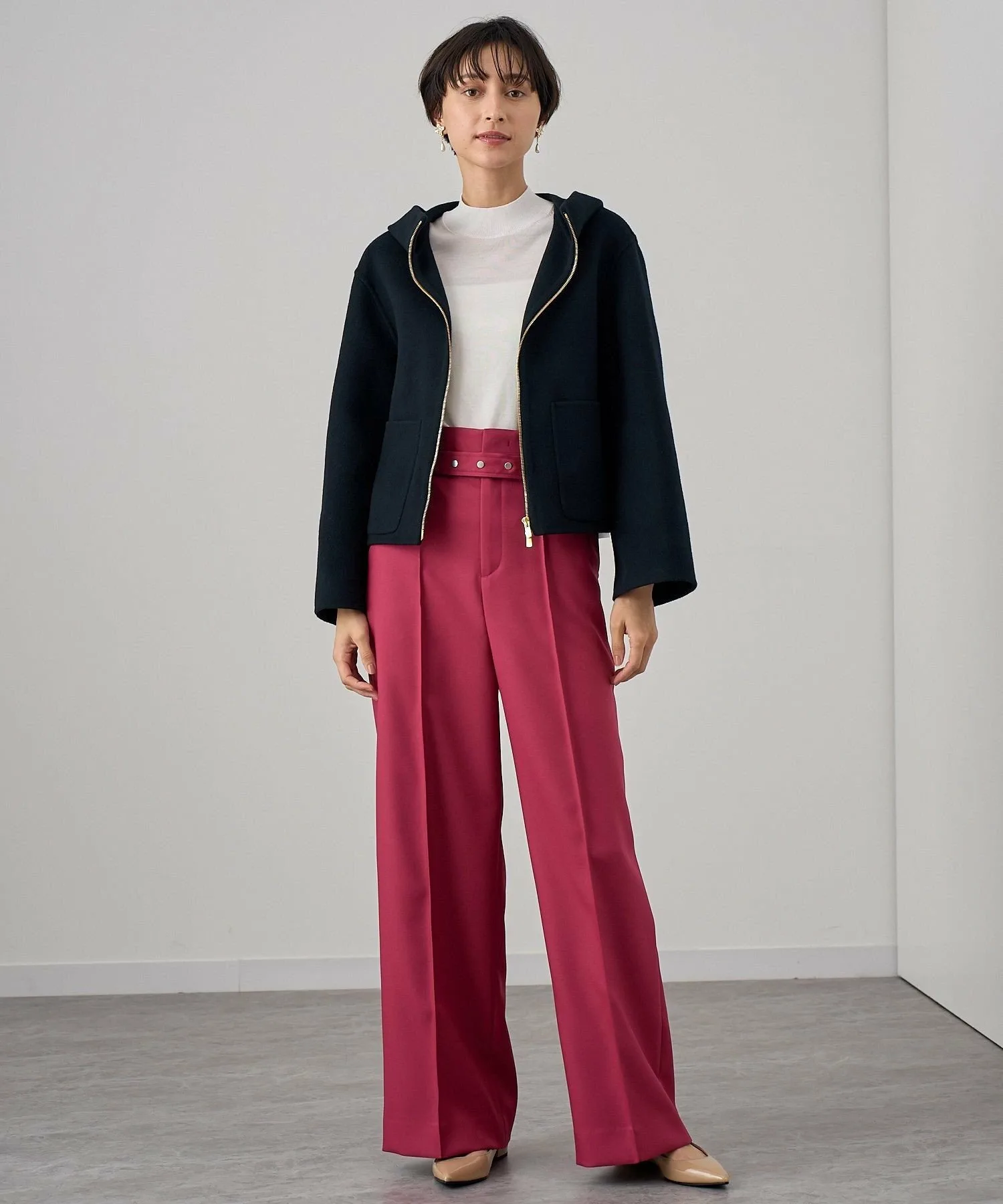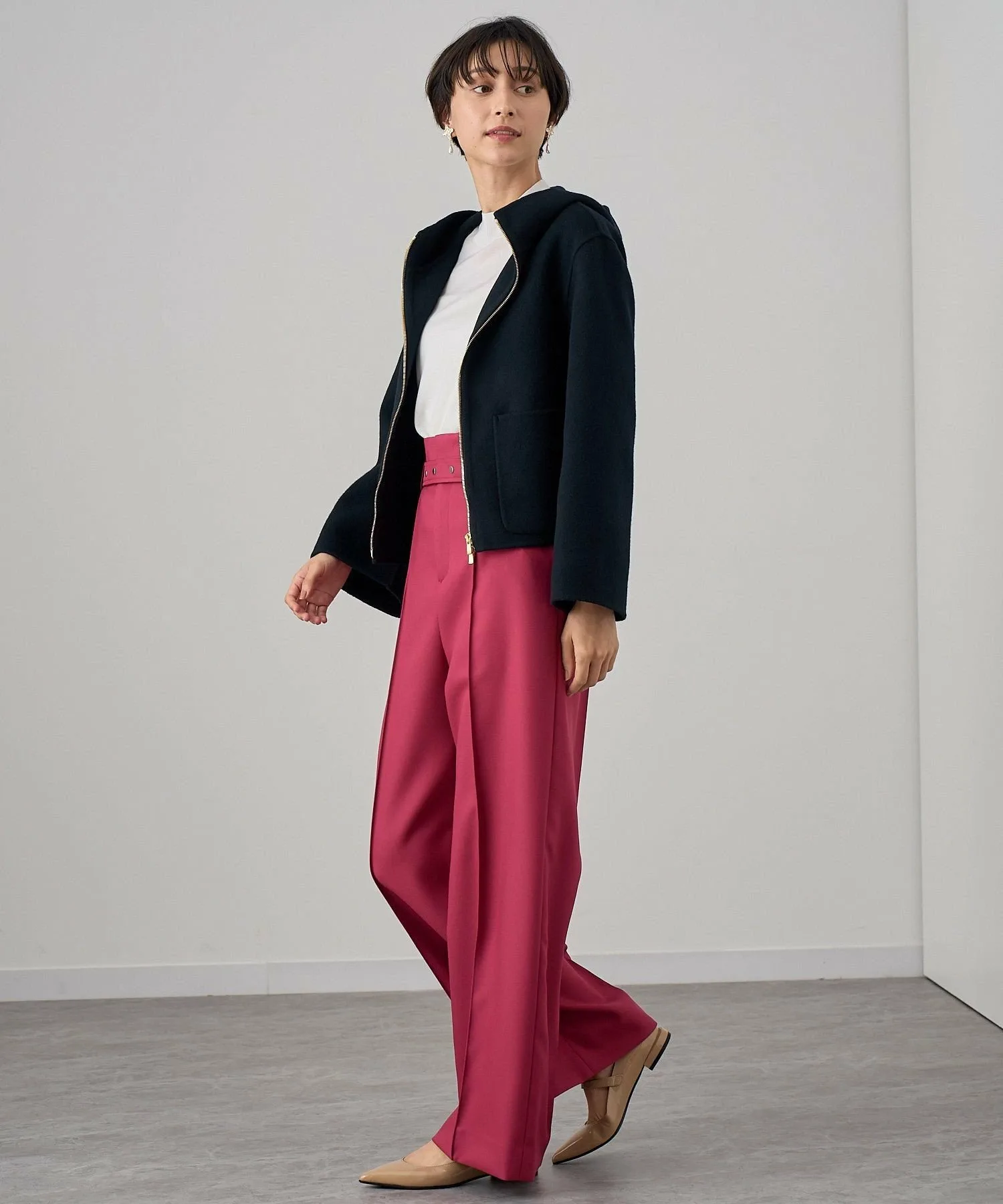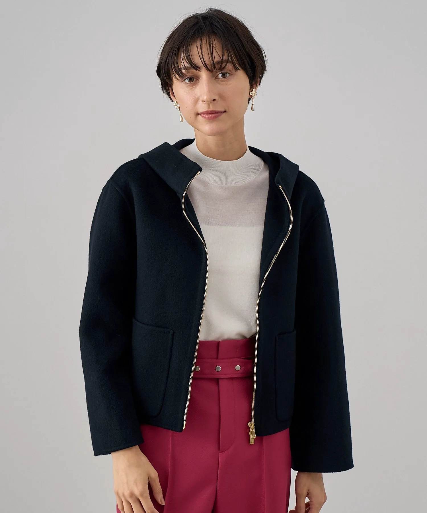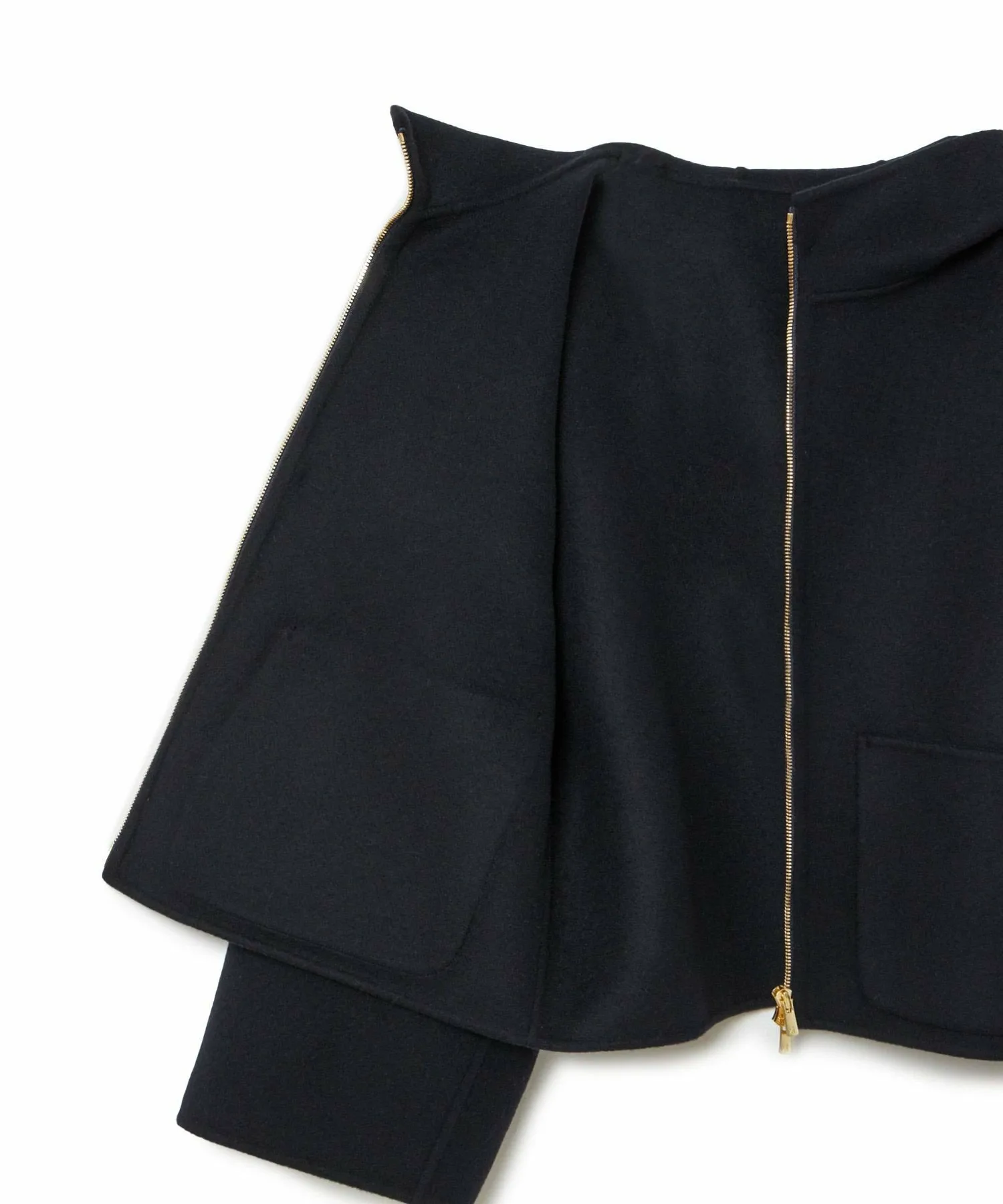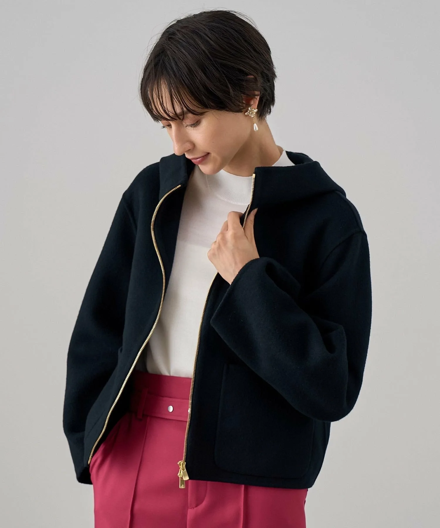 Большие карманы — изюминка этой модели, а молния застегивается наизнанку. Рукава слегка свободные, что позволяет легко носить ее с объемными трикотажными изделиями и блузками.