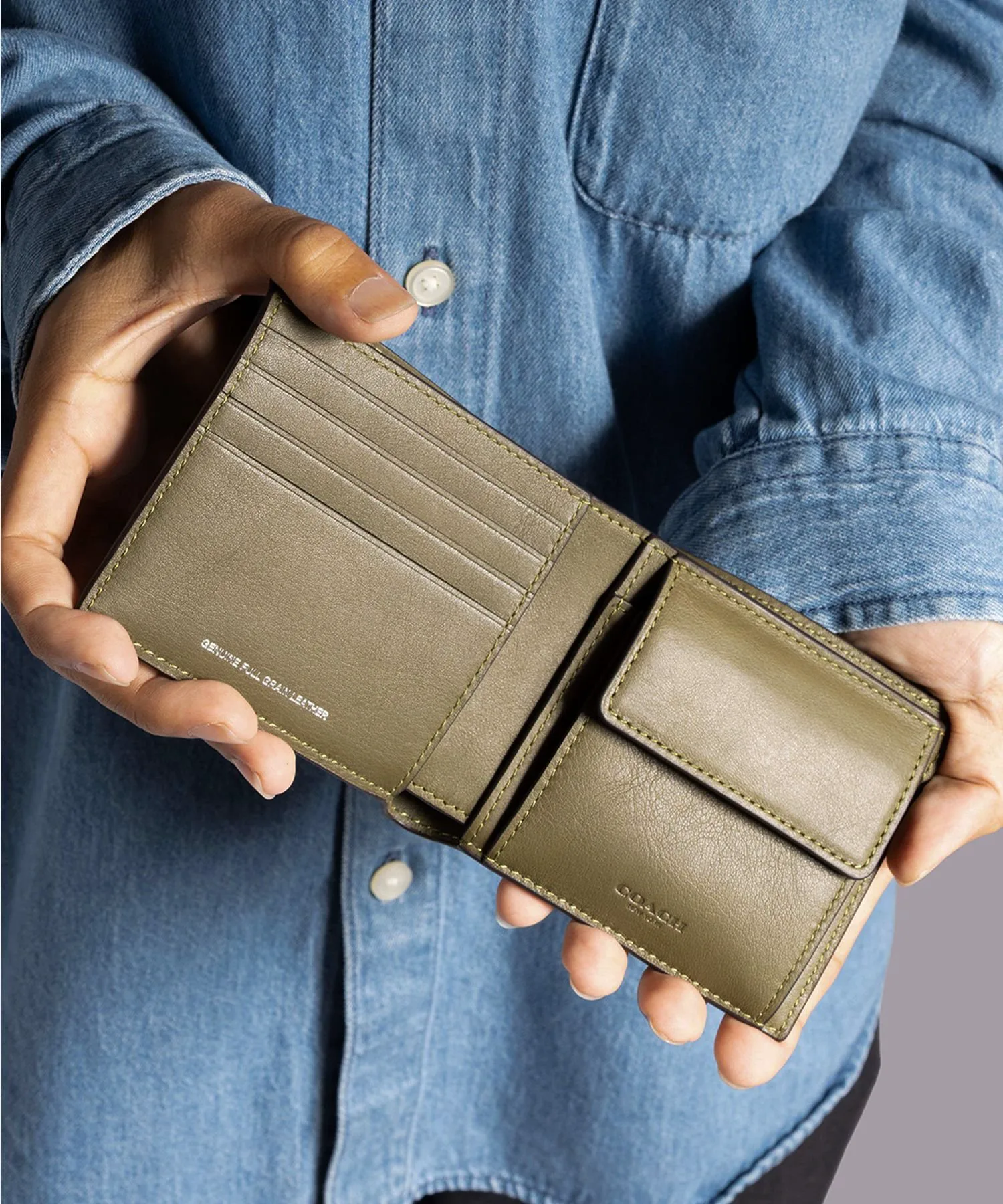 Изготовленный из натуральной зернистой кожи, этот тонкий и практичный складной кошелек легко помещается в карман. Четыре отделения для карт, отделение для банкнот и отделение для монет с застежкой-кнопкой позволяют хранить все необходимое.
