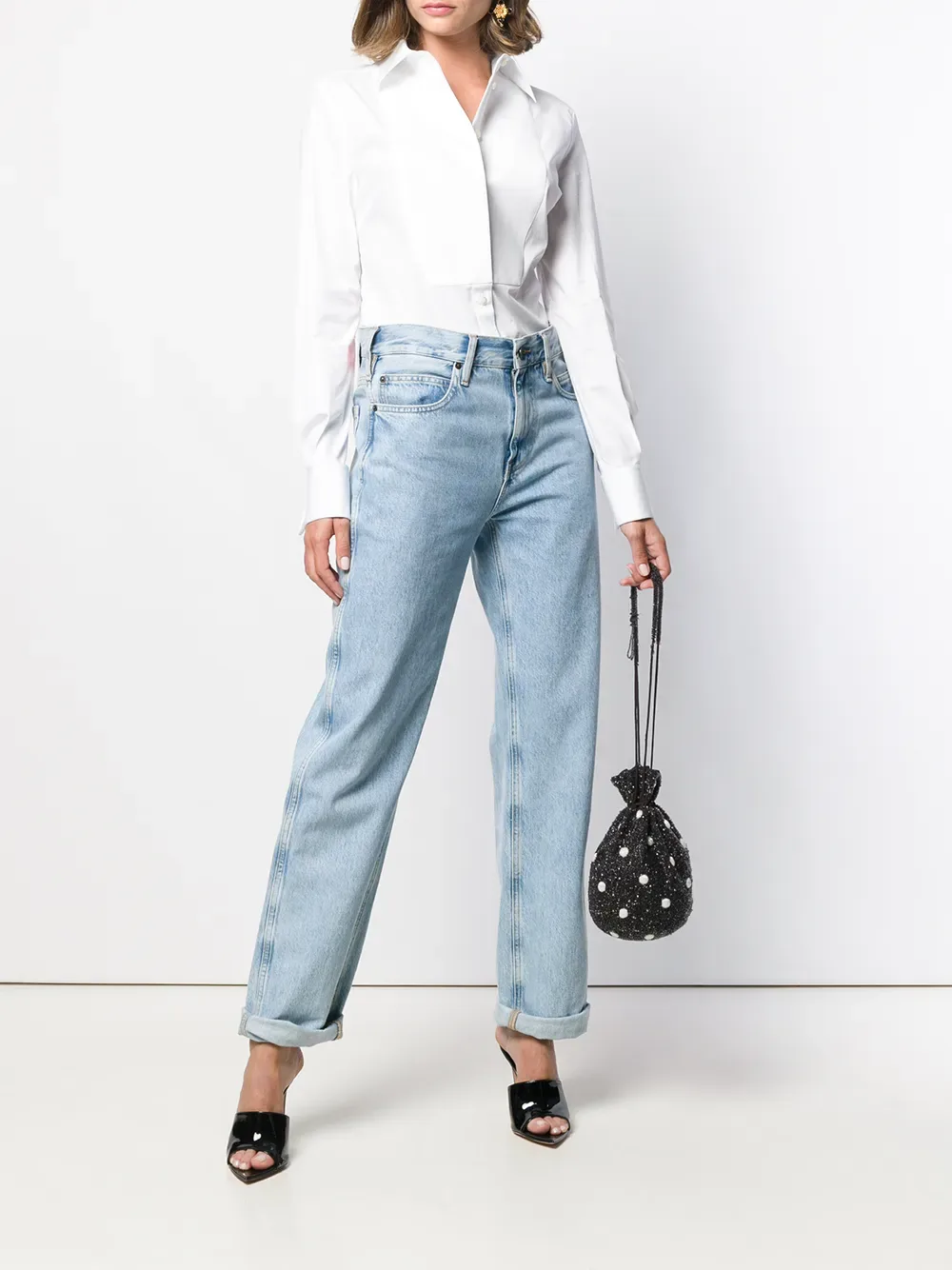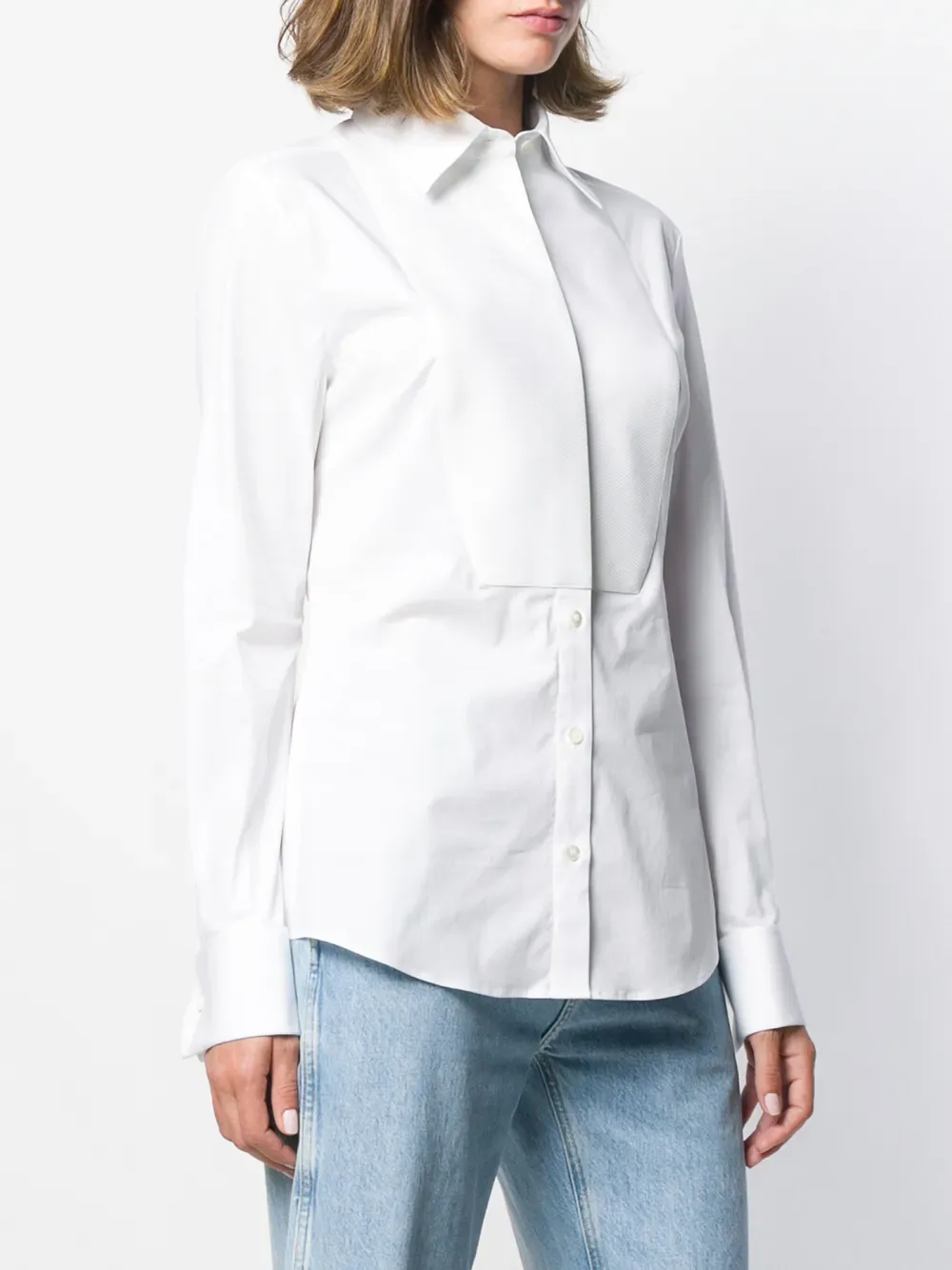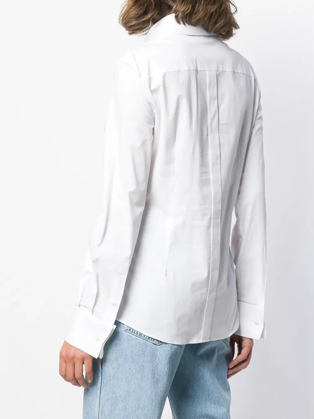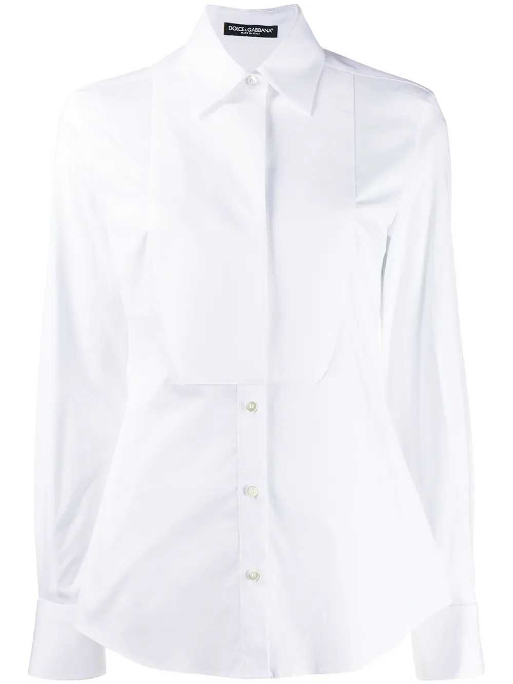 Колоритный декор, цветочные узоры и тонкое кружево стали отличительными символами современных коллекций итальянского дома моды Dolce & Gabbana. Среди моделей - белая поплиновая рубашка из эластичного хлопка от Dolce & Gabbana (Дольче энд Габбана). Классический воротник, длинные рукава, потайная застежка спереди, узкий крой, нагрудник на шее, манжеты на пуговицах, застежка на перламутровых пуговицах и закругленный подол.