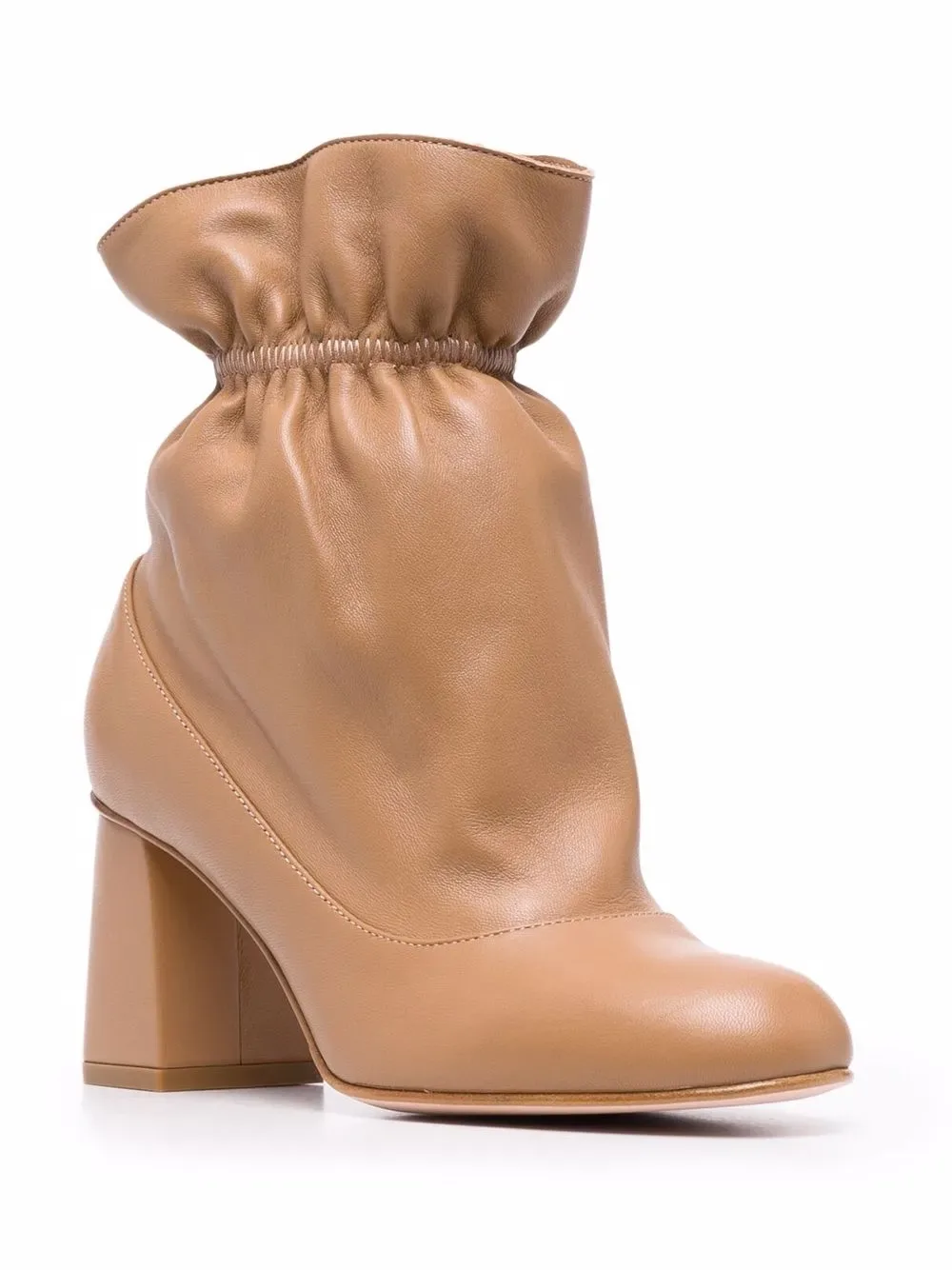 Детали с оборками, эластичные манжеты, длина по щиколотку, закругленный носок, модель без застежки, наборный каблук средней высоты и кожаная подошва.