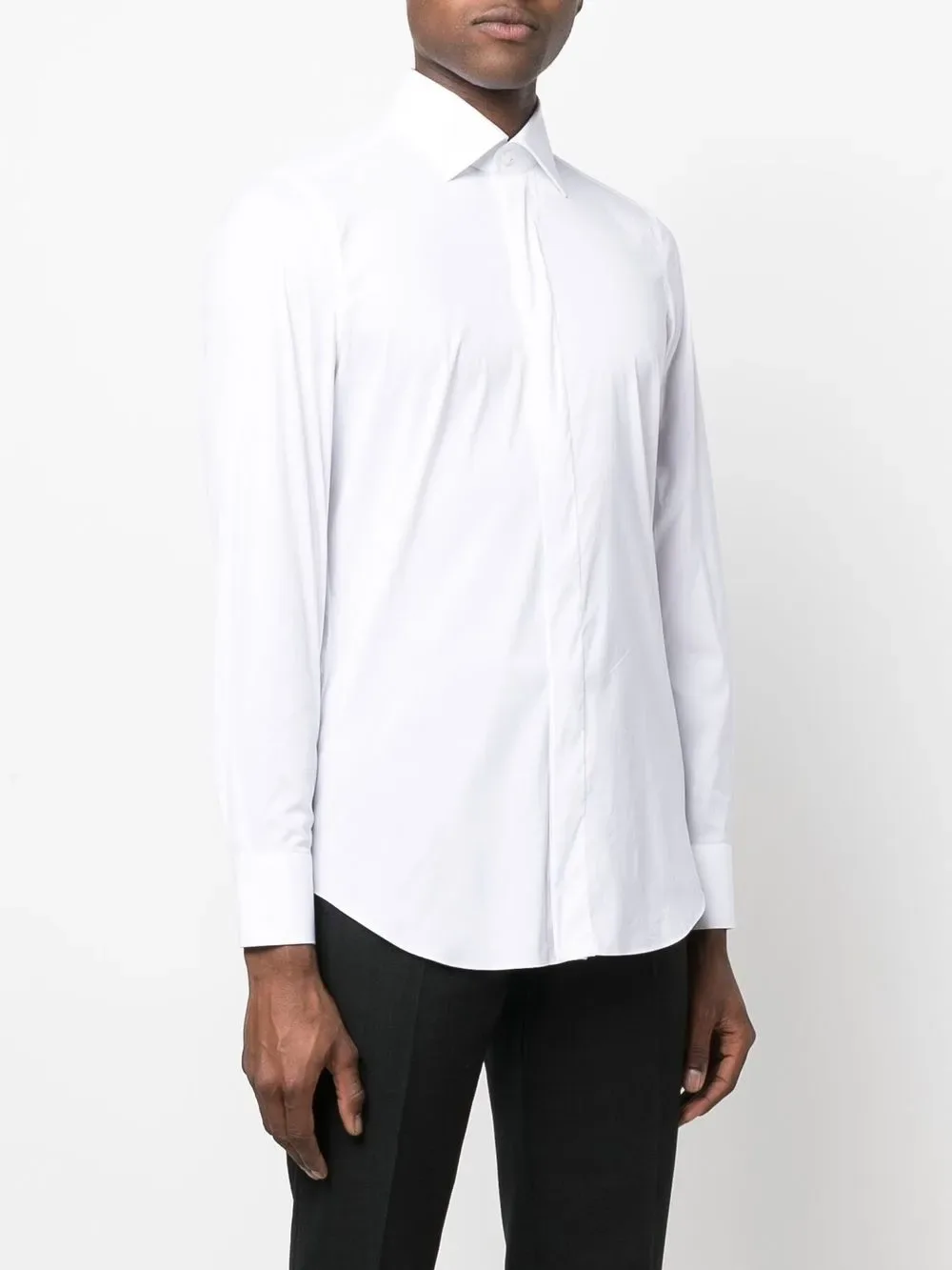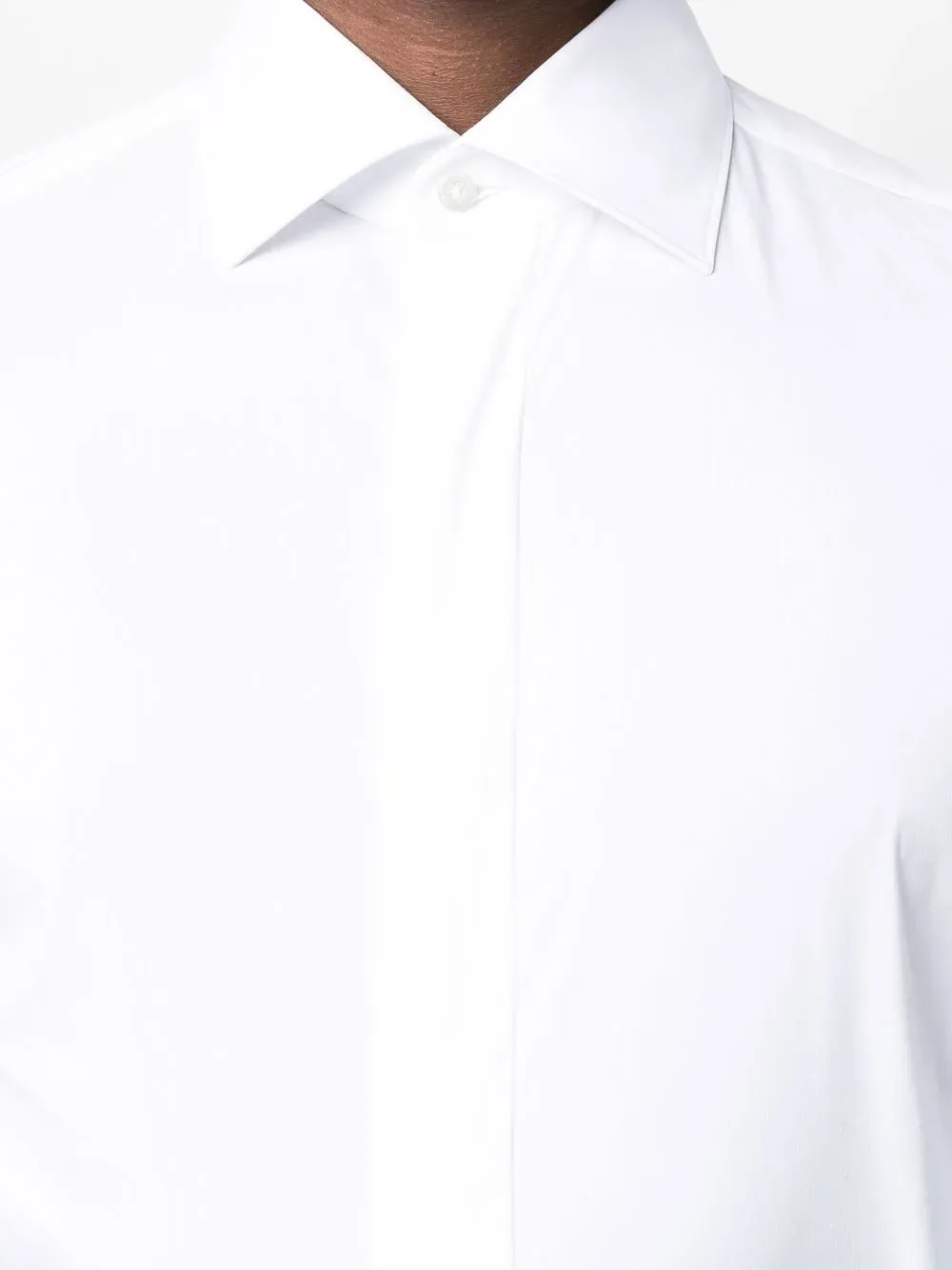 Белый, смесовый хлопок, классический воротник, потайная пуговичная застежка спереди, длинные рукава, манжеты на пуговицах и закругленный подол.