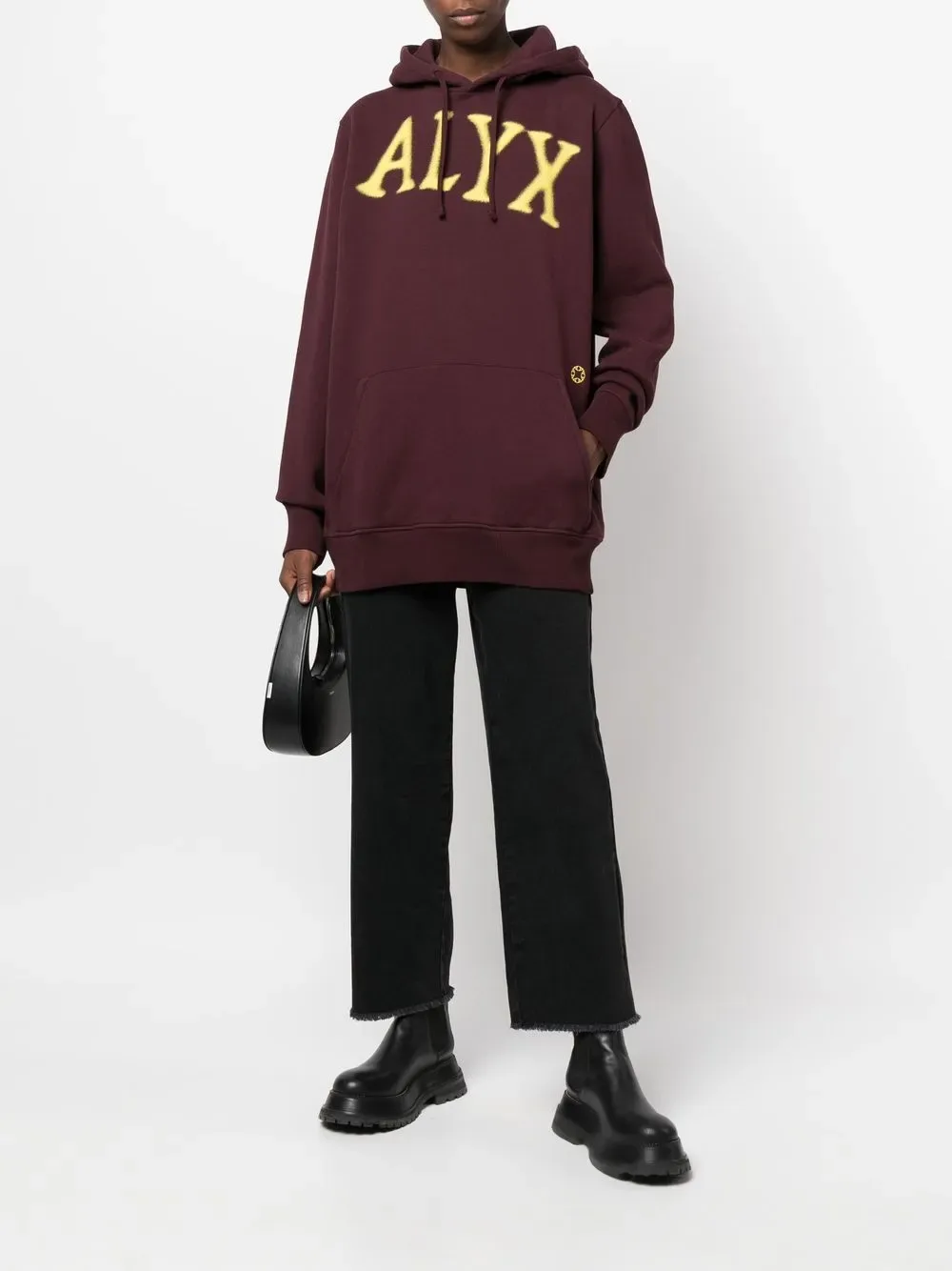 Логотип спереди, карман-муфта, затягивающийся на шнурок капюшон, длинные рукава и прямой подол.
