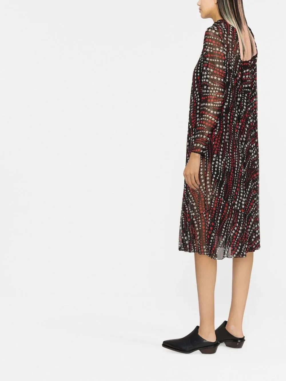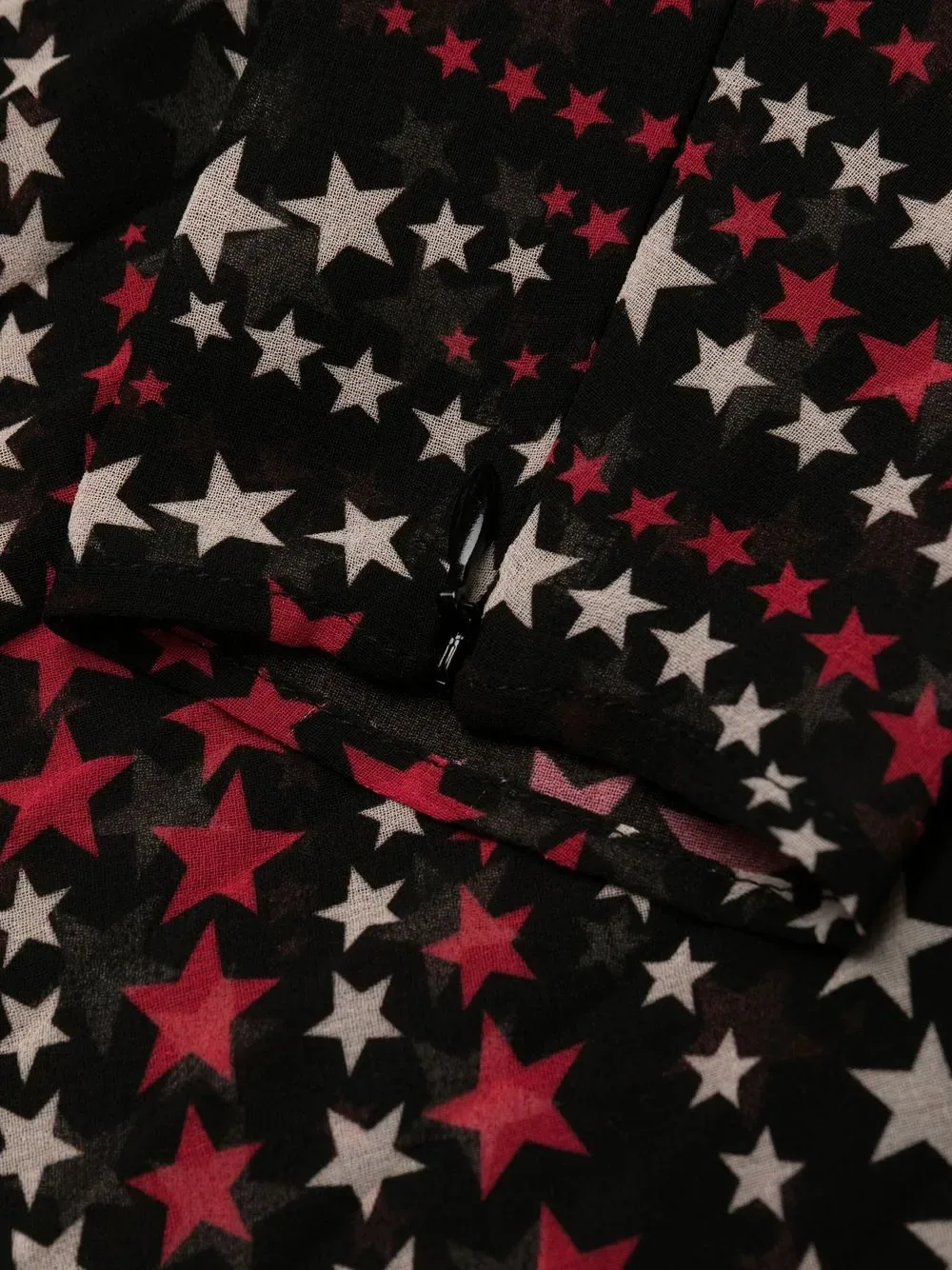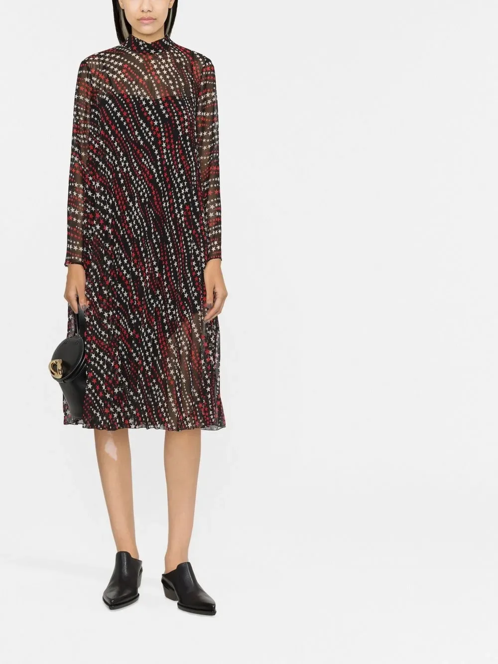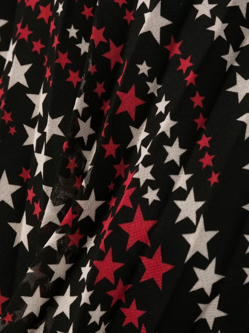 Черный, принт с изображением звезд, воротник-стойка, застежка на завязке сзади, длинные рукава и плиссированная юбка.