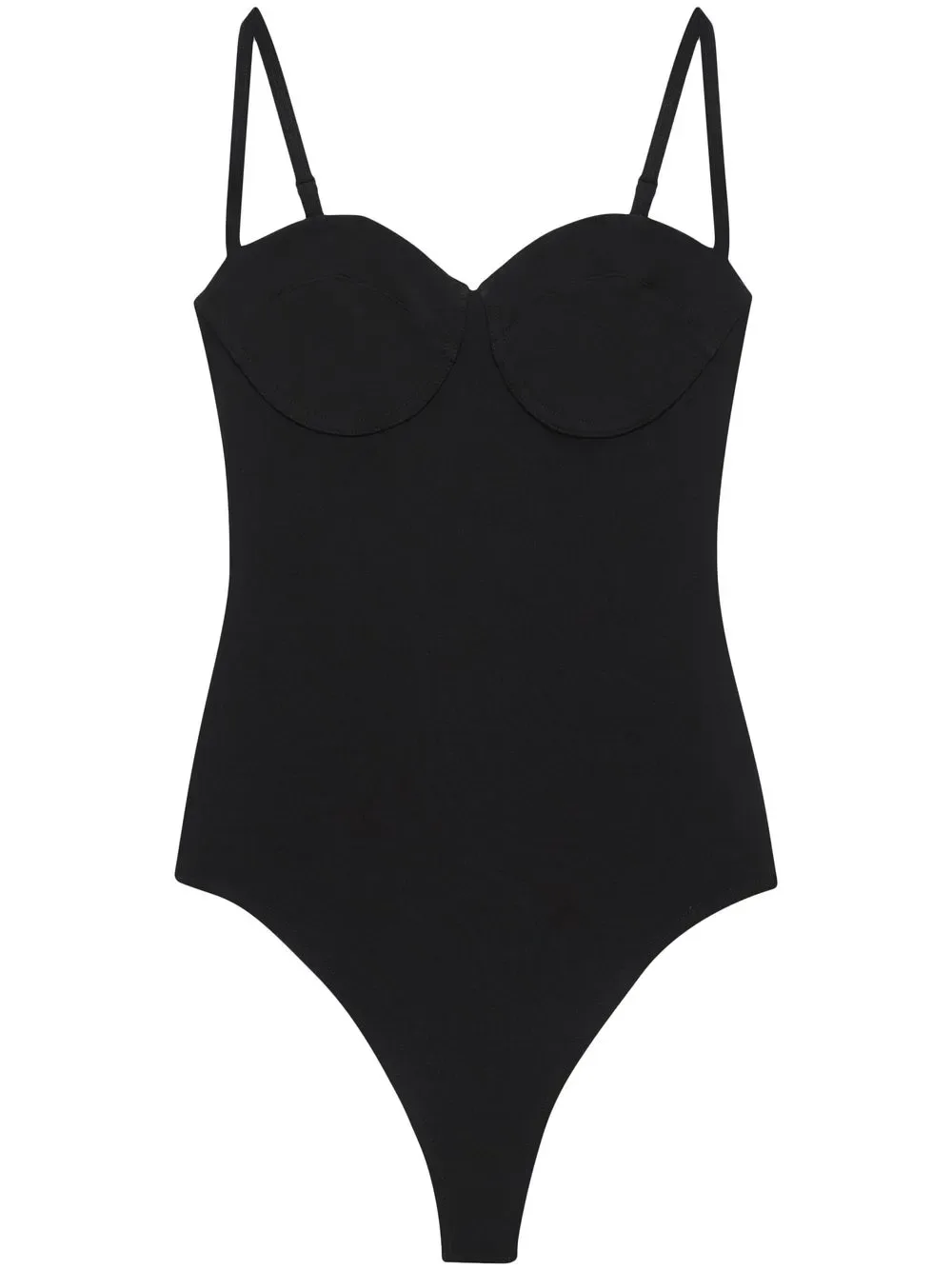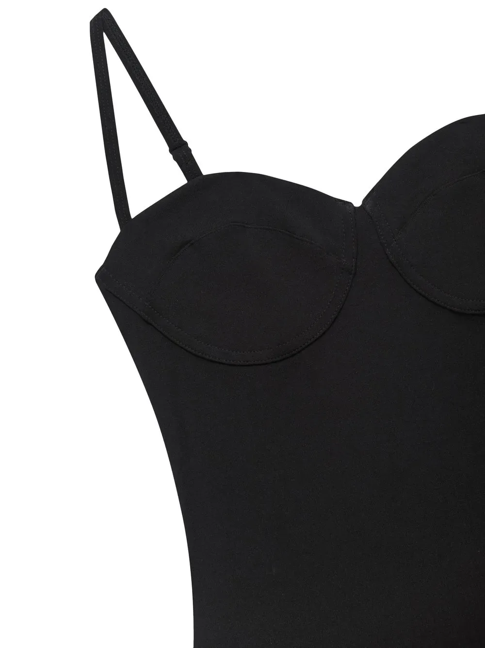 Черный, эластичный материал, регулируемые тонкие бретели, вшитые косточки и принт с логотипом сзади.