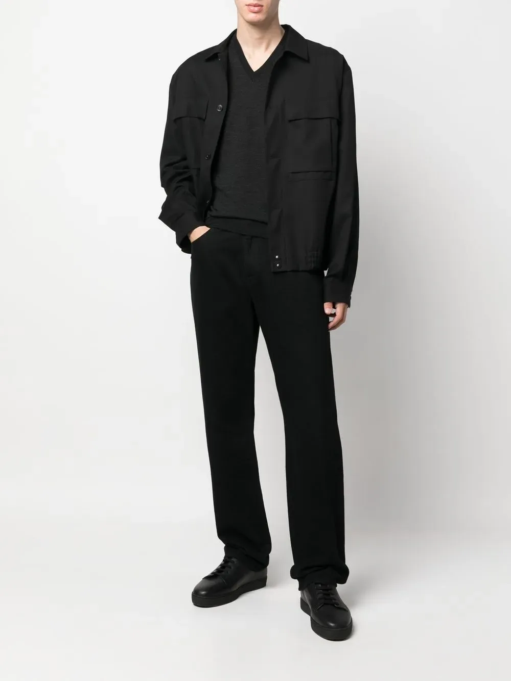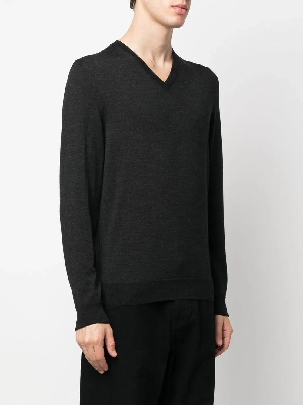 Антрацитово-серый, шерсть мериноса, V-образный вырез, длинные рукава и подол в рубчик.