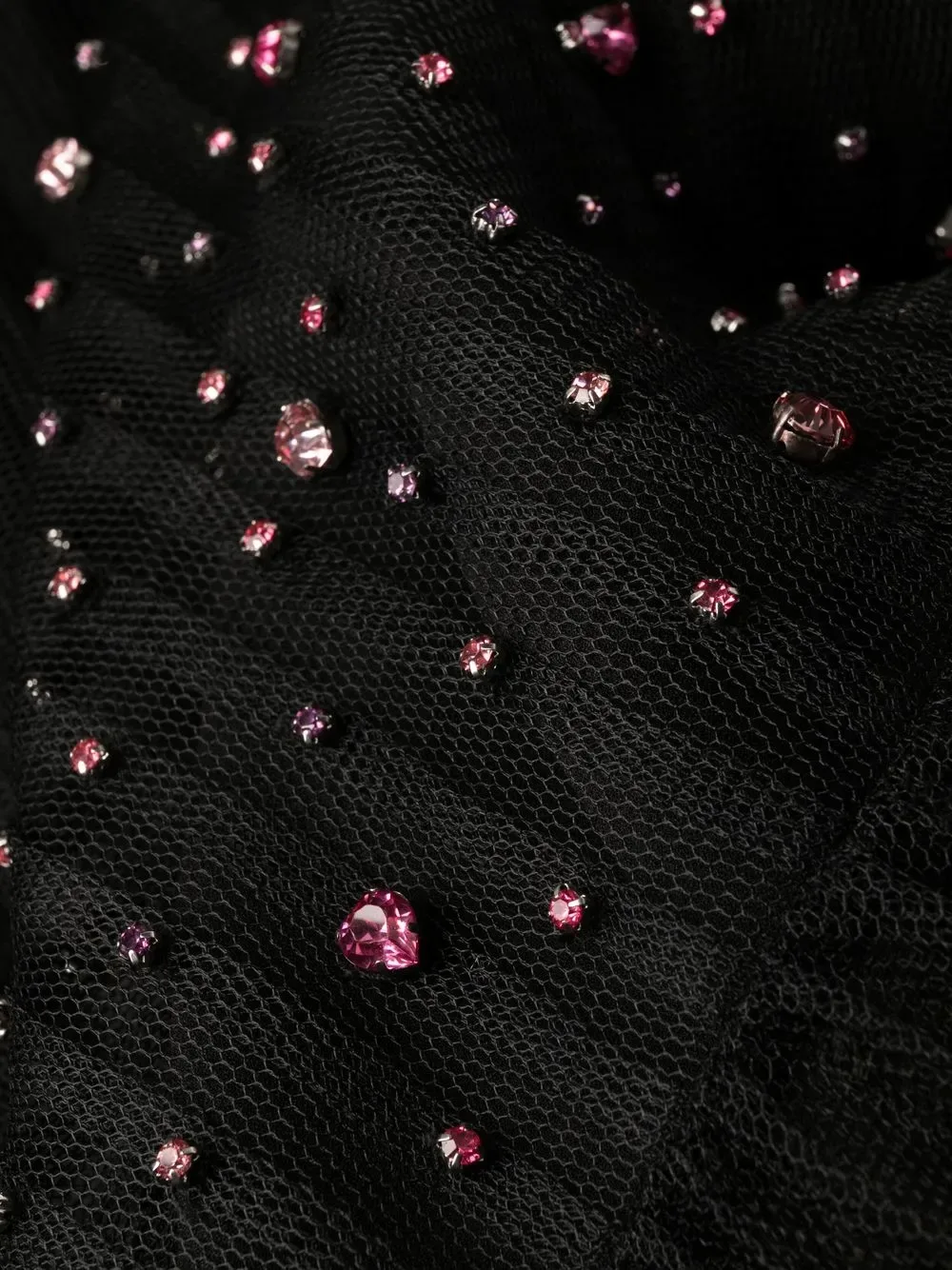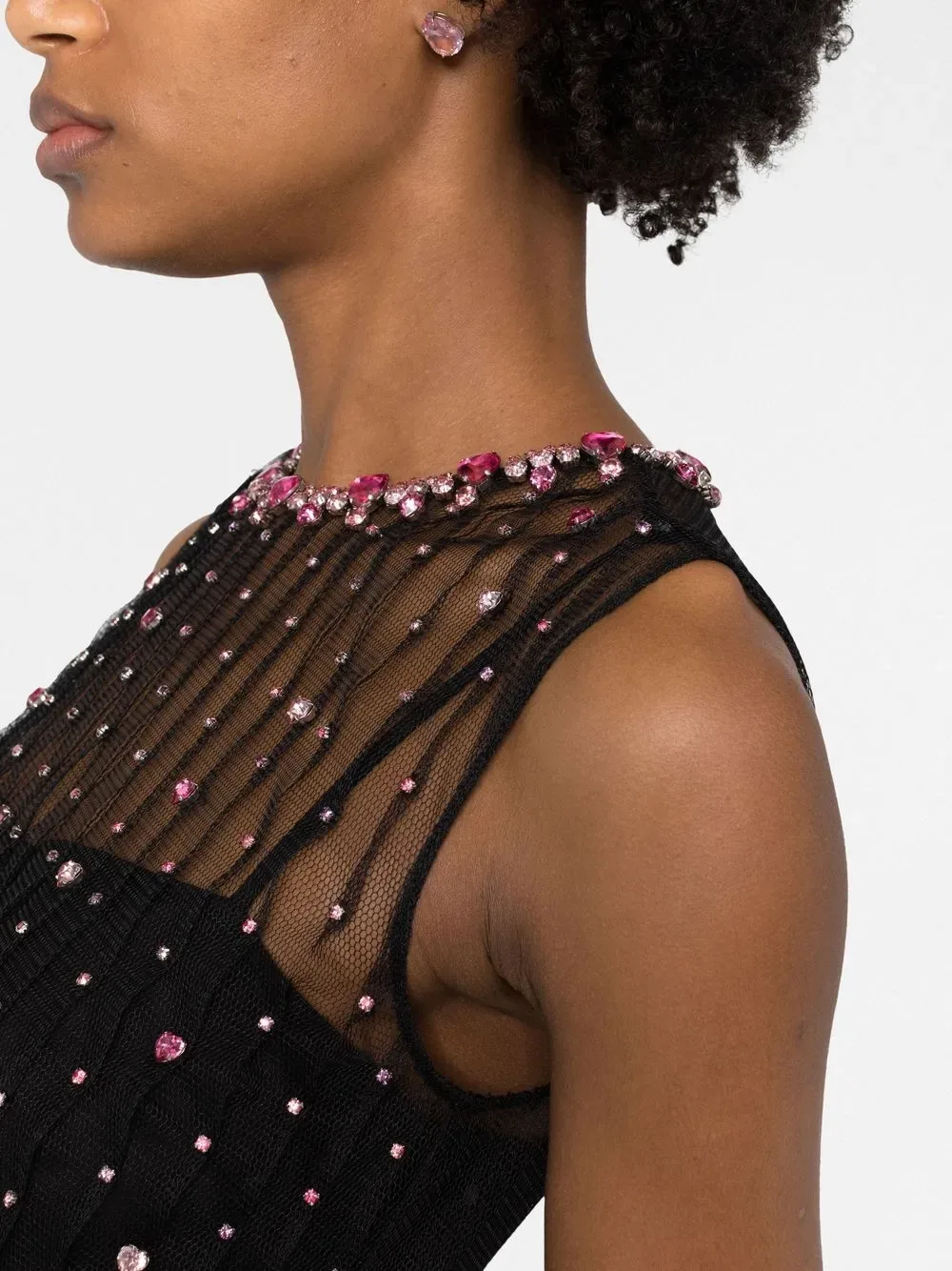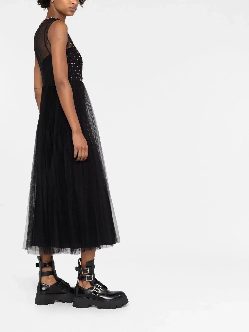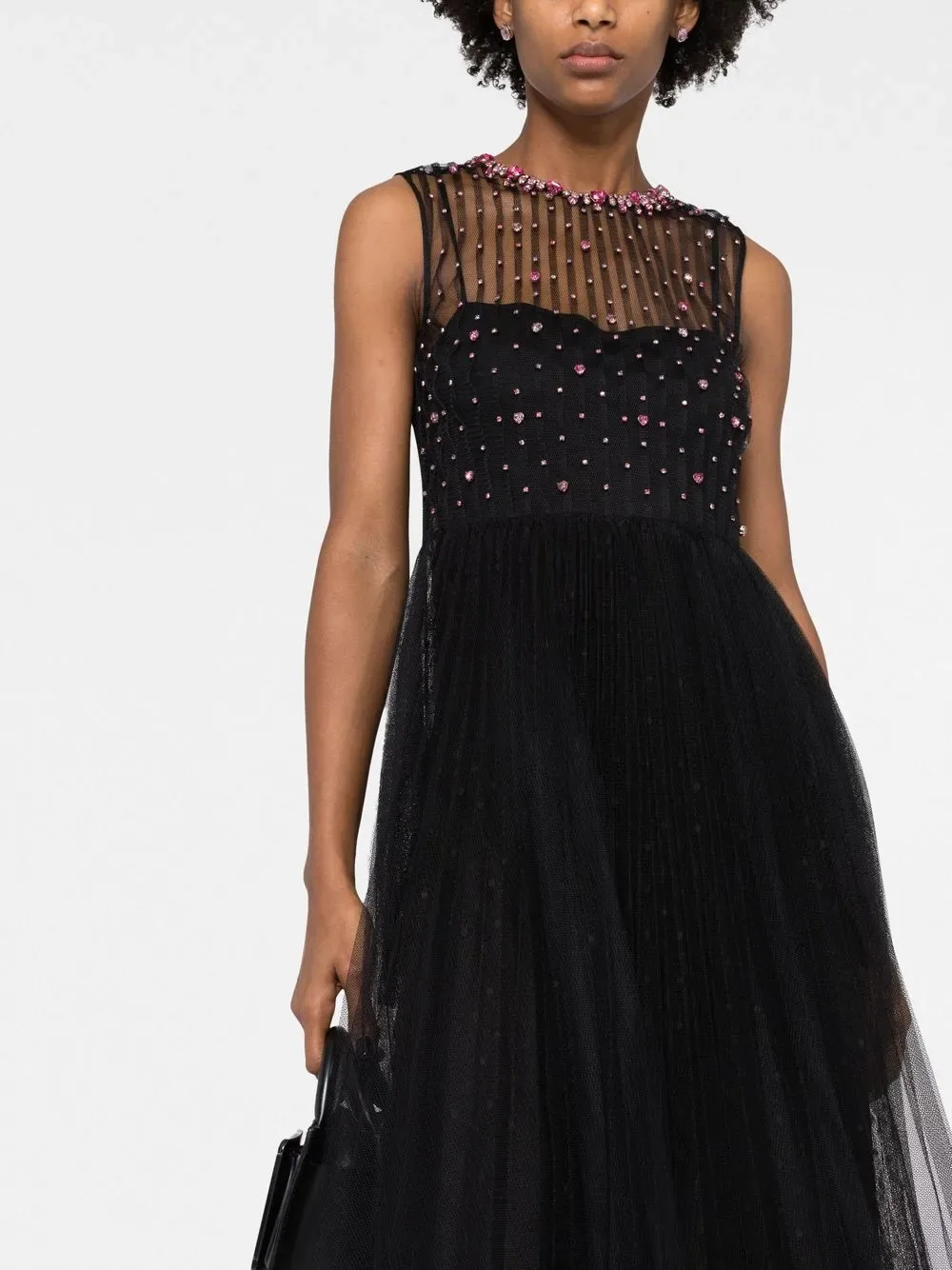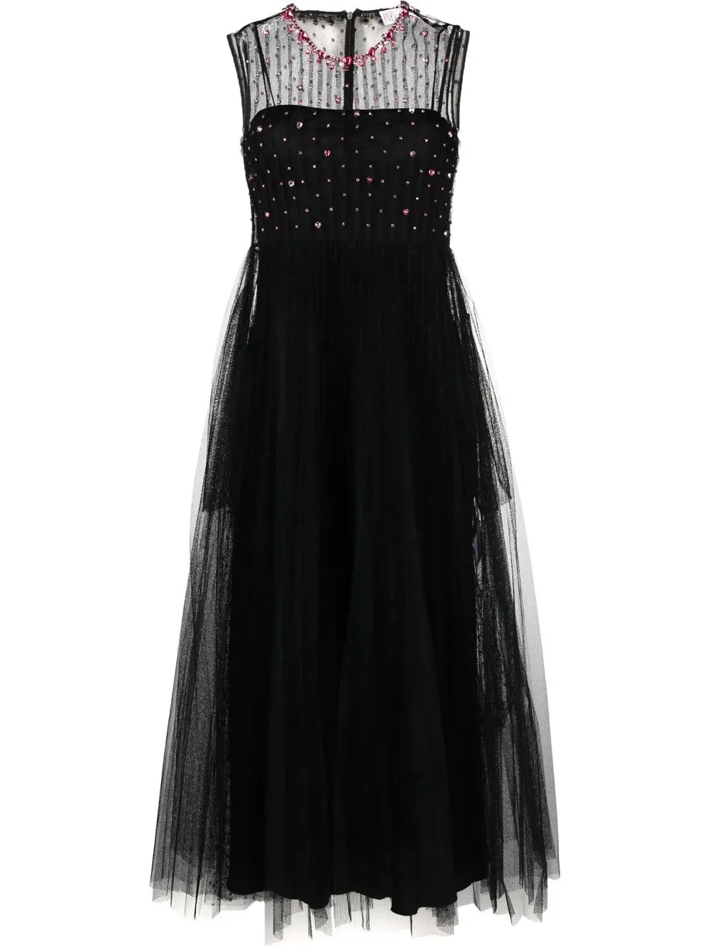 Черный, украшения из горного хрусталя, тюль пуэн-деспри, круглый вырез, без рукавов, застежка на молнии сзади и длина миди.