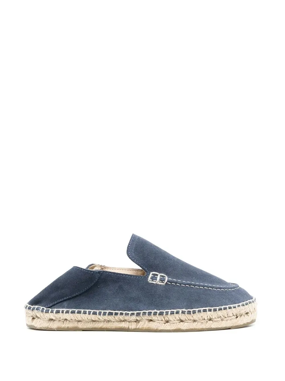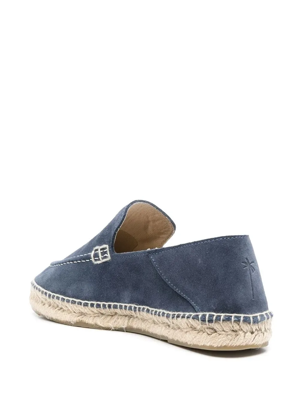 Синий, замша из телячьей кожи, декоративная строчка, стелька с логотипом, плетеная подошва из рафии, плоская резиновая подошва, модель без застежки и закругленный носок.
