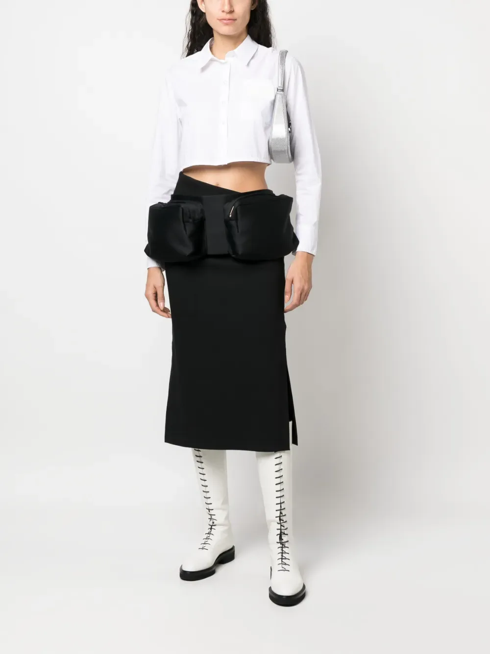 Черный, смесовая необработанная шерсть, вышитый логотип сзади, два кармана на молнии и прямой подол.