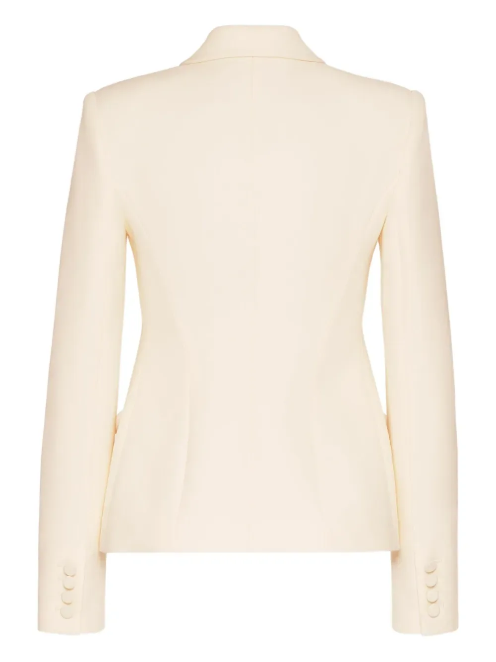 Коллекция Valentino Ready To Wear, кремово-белый, смесь необработанной шерсти и шелка, бант, зазубренные лацканы, застежка на пуговицах спереди, два прорезных кармана сбоку, длинные рукава, манжеты на пуговицах и прямой подол. Образ включает аксессуары Valentino Garavani.