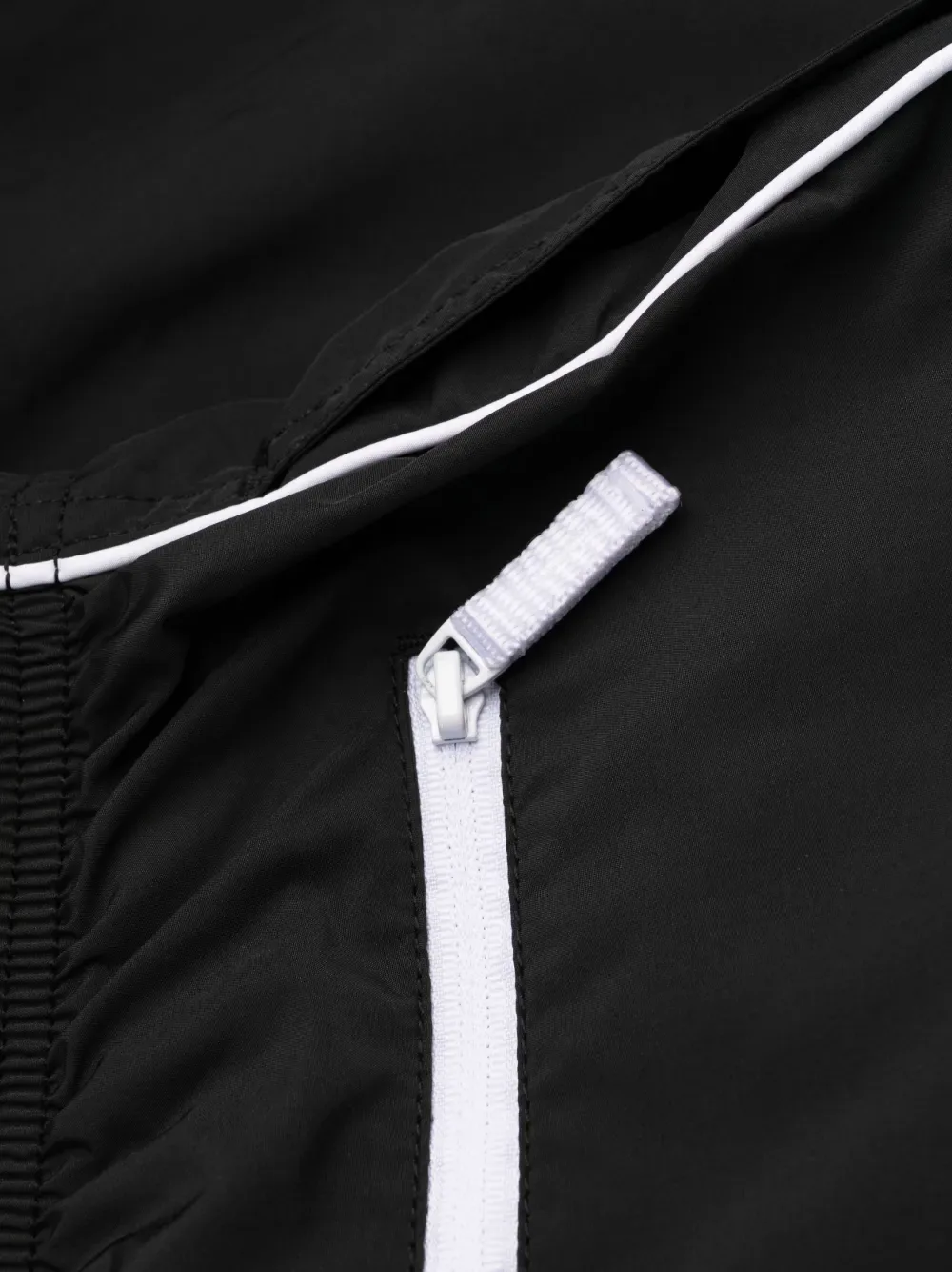 Черный/белый, эластичный материал, логотип, полоска сбоку, кулиска на талии, карман на молнии сзади и строчка в тон. Пожалуйста, примеряйте купальники и пляжные шорты только поверх собственного белья.