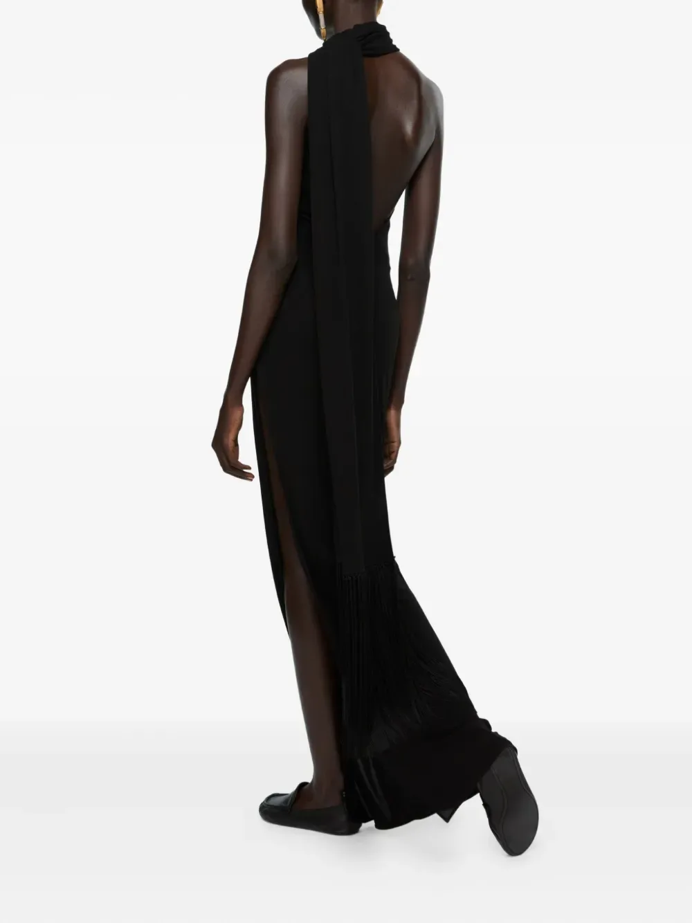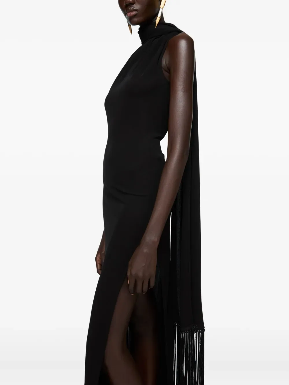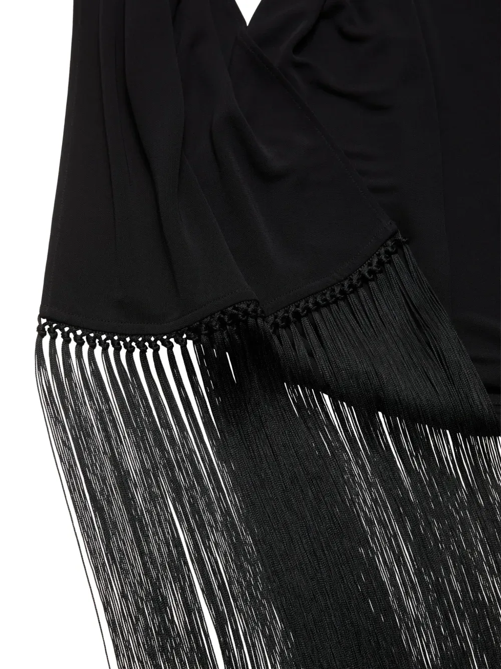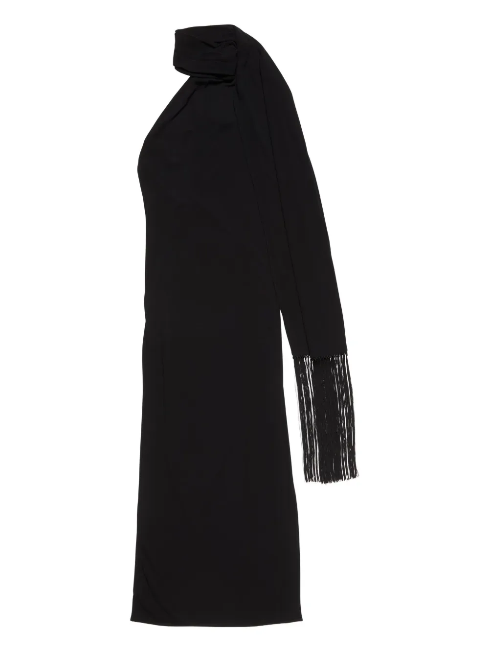 Черное платье на одно плечо с драпированным вырезом, длинным рукавом, отделкой бахромой и разрезом сбоку