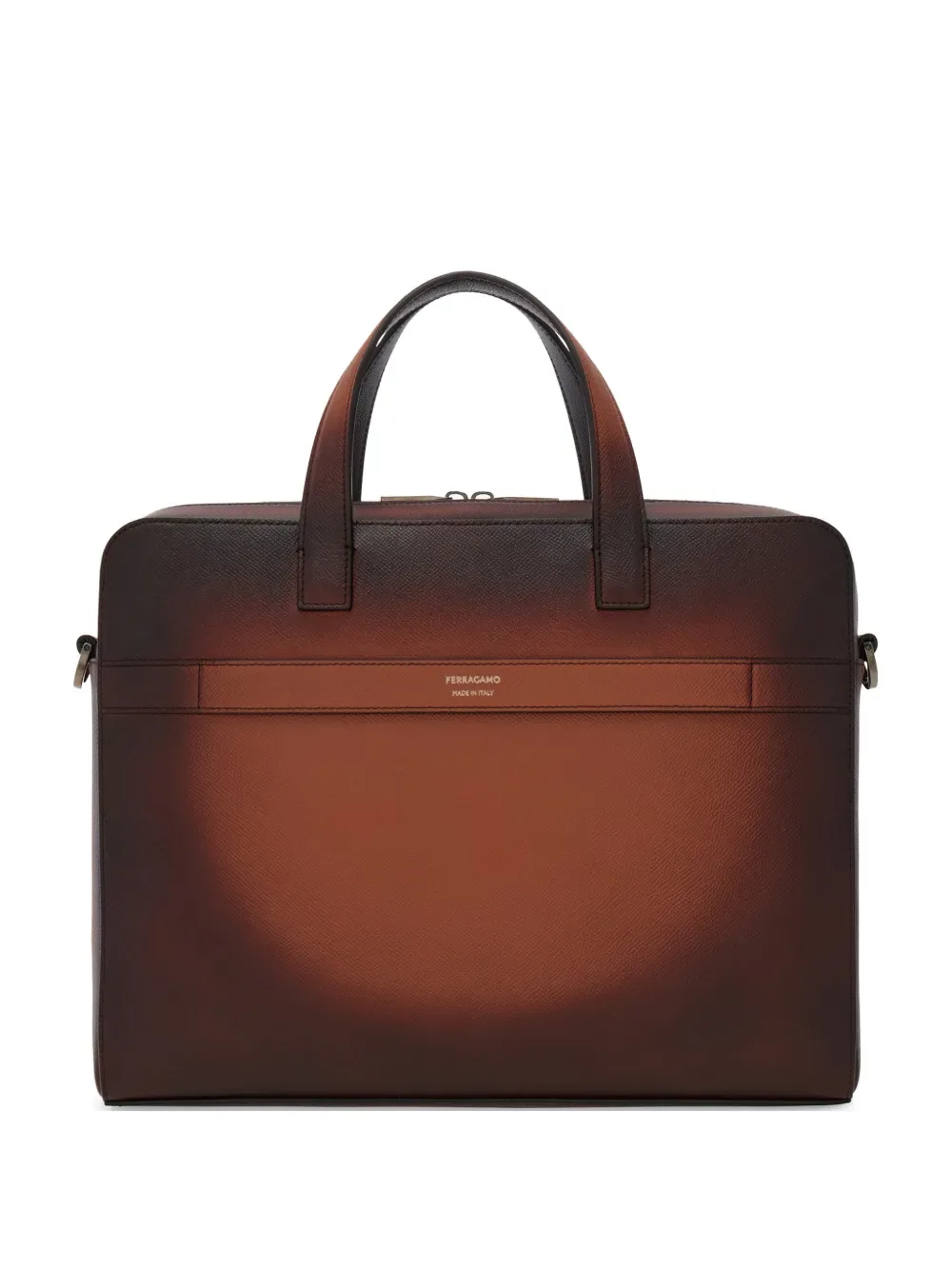 Современная элегантность. Эта новая папка Ferragamo из фактурной кожи с большой передней карманом на магнитной защелке украшена пряжками Gancio цвета рутения. Кожаные верхние ручки и съемный жаккардовый ремень подчеркивают ее практичный стиль. Коричневая, застежка-молния.