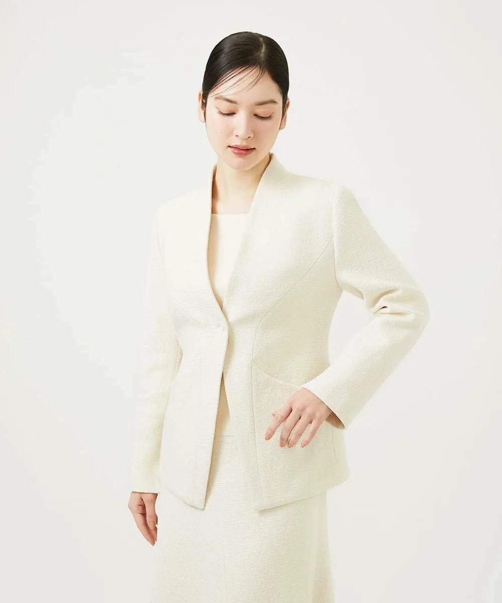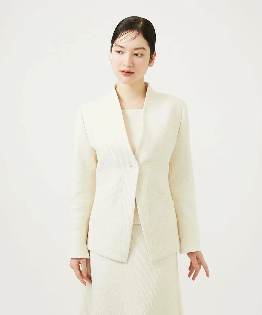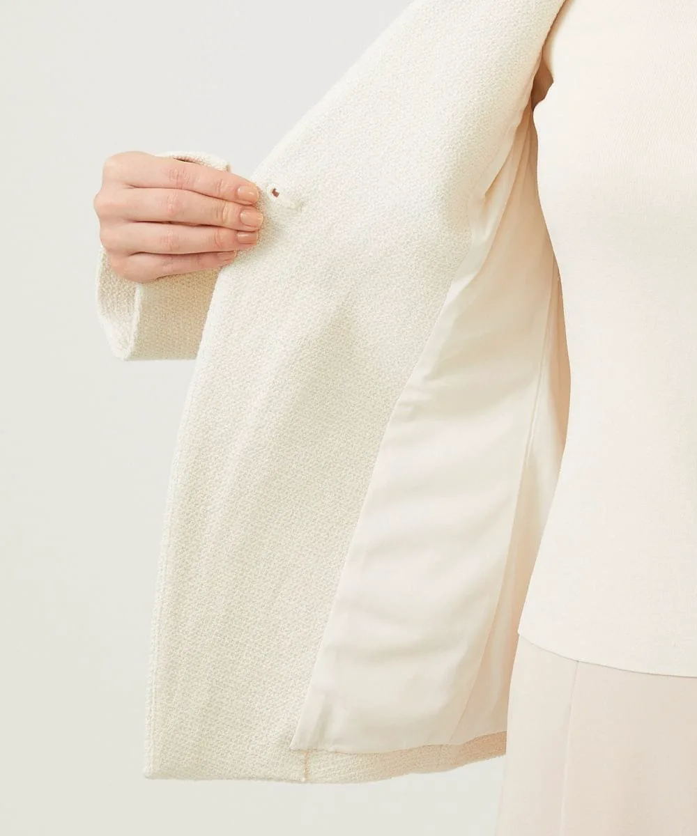 Жакет выполнен из выразительной букле-ткани и имеет четкий V-образный вырез, повторяющий форму шеи.