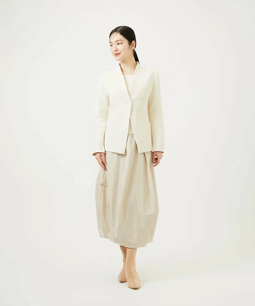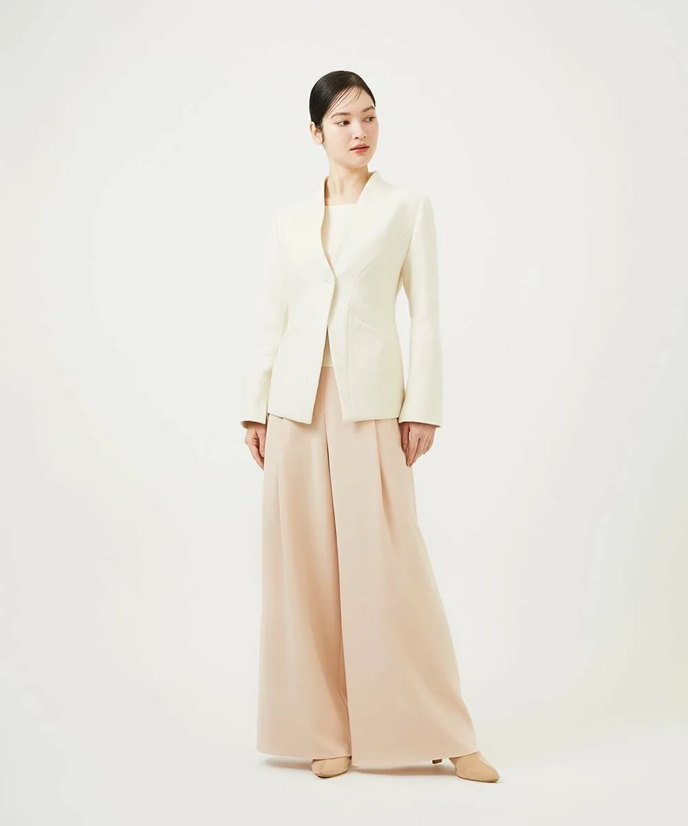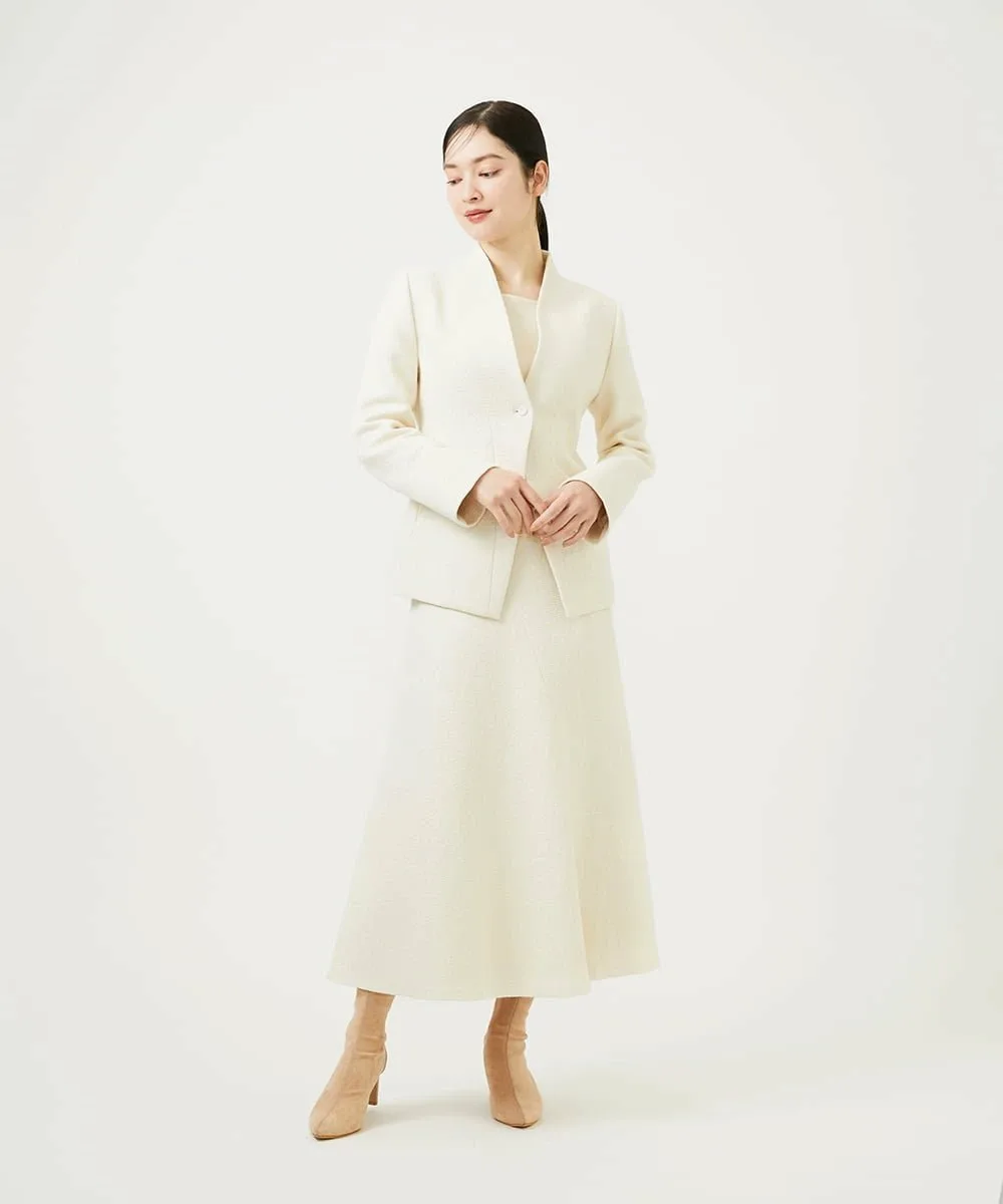 Жакет выполнен из выразительной букле-ткани и имеет четкий V-образный вырез, повторяющий форму шеи.