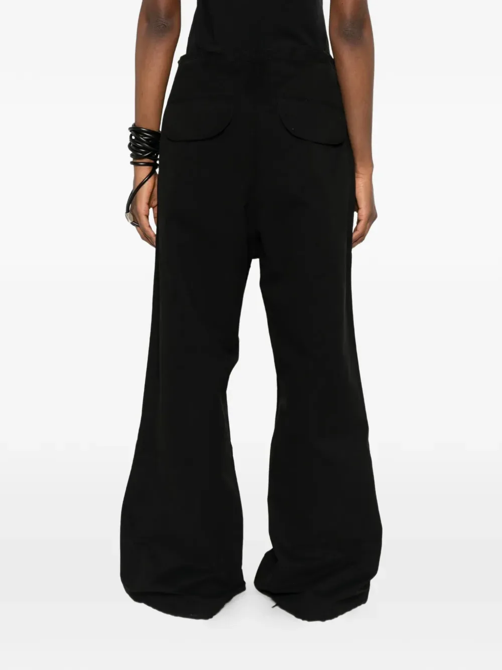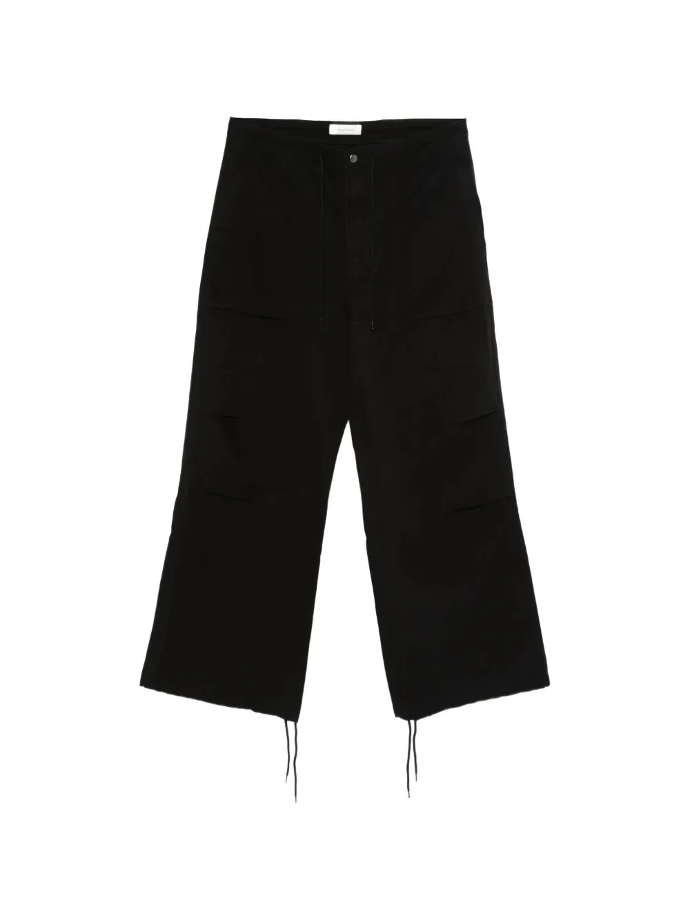 Черный цвет, шнурок для затяжки, застежка на пуговицы, множество карманов, задние карманы с клапанами, широкие брючины