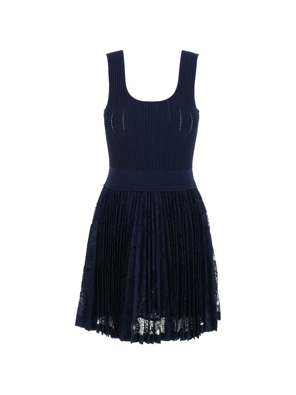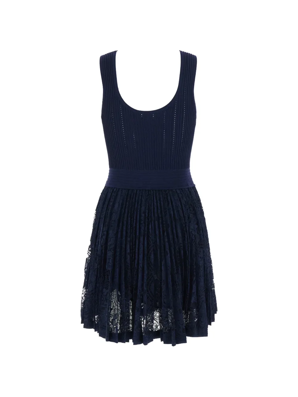 Синее платье без рукавов с кружевной отделкой, круглым вырезом и плиссированной юбкой