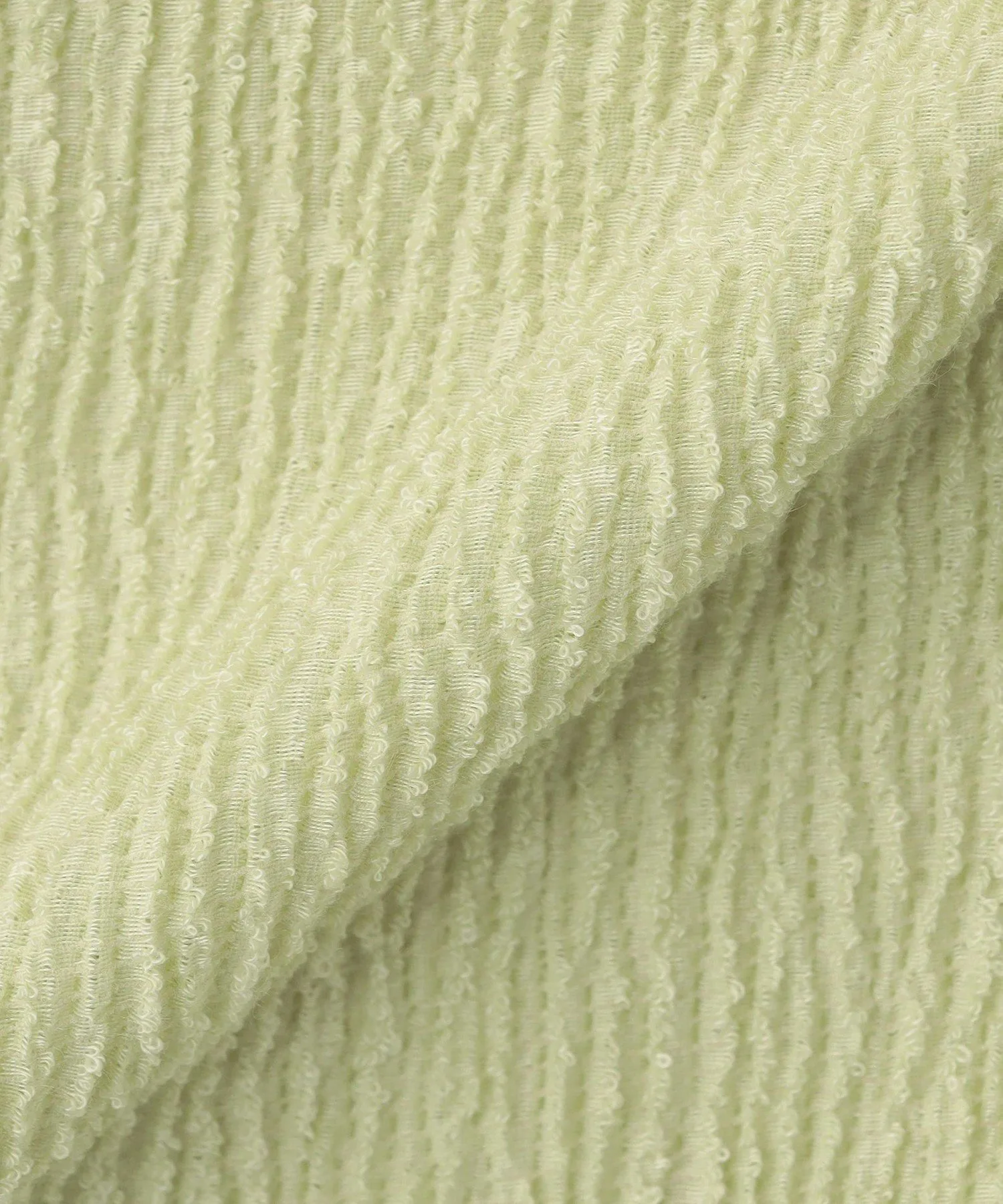 Пряжа букле тщательно вяжется на специальной вязальной машине, создавая пушистую текстуру.