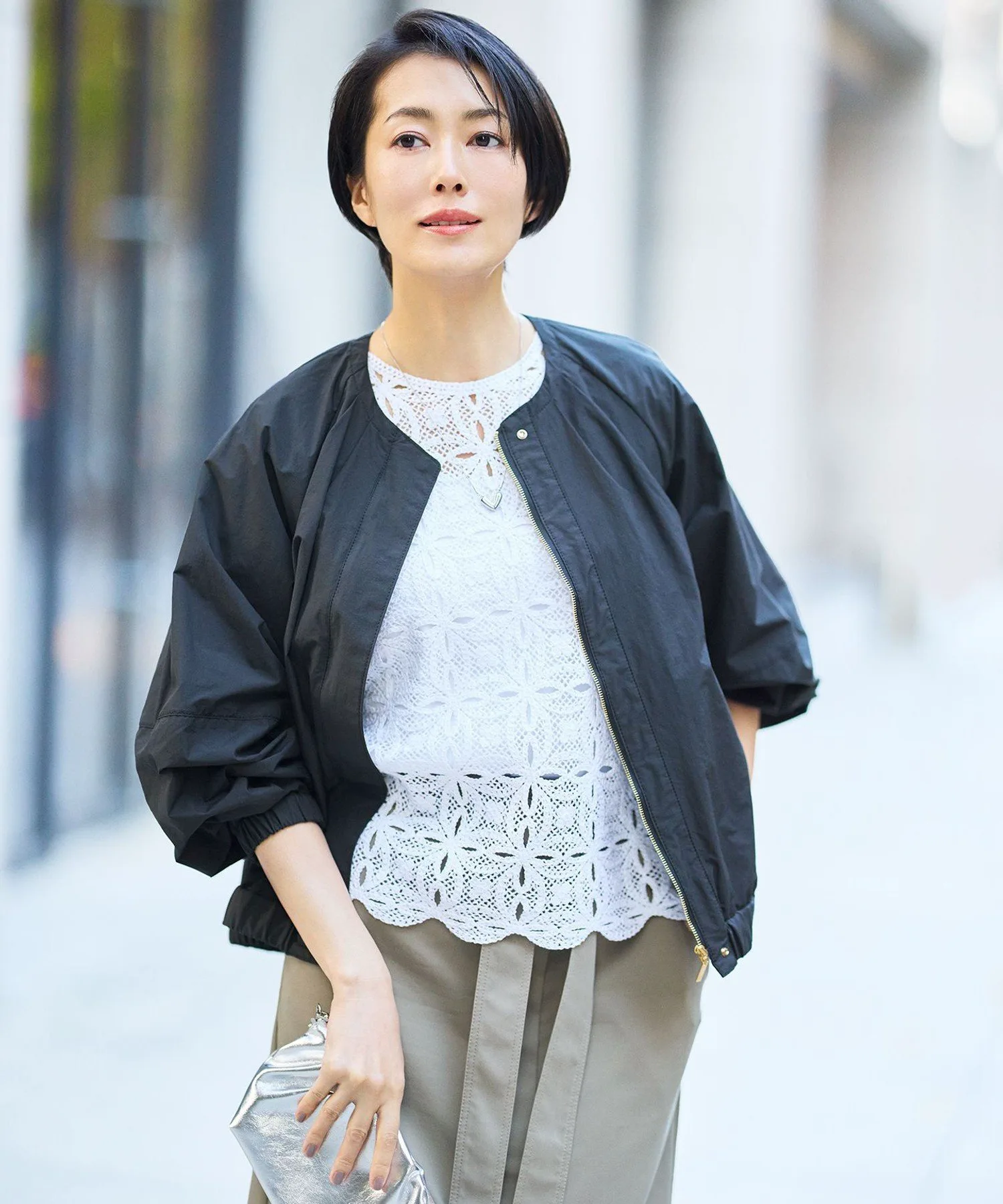 Прозрачная, удобная в носке блузон. Дизайн: Этот блузон без воротника отличается эффектными рукавами-бочонками. Сборки на вырезе и шнурок добавляют элегантности. Сборки по низу создают силуэт с умеренной округлостью и объемностью. Передний и задний края подола немного отличаются, что обеспечивает ощущение легкости и естественное прикрытие бедер. Эластичные манжеты со сборками позволяют создать расслабленный образ, если их подвернуть. Изготовленный из легкого, слегка прозрачного материала, этот блузон станет универсальным изделием на долгие годы. Материал: Этот поплин изготовлен из плотного плетения тонких нейлоновых и хлопковых нитей. Смесь хлопка придает ему естественную текстуру, несмотря на то, что это материал для верхней одежды. Обработка «воздушной стиркой» создает естественную мягкость и текстуру, сочетая эластичность с необходимой степенью упругости. *Изображение является образцом, поэтому характеристики, обработка и размер могут немного отличаться от фактического продукта. Обратите внимание. *Из-за условий съемки цвет может отличаться от фактического продукта. Рост: 170 см, Обхват груди: 76 см, Обхват талии: 58 см, Обхват бедер: 88 см.