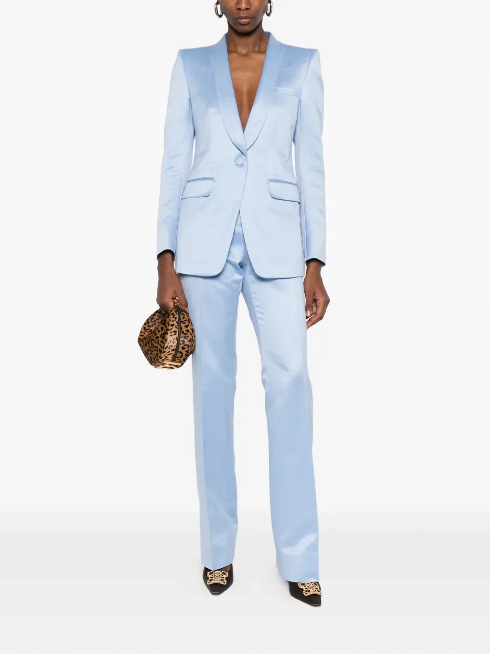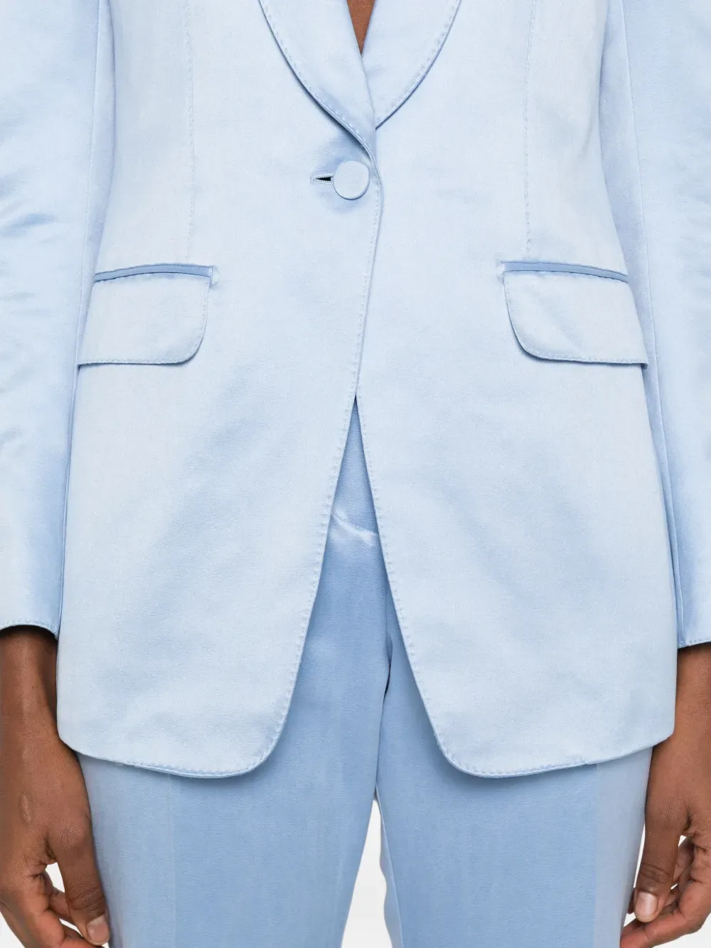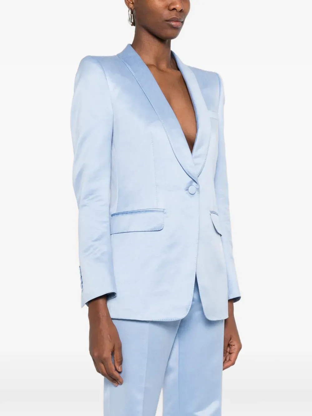 Светло-голубые лацканы шалька, застежка на пуговицы спереди, манжеты на пуговицах, клапанные карманы, нагрудный карман