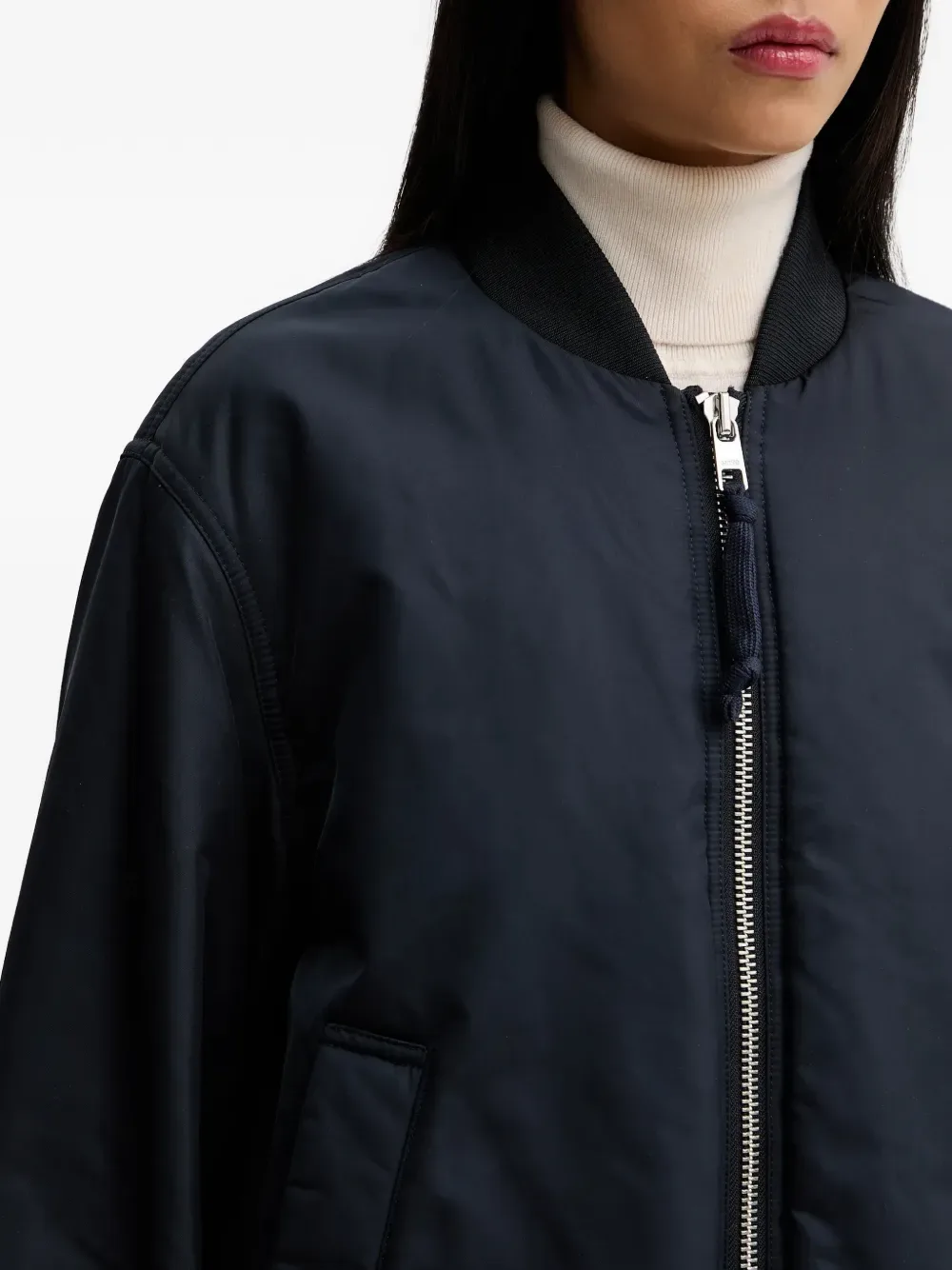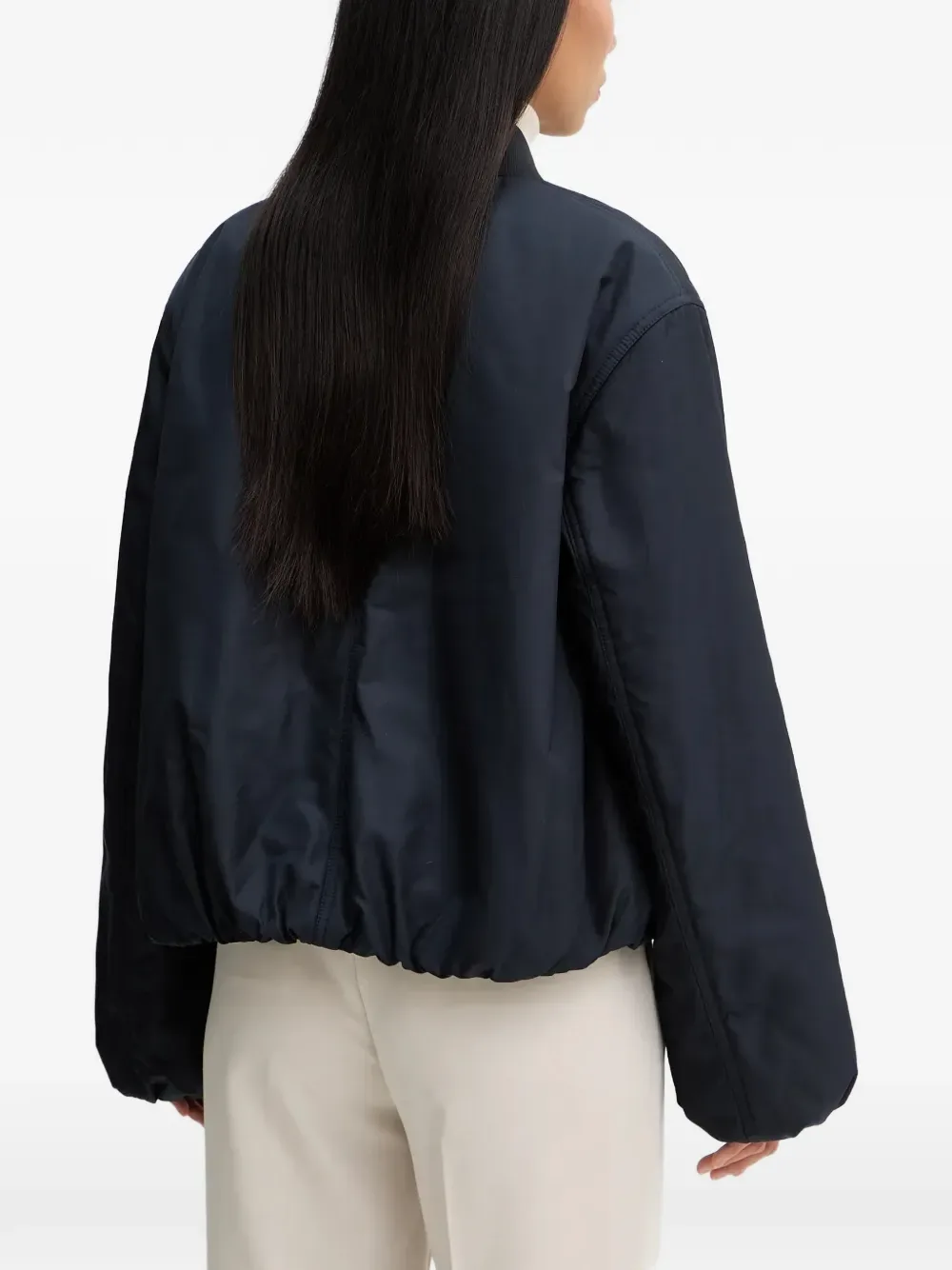Темно-синий цвет, застежка-молния, воротник-бомбер, боковые карманы, эластичный нижний край, длинные рукава
