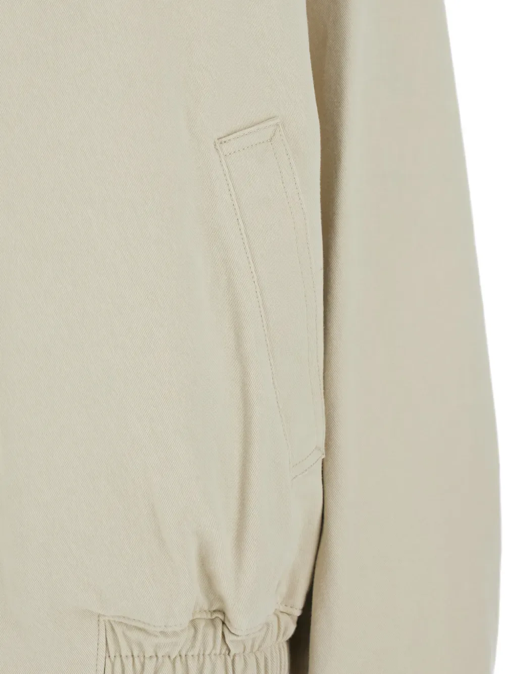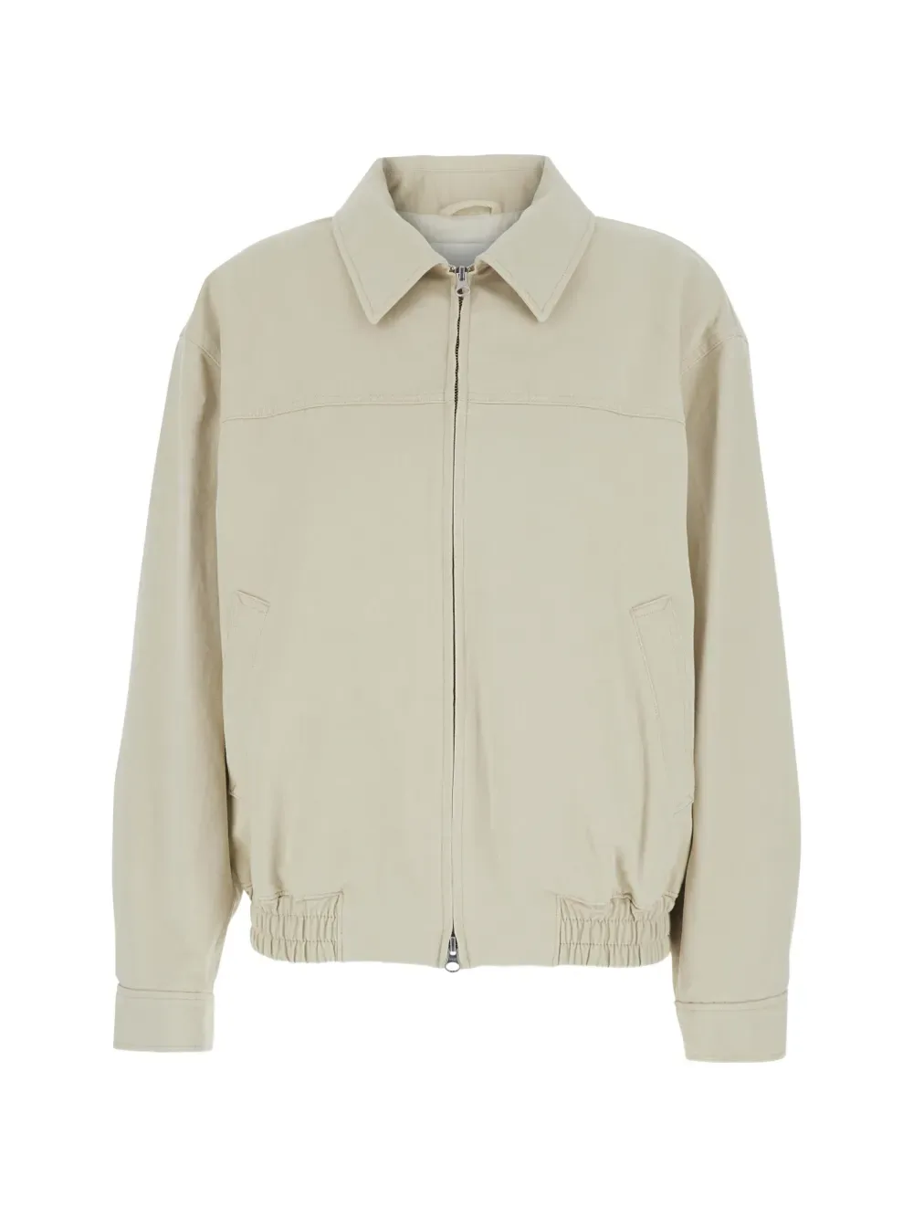 Бежевый цвет, воротник с острыми концами, застежка-молния спереди, длинные рукава, манжеты на пуговицах, эластичный низ