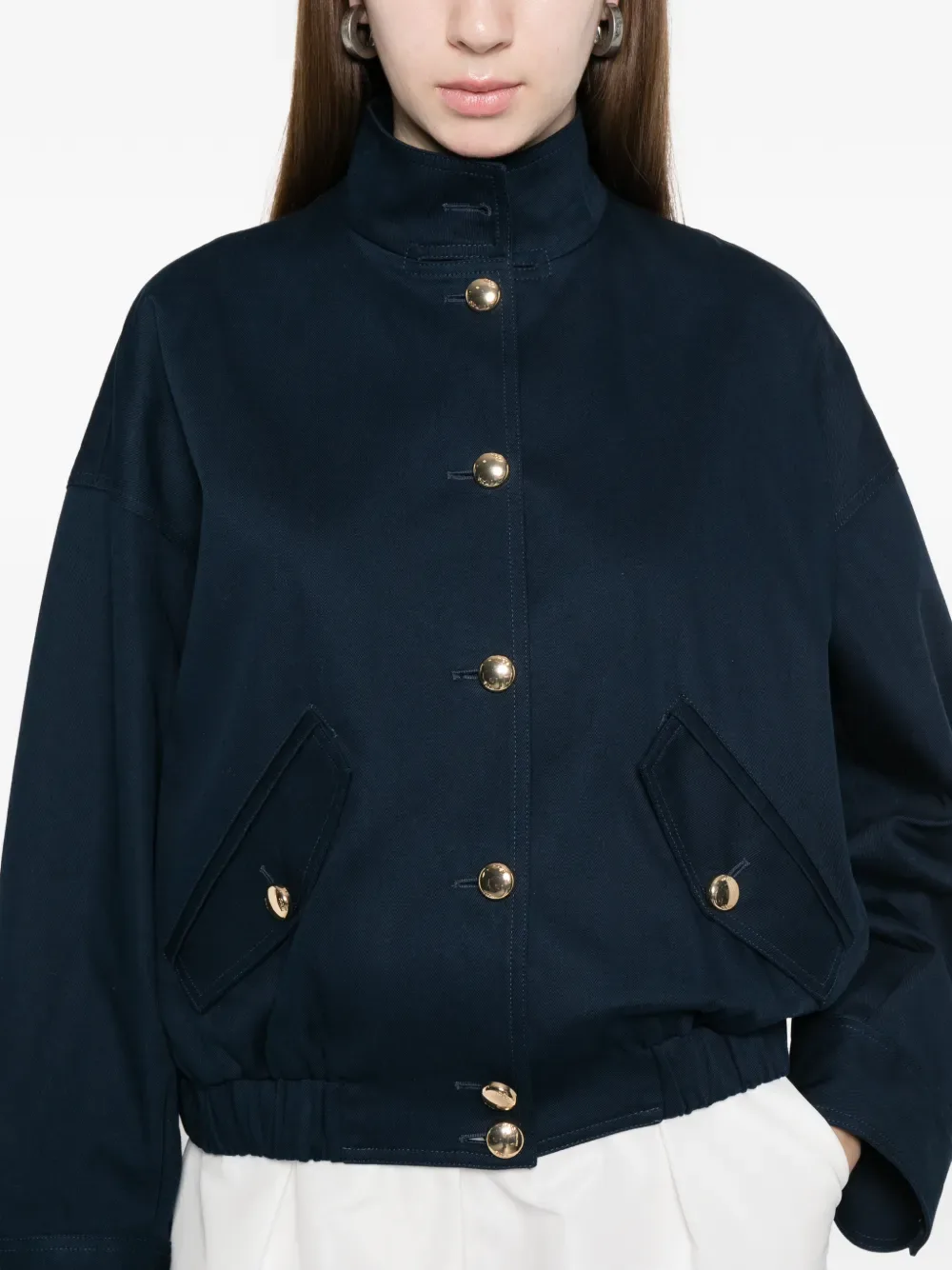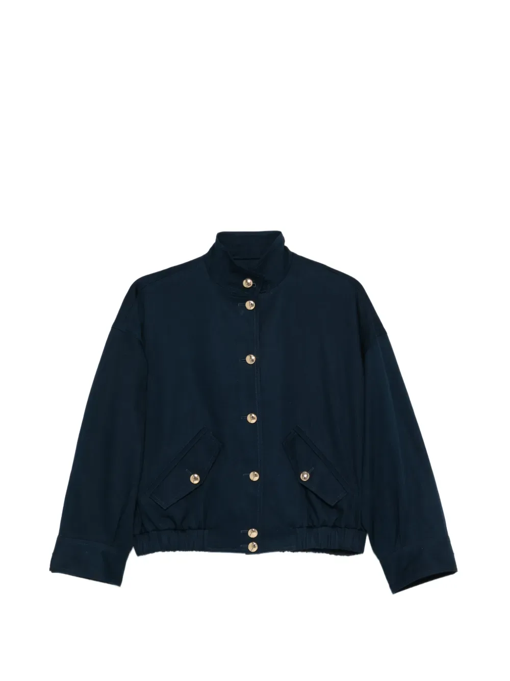 Темно-синий, золотистые пуговицы, накладные карманы спереди, эластичный нижний край