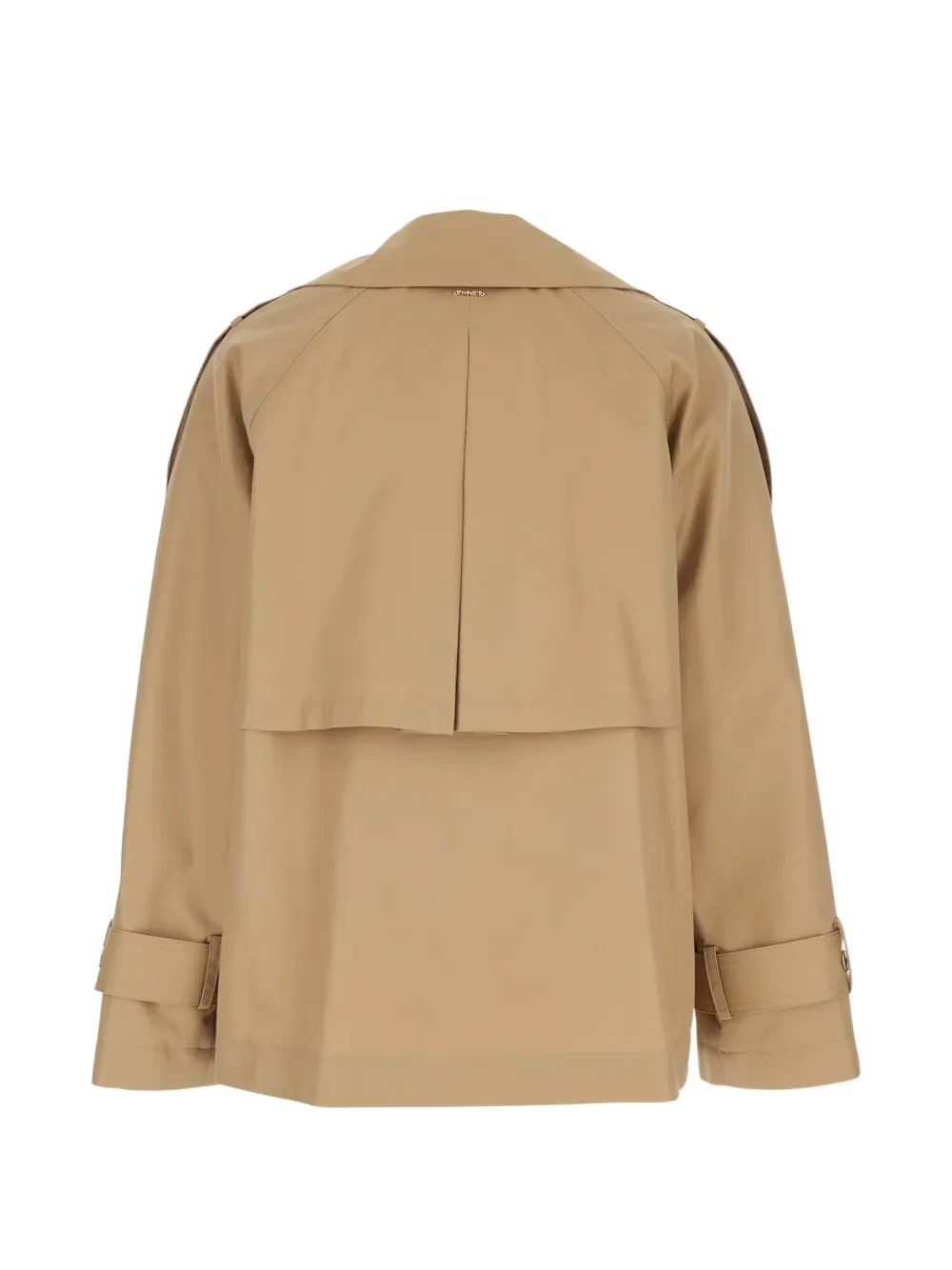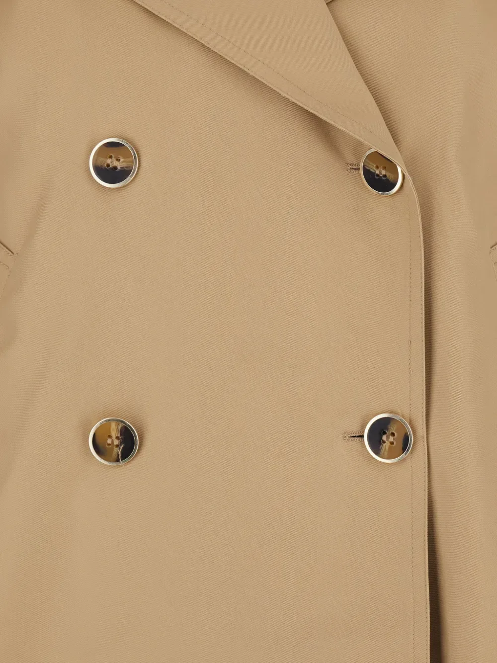 Бежевый двубортный пиджак, застегивается на пуговицы, с эполетами, лацканами с вырезом, манжеты с декоративными хлястиками