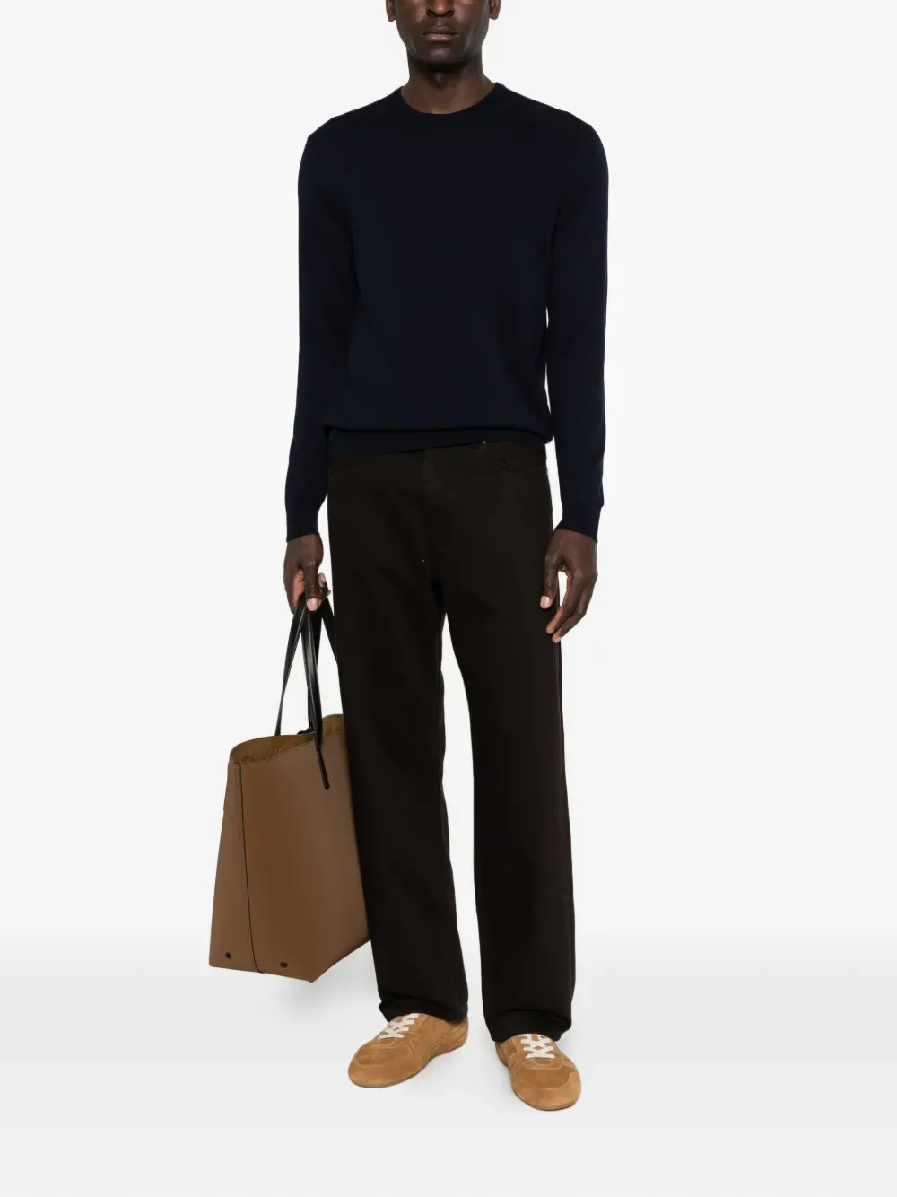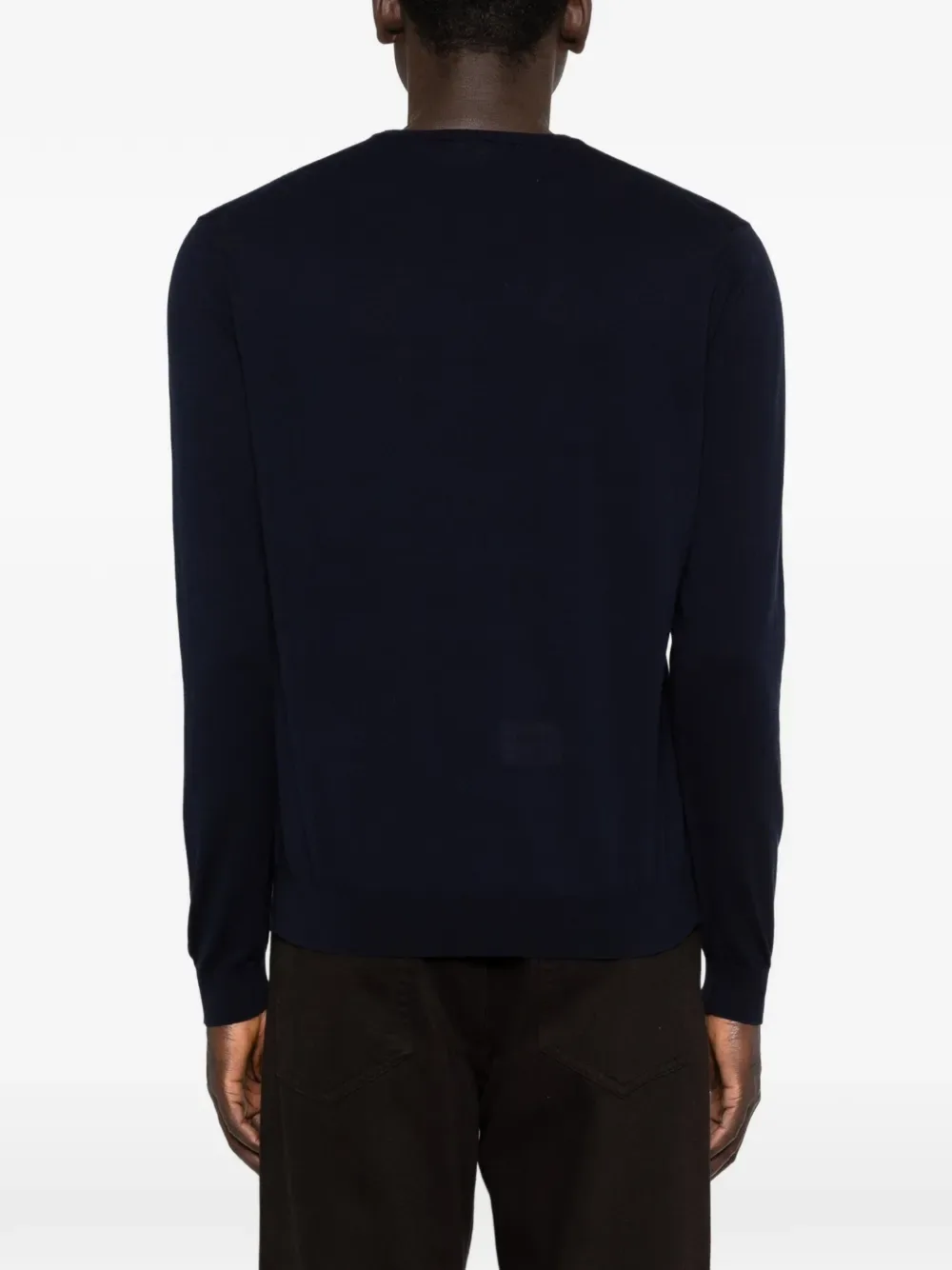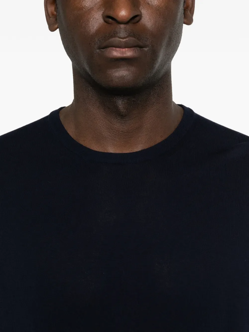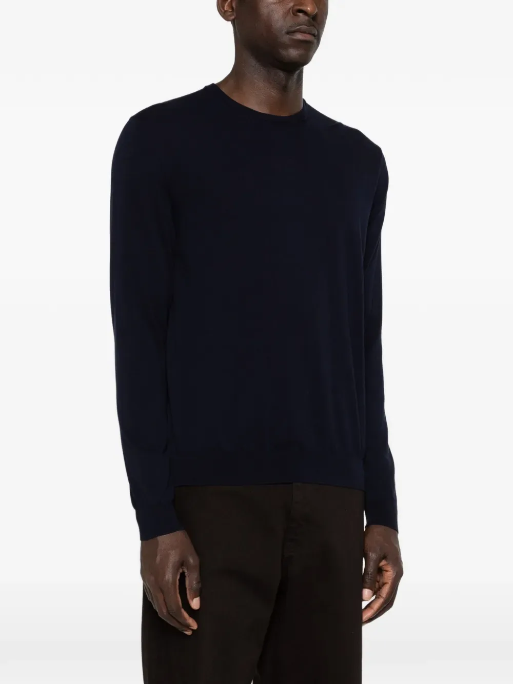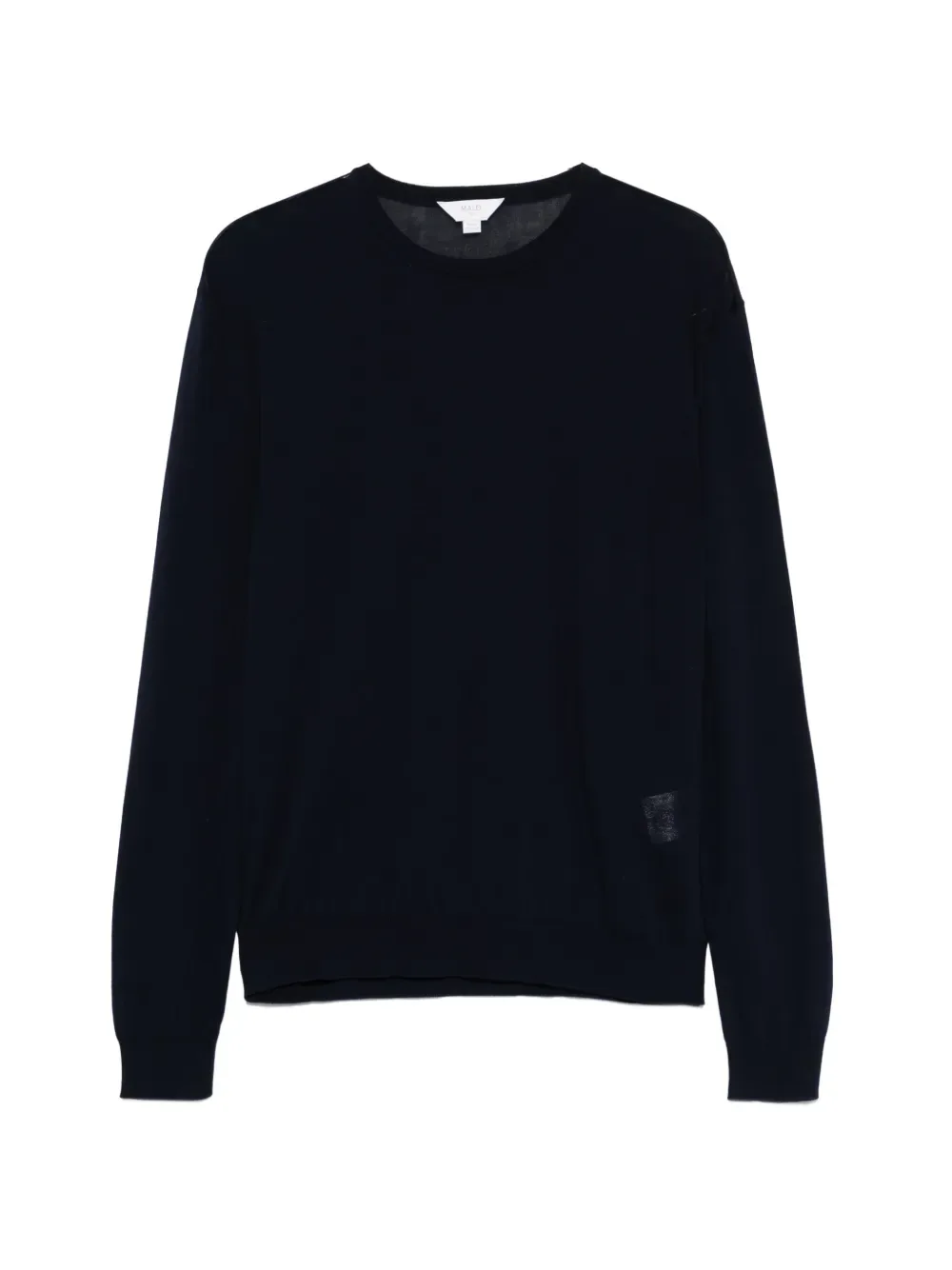 Синий свитер с круглым вырезом, полупрозрачной отделкой, длинными рукавами, ребристыми манжетами и прямым подолом
