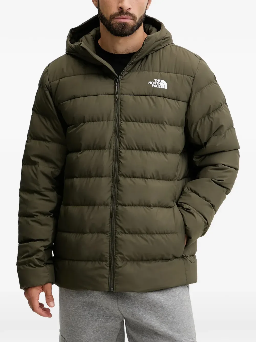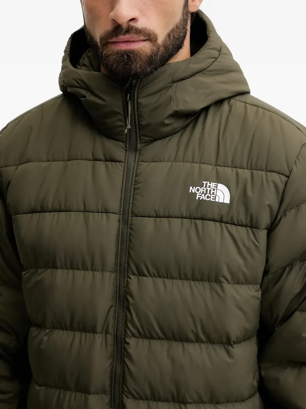 Оливково-зеленая куртка с капюшоном, застежкой-молнией, стеганым дизайном и принтом-логотипом