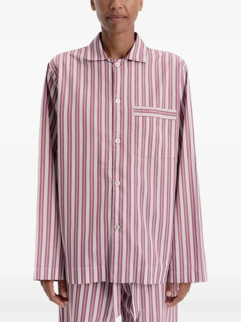 Рисунок в полоску цвета ревеня, нагрудный карман, длинные рукава, застежка на пуговицы спереди, стандартный крой