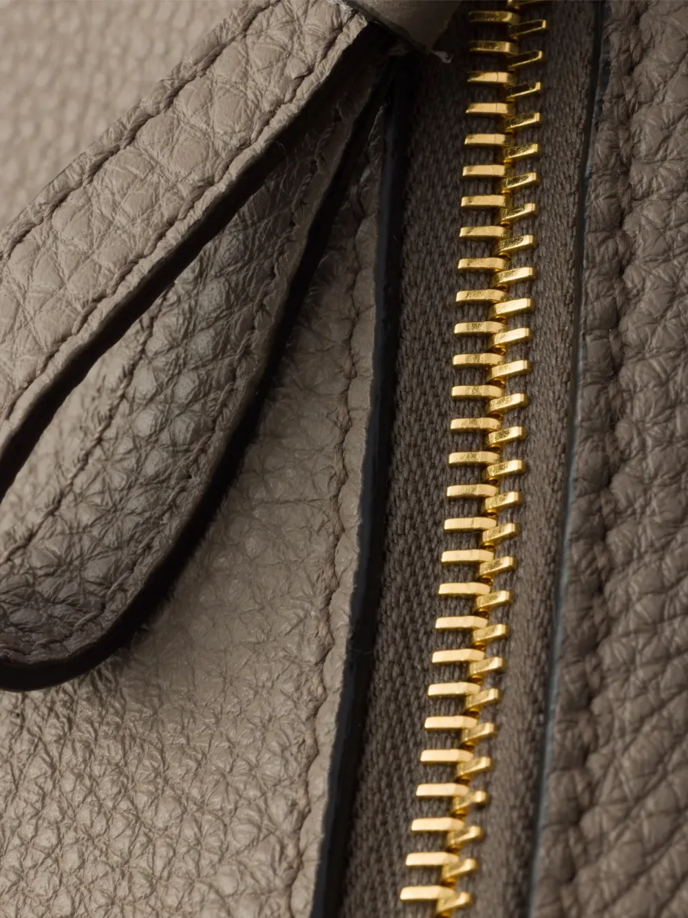 Серый, фурнитура цвета золота, съемный регулируемый плечевой ремень, верхняя ручка, задний карман на молнии, логотип с надписью спереди