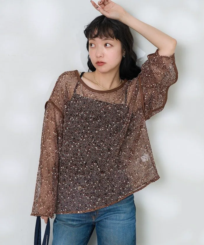 ●Сетчатый пуловер с богатым сочетанием цветов и вкраплений