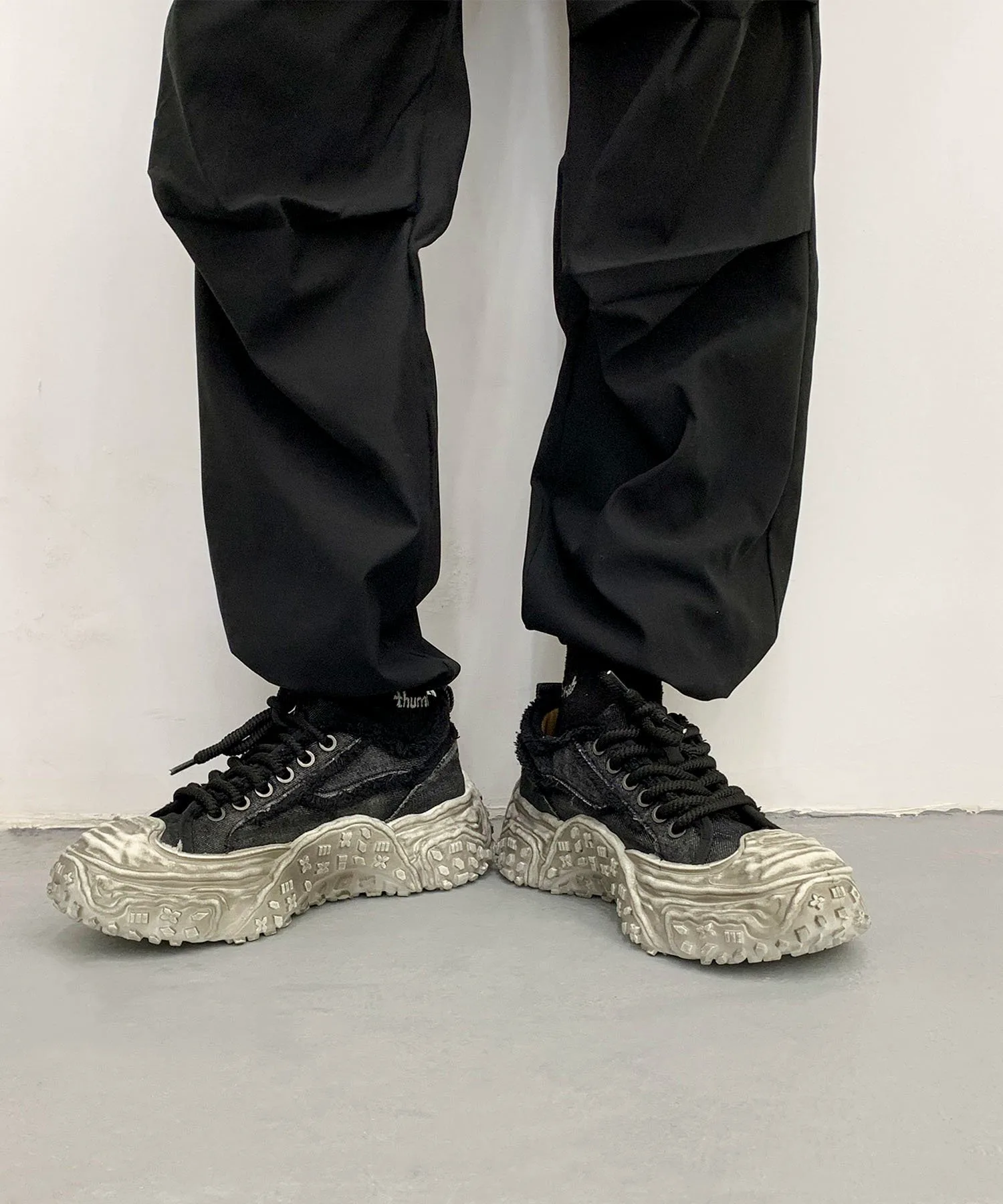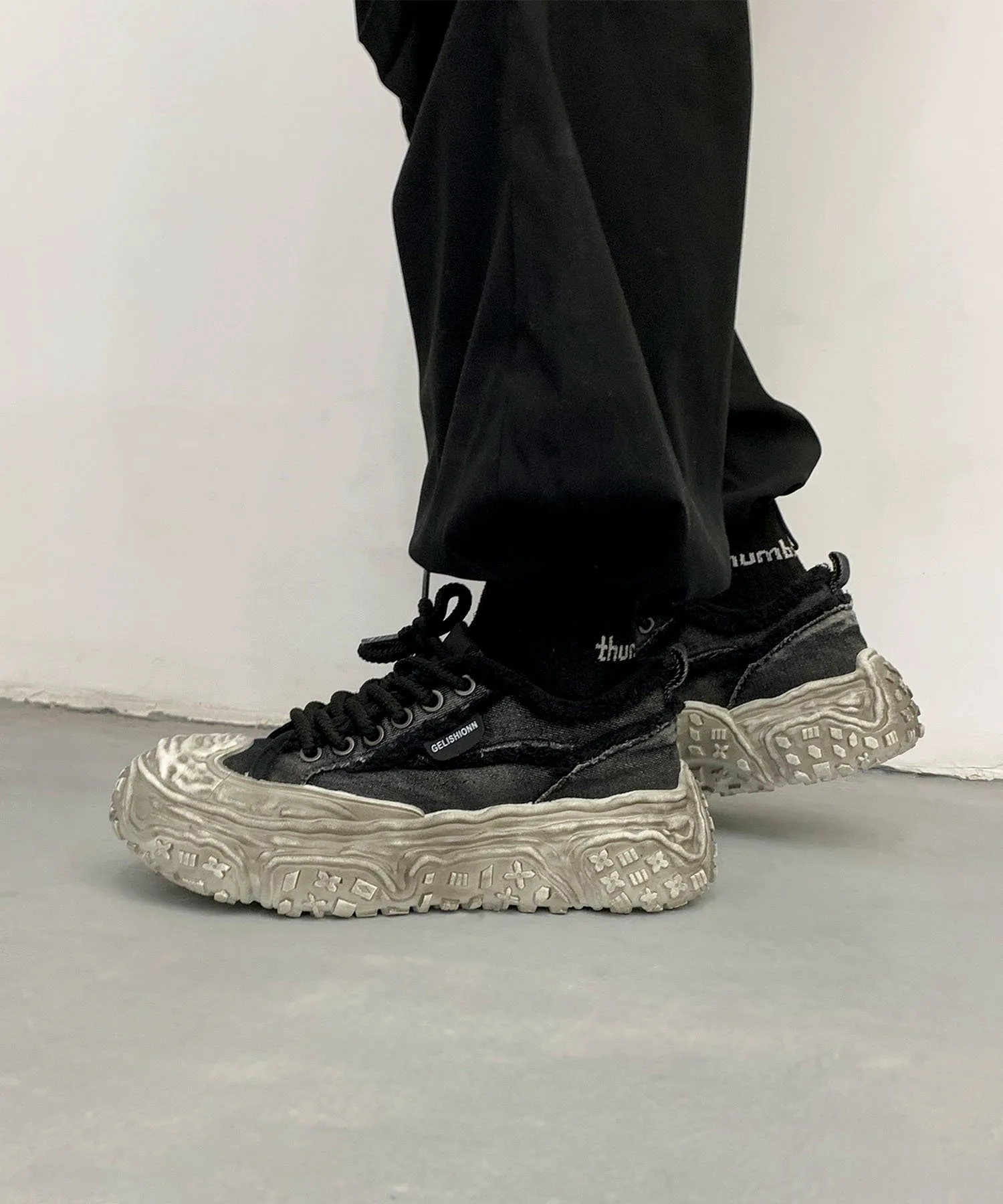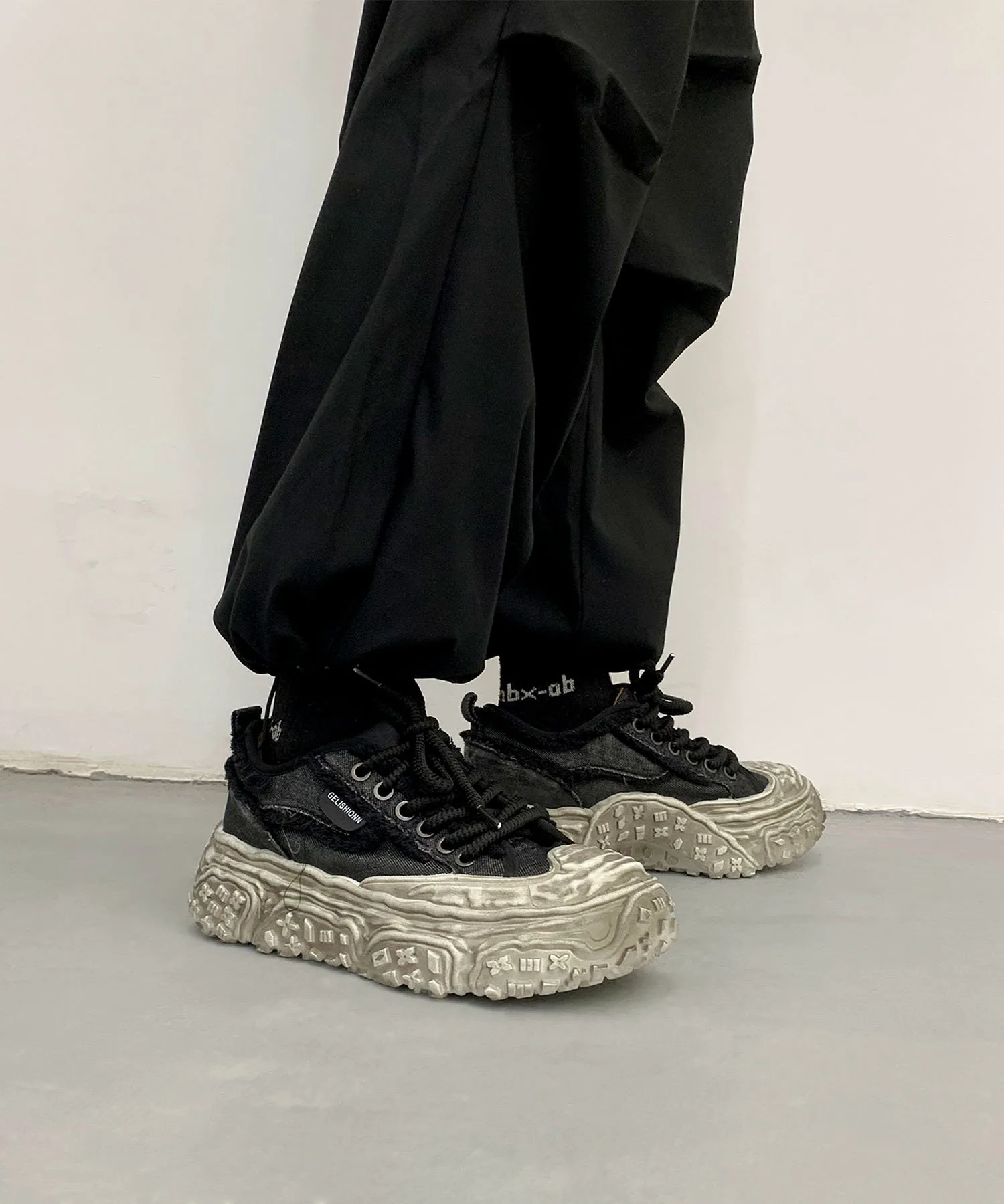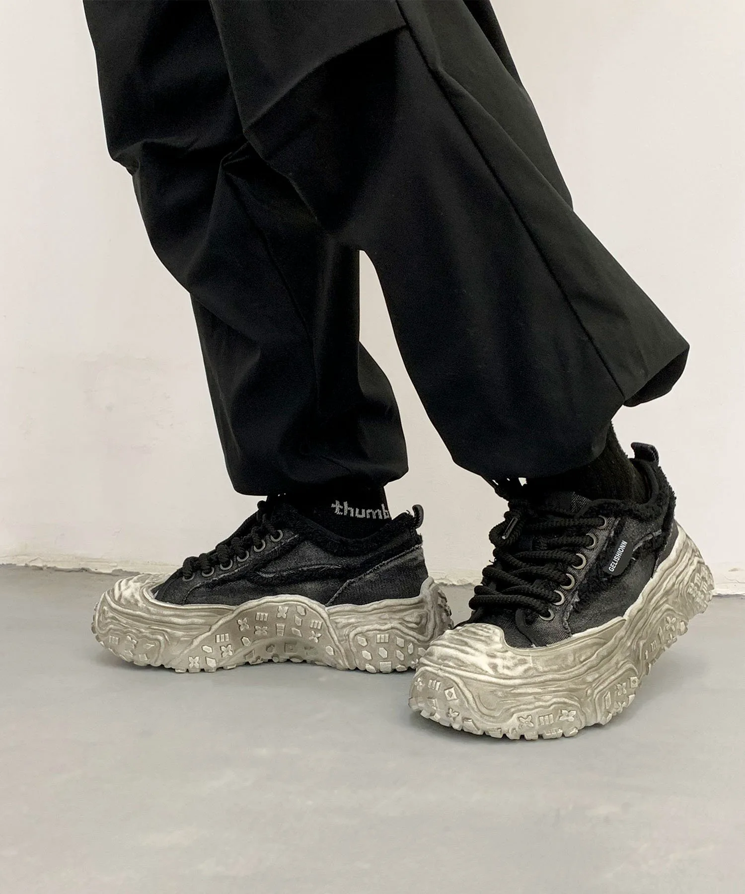 Пара джинсовых кроссовок на платформе с эффектом потертости, которые привлекут ваше внимание своим уникальным дизайном.